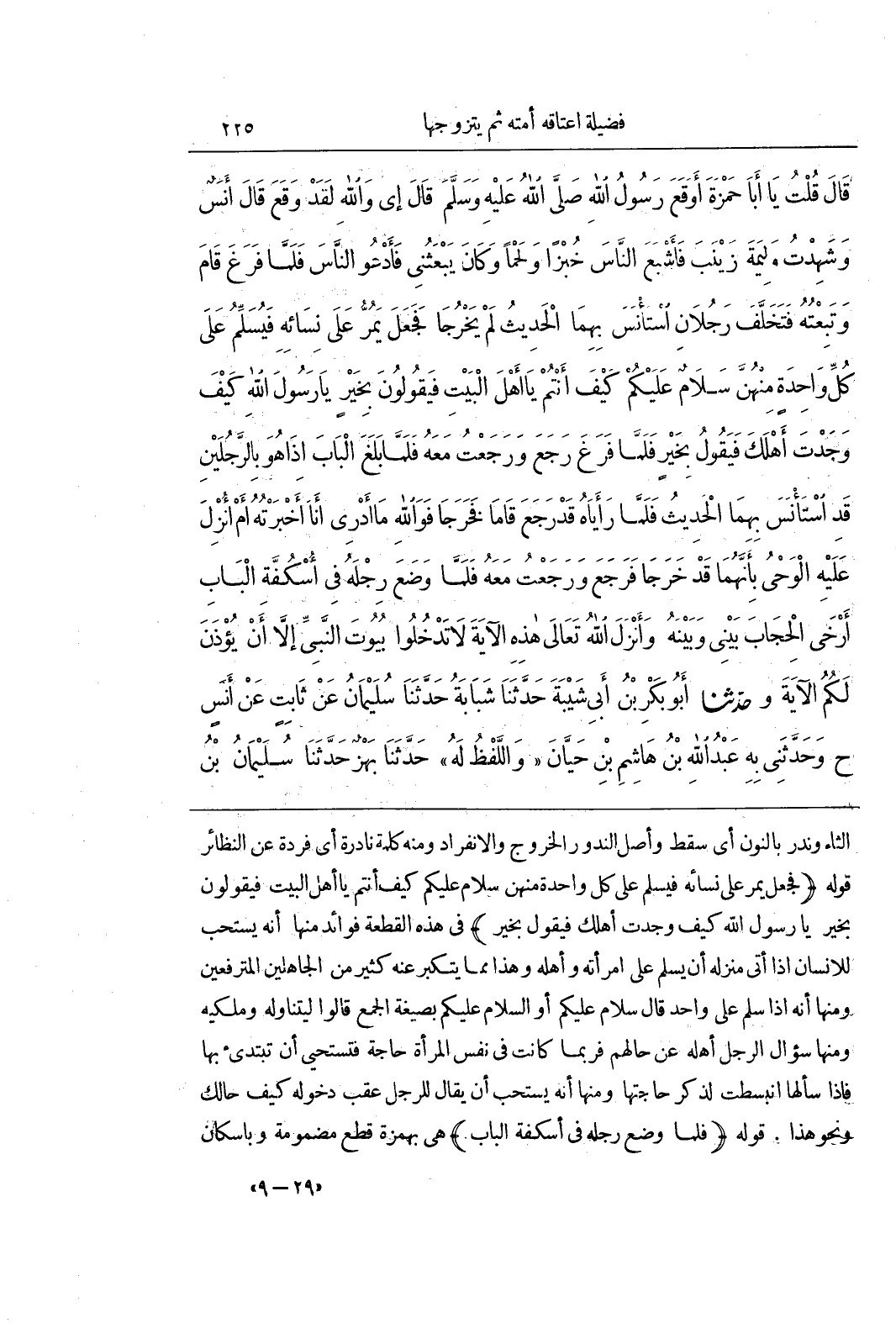 [1428] قَوْلُهُ (فَجَعَلَ يَمُرُّ عَلَى نِسَائِهِ فَيُسَلِّمُ عَلَى كُلِّ وَاحِدَةٍ مِنْهُنَّ سَلَامٌ عَلَيْكُمْ كَيْفَ أَنْتُمْ يَا أَهْلَ الْبَيْتِ فَيَقُولُونَ بِخَيْرٍ يَا رَسُولَ اللَّهِ كَيْفَ وَجَدْتَ أَهْلَكَ فَيَقُولُ بِخَيْرٍ) فِي هَذِهِ الْقِطْعَةِ فَوَائِدُ مِنْهَا أَنَّهُ يُسْتَحَبُّ لِلْإِنْسَانِ إِذَا أَتَى مَنْزِلَهُ أَنْ يُسَلِّمَ عَلَى امْرَأَتِهِ وَأَهْلِهِ وَهَذَا مِمَّا يَتَكَبَّرُ عَنْهُ كَثِيرٌ مِنَ الْجَاهِلِينَ الْمُتَرَفِّعِينَ وَمِنْهَا أَنَّهُ إِذَا سَلَّمَ عَلَى وَاحِدٍ قَالَ سَلَامٌ عَلَيْكُمْ أَوِ السَّلَامُ عَلَيْكُمْ بِصِيغَةِ الْجَمْعِ قَالُوا لِيَتَنَاوَلَهُ وَمَلِكَيْهِ وَمِنْهَا سُؤَالُ الرَّجُلِ أَهْلَهُ عَنْ حَالِهِمْ فَرُبَّمَا كانت في نفس المرأة حاجة فتستحي أَنْ تَبْتَدِئَ بِهَا فَإِذَا سَأَلَهَا انْبَسَطَتْ لِذِكْرِ حَاجَتِهَا وَمِنْهَا أَنَّهُ يُسْتَحَبُّ أَنْ يُقَالَ لِلرَّجُلِ عَقِبَ دُخُولِهِ كَيْفَ حَالُكَ وَنَحْوَ هَذَا قَوْلُهُ (فَلَمَّا وَضَعَ رِجْلَهُ فِي أُسْكُفَّةِ الْبَابِ) هِيَ بِهَمْزَةِ قَطْعٍ مَضْمُومَةٍ وَبِإِسْكَانِ