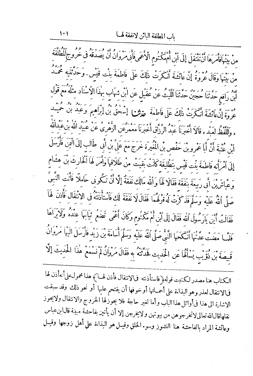 الْكِتَابُ هُنَا مَصْدَرٌ لِكَتَبْتُ قَوْلُهُ (فَاسْتَأْذَنَتْهُ فِي الِانْتِقَالِ فَأَذِنَ لَهَا) هَذَا مَحْمُولٌ عَلَى أَنَّهُ أَذِنَ لَهَا فِي الِانْتِقَالِ لِعُذْرٍ وَهُوَ الْبَذَاءَةُ عَلَى أَحْمَائِهَا أَوْ خَوْفُهَا أَنْ يُقْتَحَمَ عَلَيْهَا أَوْ نَحْوَ ذَلِكَ وَقَدْ سَبَقَتِ الْإِشَارَةُ إِلَى هَذَا فِي أَوَائِلِ هَذَا الْبَابِ وَأَمَّا لِغَيْرِ حَاجَةٍ فَلَا يَجُوزُ لَهَا الْخُرُوجُ وَالِانْتِقَالُ وَلَا يجوز نقلها قال الله تعالى لاتخرجوهن مِنْ بُيُوتِهِنَّ وَلَا يَخْرُجْنَ إِلَّا أَنْ يَأْتِينَ بفاحشة مبينة قال بن عَبَّاسٍ وَعَائِشَةُ الْمُرَادُ بِالْفَاحِشَةِ هُنَا النُّشُوزُ وَسُوءُ الخلق وقيل هو البذاءة على أهل زوجها وقيل