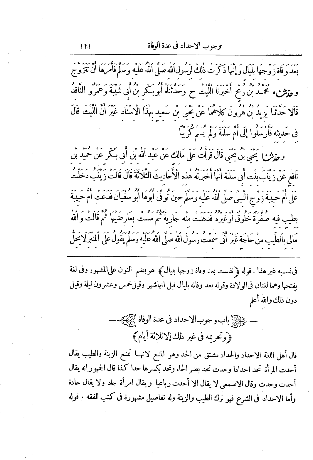 (باب وُجُوبِ الْإِحْدَادِ فِي عِدَّةِ الْوَفَاةِ (وَتَحْرِيمِهِ فِي غَيْرِ ذَلِكَ إِلَّا ثَلَاثَةَ أَيَّامٍ) قَالَ أَهْلُ اللُّغَةِ الْإِحْدَادُ وَالْحِدَادُ مُشْتَقٌّ مِنَ الْحَدِّ وَهُوَ الْمَنْعُ لِأَنَّهَا تَمْنَعُ الزِّينَةَ وَالطِّيبَ يُقَالُ أَحَدَّتِ الْمَرْأَةُ تَحِدُّ إِحْدَادًا وَحَدَّتْ تَحُدُّ بِضَمِّ الْحَاءِ وَتَحِدُّ بِكَسْرِهَا حَدًّا كَذَا قَالَ الْجُمْهُورُ أَنَّهُ يُقَالُ أَحَدَّتْ وَحَدَّتْ وَقَالَ الْأَصْمَعِيُّ لَا يُقَالُ إِلَّا أَحَدَّتْ رُبَاعِيًّا وَيُقَالُ امْرَأَةٌ حَادٌّ وَلَا يُقَالُ حَادَّةٌ وَأَمَّا الْإِحْدَادُ فِي الشَّرْعِ فَهُوَ تَرْكُ الطِّيبِ وَالزِّينَةِ وَلَهُ تَفَاصِيلُ مَشْهُورَةٌ فِي كُتُبِ الْفِقْهِ