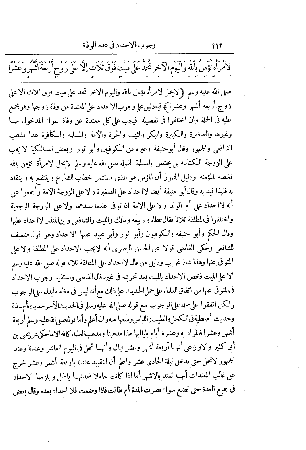 ((لَا يَحِلُّ لِامْرَأَةٍ تُؤْمِنُ بِاللَّهِ وَالْيَوْمِ الْآخِرِ تُحِدُّ عَلَى مَيِّتٍ فَوْقَ ثَلَاثٍ إِلَّا عَلَى زَوْجٍ أَرْبَعَةَ أَشْهُرٍ وَعَشْرًا) فِيهِ دَلِيلٌ عَلَى وُجُوبِ الْإِحْدَادِ عَلَى الْمُعْتَدَّةِ مِنْ وَفَاةِ زَوْجِهَا وَهُوَ مُجْمَعٌ عَلَيْهِ فِي الْجُمْلَةِ وَإِنِ اخْتَلَفُوا فِي تَفْصِيلِهِ فَيَجِبُ عَلَى كُلِّ مُعْتَدَّةٍ عَنْ وَفَاةٍ سَوَاءٌ الْمَدْخُولُ بِهَا وَغَيْرُهَا وَالصَّغِيرَةُ وَالْكَبِيرَةُ وَالْبِكْرُ وَالثَّيِّبُ وَالْحُرَّةُ وَالْأَمَةُ وَالْمُسْلِمَةُ وَالْكَافِرَةُ هَذَا مَذْهَبُ الشَّافِعِيِّ وَالْجُمْهُورِ وَقَالَ أَبُو حَنِيفَةَ وَغَيْرُهُ مِنَ الْكُوفِيِّينَ وَأَبُو ثَوْرٍ وَبَعْضُ الْمَالِكِيَّةِ لَا يَجِبُ عَلَى الزَّوْجَةِ الْكِتَابِيَّةِ بَلْ يَخْتَصُّ بِالْمُسْلِمَةِ لِقَوْلِهِ صَلَّى اللَّهُ عَلَيْهِ وَسَلَّمَ لَا يَحِلُّ لِامْرَأَةٍ تُؤْمِنُ بِاللَّهِ فَخَصَّهُ بِالْمُؤْمِنَةِ وَدَلِيلُ الْجُمْهُورِ أَنَّ الْمُؤْمِنَ هُوَ الَّذِي يَشْمَلُ خِطَابَ الشَّارِعِ وَيَنْتَفِعُ بِهِ وَيَنْقَادُ لَهُ فَلِهَذَا قَيَّدَ بِهِ وَقَالَ أَبُو حَنِيفَةَ أَيْضًا لَا إِحْدَادَ عَلَى الصَّغِيرَةِ وَلَا عَلَى الزوجة الأمة وأجمعوا على أنه لا احداد عَلَى أُمِّ الْوَلَدِ وَلَا عَلَى الْأَمَةِ إِذَا تُوُفِّيَ عَنْهُمَا سَيِّدُهُمَا وَلَا عَلَى الزَّوْجَةِ الرَّجْعِيَّةِ وَاخْتَلَفُوا فِي الْمُطَلَّقَةِ ثَلَاثًا فَقَالَ عَطَاءٌ وَرَبِيعَةُ ومالك والليث والشافعى وبن الْمُنْذِرِ لَا إِحْدَادَ عَلَيْهَا وَقَالَ الْحَكَمُ وَأَبُو حَنِيفَةَ وَالْكُوفِيُّونَ وَأَبُو ثَوْرٍ وَأَبُو عُبَيْدٍ عَلَيْهَا الْإِحْدَادُ وَهُوَ قَوْلٌ ضَعِيفٌ لِلشَّافِعِيِّ وَحَكَى الْقَاضِي قَوْلًا عَنِ الْحَسَنِ الْبَصْرِيِّ أَنَّهُ لَا يَجِبُ الْإِحْدَادُ عَلَى الْمُطَلَّقَةِ وَلَا عَلَى الْمُتَوَفَّى عَنْهَا وَهَذَا شَاذٌّ غَرِيبٌ وَدَلِيلُ مَنْ قَالَ لَا احداد عَلَى الْمُطَلَّقَةِ ثَلَاثًا قَوْلُهُ صَلَّى اللَّهُ عَلَيْهِ وَسَلَّمَ إِلَّا عَلَى الْمَيِّتِ فَخَصَّ الْإِحْدَادَ بِالْمَيِّتِ بَعْدَ تَحْرِيمِهِ فِي غَيْرِهِ قَالَ الْقَاضِي وَاسْتُفِيدَ وُجُوبُ الْإِحْدَادِ فِي الْمُتَوَفَّى عَنْهَا مِنَ اتِّفَاقِ الْعُلَمَاءِ عَلَى حَمْلِ الْحَدِيثِ عَلَى ذَلِكَ مَعَ أَنَّهُ لَيْسَ فِي لَفْظِهِ مَا يَدُلُّ عَلَى الْوُجُوبِ وَلَكِنِ اتَّفَقُوا عَلَى حَمْلِهِ عَلَى الْوُجُوبِ مَعَ قَوْلُهُ صَلَّى اللَّهُ عَلَيْهِ وَسَلَّمَ فِي الْحَدِيثِ الْآخَرِ حَدِيثِ أُمِّ سَلَمَةَ وَحَدِيثِ أُمِّ عَطِيَّةَ فِي الْكُحْلِ وَالطِّيبِ وَاللِّبَاسِ وَمَنْعِهَا مِنْهُ وَاللَّهُ أَعْلَمُ وَأَمَّا قَوْلُهُ صَلَّى اللَّهُ عَلَيْهِ وَسَلَّمَ أَرْبَعَةَ أَشْهُرٍ وَعَشْرًا فَالْمُرَادُ بِهِ وَعَشْرَةُ أَيَّامٍ بِلَيَالِيهَا هَذَا مَذْهَبُنَا وَمَذْهَبُ الْعُلَمَاءِ كَافَّةً إِلَّا مَا حُكِيَ عَنْ يَحْيَى بْنِ أَبِي كَثِيرٍ وَالْأَوْزَاعِيِّ أَنَّهَا أَرْبَعَةُ أَشْهُرٍ وَعَشْرُ لَيَالٍ وَأَنَّهَا تَحِلُّ فِي الْيَوْمِ الْعَاشِرِ وَعِنْدَنَا وَعِنْدَ الْجُمْهُورِ لَا تَحِلُّ حَتَّى تَدْخُلَ لَيْلَةُ الْحَادِي عَشَرَ وَاعْلَمْ أَنَّ التَّقْيِيدَ عِنْدَنَا بِأَرْبَعَةِ أَشْهُرٍ وَعَشْرٍ خَرَجَ عَلَى غَالِبِ الْمُعْتَدَّاتِ أَنَّهَا تَعْتَدُّ بِالْأَشْهُرِ أَمَّا إِذَا كَانَتْ حَامِلًا فَعِدَّتُهَا بِالْحَمْلِ وَيَلْزَمُهَا الْإِحْدَادُ فِي جَمِيعِ الْعِدَّةِ حَتَّى تَضَعَ سَوَاءٌ قَصُرَتِ الْمُدَّةُ أَمْ طَالَتْ فَإِذَا وَضَعَتْ فَلَا إِحْدَادَ بَعْدَهُ وَقَالَ بَعْضُ)