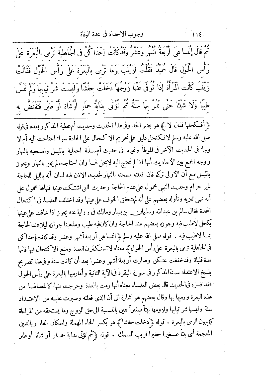 (أَفَنَكْحُلُهَا فَقَالَ لَا) هُوَ بِضَمِّ الْحَاءِ وَفِي هَذَا الْحَدِيثِ وَحَدِيثِ أُمِّ عَطِيَّةَ الْمَذْكُورِ بَعْدَهُ فِي قَوْلِهِ صَلَّى اللَّهُ عَلَيْهِ وَسَلَّمَ لَا تَكْتَحِلْ دَلِيلٌ عَلَى تَحْرِيمِ الِاكْتِحَالِ عَلَى الْحَادَّةِ سَوَاءٌ احْتَاجَتْ إِلَيْهِ أَمْ لَا وَجَاءَ فِي الْحَدِيثِ الْآخَرِ فِي الْمُوَطَّأِ وَغَيْرِهِ فِي حَدِيثِ أُمِّ سَلَمَةَ اجْعَلِيهِ بِاللَّيْلِ وَامْسَحِيهِ بِالنَّهَارِ وَوَجْهُ الْجَمْعِ بَيْنَ الْأَحَادِيثِ أَنَّهَا إِذَا لَمْ تَحْتَجْ إِلَيْهِ لَا يَحِلُّ لَهَا وَإِنْ احْتَاجَتْ لَمْ يَجُزْ بِالنَّهَارِ وَيَجُوزُ بِاللَّيْلِ مَعَ أَنَّ الْأَوْلَى تَرْكُهُ فَإِنَّ فَعَلَتْهُ مَسَحَتْهُ بِالنَّهَارِ فَحَدِيثُ الْإِذْنِ فِيهِ لِبَيَانِ أَنَّهُ بِاللَّيْلِ لِلْحَاجَةِ غَيْرُ حَرَامٍ وحَدِيثُ النَّهْيِ مَحْمُولٌ عَلَى عَدَمِ الْحَاجَةِ وَحَدِيثُ الَّتِي اشْتَكَتْ عَيْنُهَا فَنَهَاهَا مَحْمُولٌ عَلَى أَنَّهُ نَهْيُ تَنْزِيهٍ وَتَأَوَّلَهُ بَعْضُهُمْ عَلَى أَنَّهُ لَمْ يَتَحَقَّقِ الْخَوْفُ عَلَى عَيْنِهَا وَقَدِ اخْتَلَفَ الْعُلَمَاءُ فِي اكْتِحَالِ الْمُحِدَّةِ فَقَالَ سَالِمُ بْنُ عَبْدِ اللَّهِ وَسُلَيْمَانُ بْنُ يَسَارٍ وَمَالِكٌ فِي رِوَايَةٍ عَنْهُ يَجُوزُ إِذَا خَافَتْ عَلَى عَيْنِهَا بِكُحْلٍ لَا طِيبَ فِيهِ وَجَوَّزَهُ بَعْضُهُمْ عِنْدَ الْحَاجَةِ وَإِنْ كَانَ فِيهِ طِيبٌ وَمَذْهَبُنَا جَوَازُهُ لَيْلًا عِنْدَ الْحَاجَةِ بِمَا لَا طِيبَ فِيهِ قَوْلُهُ صَلَّى اللَّهُ عَلَيْهِ وَسَلَّمَ (إِنَّمَا هِيَ أَرْبَعَةُ أَشْهُرٍ وَعَشْرٌ وَقَدْ كَانَتْ إِحْدَاكُنَّ فِي الْجَاهِلِيَّةِ تَرْمِي بِالْبَعْرَةِ عَلَى رَأْسِ الْحَوْلِ) مَعْنَاهُ لَا تَسْتَكْثِرْنَ الْعِدَّةَ وَمَنْعَ الِاكْتِحَالِ فِيهَا فَإِنَّهَا مُدَّةٌ قَلِيلَةٌ وَقَدْ خُفِّفَتْ عَنْكُنَّ وَصَارَتْ أَرْبَعَةَ أَشْهُرٍ وَعَشْرًا بَعْدَ أَنْ كَانَتْ سَنَةً وَفِي هَذَا تَصْرِيحٌ بِنَسْخِ الِاعْتِدَادِ سَنَةً الْمَذْكُورِ فِي سُورَةِ الْبَقَرَةِ فِي الْآيَةِ الثَّانِيَةِ وَأَمَّا رَمْيُهَا بِالْبَعْرَةِ عَلَى رَأْسِ الْحَوْلِ فَقَدْ فَسَّرَهُ فِي الْحَدِيثِ قَالَ بَعْضُ الْعُلَمَاءِ مَعْنَاهُ أَنَّهَا رَمَتْ بِالْعِدَّةِ وَخَرَجَتْ مِنْهَا كَانْفِصَالِهَا مِنْ هَذِهِ الْبَعَرَةِ وَرَمْيِهَا بِهَا وَقَالَ بَعْضُهُمْ هُوَ إِشَارَةٌ إِلَى أَنَّ الَّذِي فَعَلَتْهُ وَصَبَرَتْ عَلَيْهِ مِنَ الِاعْتِدَادِ سَنَةً وَلُبْسِهَا شَرَّ ثِيَابِهَا وَلُزُومَهَا بَيْتًا صَغِيرًا هَيِّنٌ بِالنِّسْبَةِ إِلَى حَقِّ الزَّوْجِ وَمَا يَسْتَحِقُّهُ مِنَ الْمُرَاعَاةِ كَمَا يَهُونُ الرَّمْيُ بِالْبَعَرَةِ