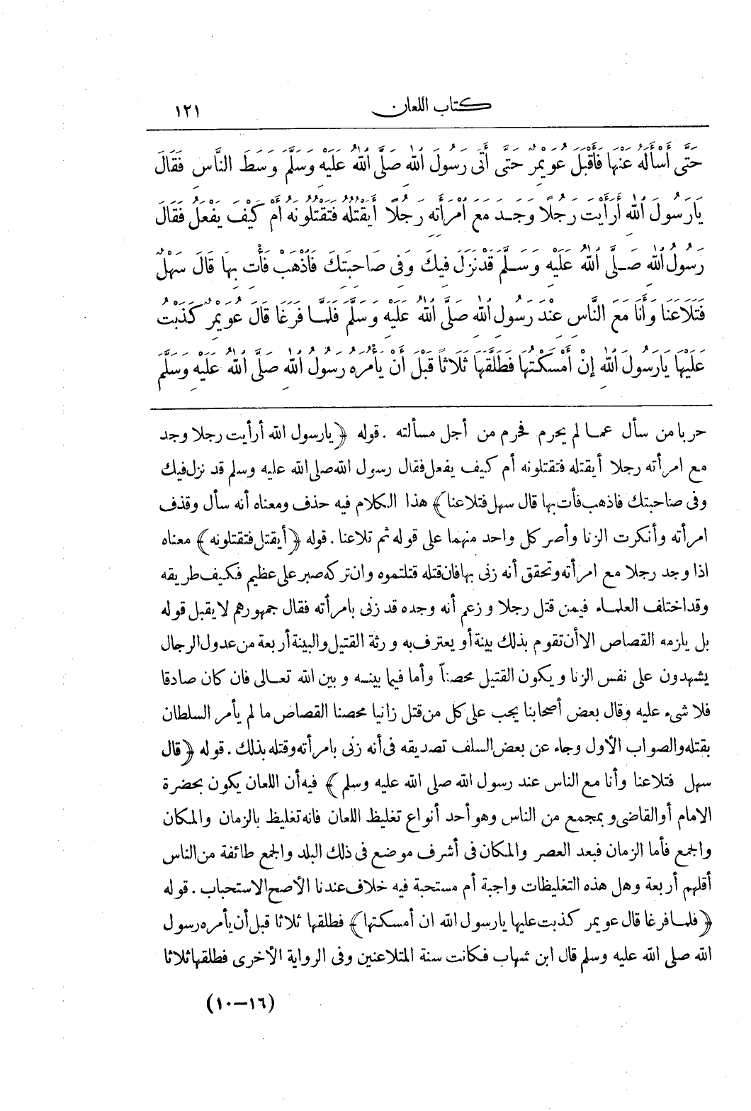 حَرْبًا مَنْ سَأَلَ عَمَّا لَمْ يَحْرُمْ فَحُرِّمَ مِنْ أَجْلِ مَسْأَلَتِهِ قَوْلُهُ (يَا رَسُولَ اللَّهِ أَرَأَيْتَ رَجُلًا وَجَدَ مَعَ امْرَأَتِهِ رَجُلًا أَيَقْتُلُهُ فَتَقْتُلُونَهُ أَمْ كَيْفَ يَفْعَلُ فَقَالَ رَسُولُ اللَّهِ صَلَّى اللَّهُ عَلَيْهِ وَسَلَّمَ قَدْ نَزَلَ فِيكَ وَفِي صَاحِبَتِكَ فَاذْهَبْ فَأْتِ بِهَا قَالَ سَهْلٌ فَتَلَاعَنَا) هَذَا الْكَلَامُ فِيهِ حَذْفٌ وَمَعْنَاهُ أَنَّهُ سأل وقذف امرأته وأنكرت الزنى وَأَصَرَّ كُلُّ وَاحِدٍ مِنْهُمَا عَلَى قَوْلِهِ ثُمَّ تَلَاعَنَا قَوْلُهُ (أَيَقْتُلُ فَتَقْتُلُونَهُ) مَعْنَاهُ إِذَا وَجَدَ رجلا مع امرأته وتحقق أنه زنا بِهَا فَإِنْ قَتَلَهُ قَتَلْتُمُوهُ وَإِنْ تَرَكَهُ صَبَرَ عَلَى عَظِيمٍ فَكَيْفَ طَرِيقُهُ وَقَدِ اخْتَلَفَ الْعُلَمَاءُ فِيمَنْ قَتَلَ رَجُلًا وَزَعَمَ أَنَّهُ وَجَدَهُ قَدْ زَنَى بِامْرَأَتِهِ فَقَالَ جُمْهُورُهُمْ لَا يُقْبَلُ قَوْلُهُ بَلْ يَلْزَمُهُ الْقِصَاصُ إِلَّا أَنْ تَقُومَ بِذَلِكَ بَيِّنَةٌ أَوْ يَعْتَرِفُ بِهِ وَرَثَةُ الْقَتِيلِ وَالْبَيِّنَةُ أَرْبَعَةٌ مِنْ عُدُولِ الرِّجَالِ يَشْهَدُونَ عَلَى نَفْسِ الزنى وَيَكُونُ الْقَتِيلُ مُحْصَنًا وَأَمَّا فِيمَا بَيْنَهُ وَبَيْنَ اللَّهِ تَعَالَى فَإِنْ كَانَ صَادِقًا فَلَا شَيْءَ عَلَيْهِ وَقَالَ بَعْضُ أَصْحَابِنَا يَجِبُ عَلَى كُلِّ مَنْ قَتَلَ زَانِيًا مُحْصَنًا الْقِصَاصُ مَا لَمْ يَأْمُرِ السُّلْطَانُ بِقَتْلِهِ وَالصَّوَابُ الْأَوَّلُ وَجَاءَ عَنْ بَعْضِ السَّلَفِ تَصْدِيقُهُ فِي أَنَّهُ زَنَى بِامْرَأَتِهِ وَقَتَلَهُ بِذَلِكَ قَوْلُهُ (قَالَ سَهْلٌ فَتَلَاعَنَا وَأَنَا مَعَ النَّاسِ عِنْدَ رَسُولِ اللَّهِ صَلَّى اللَّهُ عَلَيْهِ وَسَلَّمَ) فِيهِ أَنَّ اللِّعَانَ يَكُونُ بِحَضْرَةِ الامام أو القاضي وَبِمَجْمَعٍ مِنَ النَّاسِ وَهُوَ أَحَدُ أَنْوَاعِ تَغْلِيظِ اللِّعَانِ فَإِنَّهُ تَغْلِيظٌ بِالزَّمَانِ وَالْمَكَانِ وَالْجَمْعِ فَأَمَّا الزَّمَانُ فَبَعْدَ الْعَصْرِ وَالْمَكَانُ فِي أَشْرَفِ مَوْضِعٍ فِي ذَلِكَ الْبَلَدِ وَالْجَمْعُ طَائِفَةٌ مِنَ النَّاسِ أَقَلُّهُمْ أَرْبَعَةٌ وَهَلْ هَذِهِ التَّغْلِيظَاتُ وَاجِبَةٌ أَمْ مُسْتَحَبَّةٌ فِيهِ خِلَافٌ عِنْدَنَا الْأَصَحُّ الِاسْتِحْبَابُ قَوْلُهُ (فَلَمَّا فَرَغَا قَالَ عُوَيْمِرٌ كَذَبْتُ عَلَيْهَا يَا رَسُولَ اللَّهِ إِنْ أَمْسَكْتُهَا) فَطَلَّقَهَا ثَلَاثًا قَبْلَ أَنْ يَأْمُرَهُ رَسُولُ اللَّهِ صَلَّى اللَّهُ عَلَيْهِ وسلم قال بن شِهَابٌ فَكَانَتْ سُنَّةَ الْمُتَلَاعِنَيْنِ وَفِي الرِّوَايَةِ الْأُخْرَى فطلقها ثلاثا