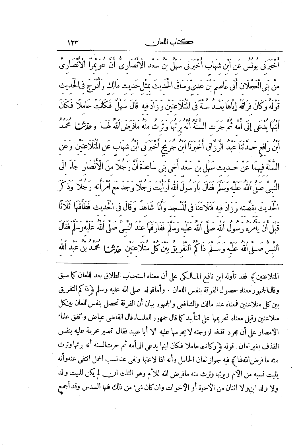 المتلاعنين) فقد تأوله بن نَافِعٍ الْمَالِكِيُّ عَلَى أَنَّ مَعْنَاهُ اسْتِحْبَابُ الطَّلَاقِ بَعْدَ اللِّعَانِ كَمَا سَبَقَ وَقَالَ الْجُمْهُورُ مَعْنَاهُ حُصُولُ الْفُرْقَةِ بِنَفْسِ اللِّعَانِ وَأَمَّا قَوْلُهُ صَلَّى اللَّهُ عَلَيْهِ وَسَلَّمَ (ذَاكُمُ التَّفْرِيقُ بَيْنَ كُلِّ مُتَلَاعِنَيْنِ فَمَعْنَاهُ عِنْدَ مَالِكٍ وَالشَّافِعِيِّ وَالْجُمْهُورِ بَيَانُ أَنَّ الْفُرْقَةَ تَحْصُلُ بِنَفْسِ اللِّعَانِ بَيْنَ كُلِّ مُتَلَاعِنَيْنِ وَقِيلَ مَعْنَاهُ تَحْرِيمُهَا عَلَى التَّأْبِيدِ كَمَا قَالَ جُمْهُورُ الْعُلَمَاءِ قَالَ الْقَاضِي عِيَاضٌ وَاتَّفَقَ عُلَمَاءُ الْأَمْصَارِ عَلَى أَنَّ مُجَرَّدَ قَذْفِهِ لِزَوْجَتِهِ لَا يُحَرِّمُهَا عَلَيْهِ إِلَّا أَبَا عُبَيْدٍ فَقَالَ تَصِيرُ مُحَرَّمَةً عَلَيْهِ بِنَفْسِ الْقَذْفِ بِغَيْرِ لِعَانٍ قَوْلُهُ (وَكَانَتْ حَامِلًا فَكَانَ ابْنُهَا يُدْعَى إِلَى أُمِّهِ ثُمَّ جَرَتِ السُّنَّةُ أَنْ يَرِثَهَا وَتَرِثَ منه ما فرض الله لها) فيه جَوَازِ لِعَانِ الْحَامِلِ وَأَنَّهُ إِذَا لَاعَنَهَا وَنَفَى عنه نَسَبِ الْحَمْلِ انْتَفَى عَنْهُ وَأَنَّهُ يَثْبُتُ نَسَبُهُ من الأم ويرثها وترث منه مَا فَرَضَ اللَّهُ لِلْأُمِّ وَهُوَ الثُّلُثُ إِنْ لم يكن للميت ولد ولا ولد بن وَلَا اثْنَانِ مِنَ الْإِخْوَةِ أَوِ الْأَخَوَاتِ وَإِنْ كَانَ شَيْءٌ مِنْ ذَلِكَ فَلَهَا السُّدُسُ وَقَدْ أجمع