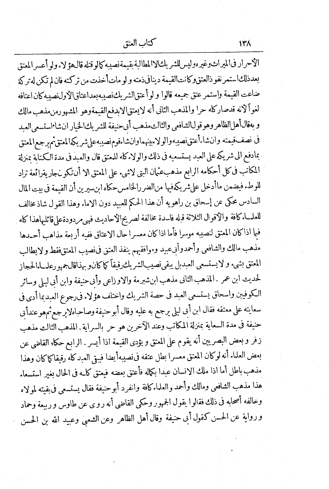 الْأَحْرَارِ فِي الْمِيرَاثِ وَغَيْرِهِ وَلَيْسَ لِلشَّرِيكِ إِلَّا الْمُطَالَبَةُ بِقِيمَةِ نَصِيبِهِ كَمَا لَوْ قَتَلَهُ قَالَ هَؤُلَاءِ وَلَوْ أُعْسِرَ الْمُعْتِقُ بَعْدَ ذَلِكَ اسْتَمَرَّ نُفُوذُ الْعِتْقِ وَكَانَتِ الْقِيمَةُ دَيْنًا فِي ذِمَّتِهِ وَلَوْ مَاتَ أُخِذَتْ مِنْ تَرِكَتِهِ فَإِنْ لَمْ تَكُنْ لَهُ تَرِكَةٌ ضَاعَتِ الْقِيمَةُ وَاسْتَمَرَّ عِتْقُ جَمِيعِهِ قَالُوا وَلَوْ أَعْتَقَ الشَّرِيكُ نَصِيبَهُ بَعْدَ إِعْتَاقِ الْأَوَّلِ نَصِيبَهُ كَانَ إِعْتَاقُهُ لَغْوًا لِأَنَّهُ قَدْ صَارَ كُلُّهُ حُرًّا وَالْمَذْهَبُ الثَّانِي أَنَّهُ لَا يُعْتَقُ إِلَّا بِدَفْعِ الْقِيمَةِ وَهُوَ الْمَشْهُورُ مِنْ مَذْهَبِ مَالِكٍ وَبِهِ قَالَ أَهْلُ الظَّاهِرِ وهو قول الشافعى والثالث مَذْهَبُ أَبِي حَنِيفَةَ لِلشَّرِيكِ الْخِيَارُ إِنْ شَاءَ اسْتَسْعَى الْعَبْدَ فِي نِصْفِ قِيمَتِهِ وَإِنْ شَاءَ أَعْتَقَ نَصِيبَهُ وَالْوَلَاءُ بَيْنَهُمَا وَإِنْ شَاءَ قَوَّمَ نَصِيبَهُ عَلَى شَرِيكِهِ الْمُعْتِقِ ثُمَّ يَرْجِعُ الْمُعْتِقُ بِمَا دَفَعَ إِلَى شَرِيكِهِ عَلَى الْعَبْدِ يَسْتَسْعِيهِ فِي ذَلِكَ وَالْوَلَاءُ كُلُّهُ لِلْمُعْتِقِ قَالَ وَالْعَبْدُ فِي مُدَّةِ الْكِتَابَةِ بِمَنْزِلَةِ الْمُكَاتَبِ فِي كُلِّ أحكامه الرابع مذهب عثمان البتى لا شئ عَلَى الْمُعْتِقِ إِلَّا أَنْ تَكُونَ جَارِيَةً رَائِعَةً تُرَادُ لِلْوَطْءِ فَيَضْمَنُ مَا أَدْخَلَ عَلَى شَرِيكِهِ فيها من الضرر الخامس حكاه بن سِيرِينَ أَنَّ الْقِيمَةَ فِي بَيْتِ الْمَالِ السَّادِسُ مَحْكِيٌّ عَنْ إِسْحَاقَ بْنِ رَاهَوَيْهِ أَنَّ هَذَا الْحُكْمَ لِلْعَبِيدِ دُونَ الْإِمَاءِ وَهَذَا الْقَوْلُ شَاذٌّ مُخَالِفٌ لِلْعُلَمَاءِ كَافَّةً وَالْأَقْوَالُ الثَّلَاثَةُ قَبْلَهُ فَاسِدَةٌ مُخَالِفَةٌ لِصَرِيحِ الْأَحَادِيثِ فَهِيَ مَرْدُودَةٌ عَلَى قَائِلِيهَا هَذَا كُلُّهُ فِيمَا إِذَا كَانَ الْمُعْتِقُ لِنَصِيبِهِ مُوسِرًا فَأَمَّا إِذَا كَانَ مُعْسِرًا حَالَ الْإِعْتَاقِ فَفِيهِ أَرْبَعَةُ مَذَاهِبَ أَحَدُهَا مَذْهَبُ مَالِكٍ وَالشَّافِعِيِّ وَأَحْمَدَ وَأَبِي عُبَيْدٍ وَمُوَافِقِيهِمْ يَنْفُذُ الْعِتْقُ فِي نصيب المعتق فقط ولا يطالب المعتق بشئ وَلَا يُسْتَسْعَى الْعَبْدُ بَلْ يَبْقَى نَصِيبُ الشَّرِيكِ رَقِيقًا كَمَا كَانَ وَبِهَذَا قَالَ جُمْهُورُ عُلَمَاءِ الحجاز لحديث بن عمر المذهب الثانى مذهب بن شبرمة والاوزاعى وأبى حنيفة وبن أَبِي لَيْلَى وَسَائِرِ الْكُوفِيِّينَ وَإِسْحَاقَ يُسْتَسْعَى الْعَبْدُ فِي حِصَّةِ الشَّرِيكِ وَاخْتَلَفَ هَؤُلَاءِ فِي رُجُوعِ الْعَبْدِ بِمَا أَدَّى فِي سِعَايَتِهِ عَلَى مُعْتِقِهِ فقال بن أَبِي لَيْلَى يَرْجِعُ بِهِ عَلَيْهِ وَقَالَ أَبُو حَنِيفَةَ وَصَاحِبَاهُ لَا يَرْجِعُ ثُمَّ هُوَ عِنْدَ أَبِي حَنِيفَةَ فِي مُدَّةِ السِّعَايَةِ بِمَنْزِلَةِ الْمُكَاتَبِ وَعِنْدَ الْآخَرِينَ هُوَ حُرٌّ بِالسِّرَايَةِ الْمَذْهَبُ الثَّالِثُ مَذْهَبُ زُفَرَ وَبَعْضِ الْبَصْرِيِّينَ أَنَّهُ يُقَوَّمُ عَلَى الْمُعْتِقِ وَيُؤَدِّي الْقِيمَةَ إِذَا أَيْسَرَ الرَّابِعُ حَكَاهُ الْقَاضِي عَنْ بَعْضِ الْعُلَمَاءِ أَنَّهُ لَوْ كَانَ الْمُعْتِقُ مُعْسِرًا بَطَلَ عِتْقُهُ فِي نَصِيبِهِ أَيْضًا فيبقى العبد كله رقيقا كما كان وهذا مذهب باطل أما اذا ملك الانسان عبدا بكماله فأعتق بعضه فيعتق كُلُّهُ في الْحَالِ بِغَيْرِ اسْتِسْعَاءٍ هَذَا مَذْهَبُ الشَّافِعِيِّ وَمَالِكٍ وَأَحْمَدَ وَالْعُلَمَاءِ كَافَّةً وَانْفَرَدَ أَبُو حَنِيفَةَ فَقَالَ يُسْتَسْعَى فِي بَقِيَّتِهِ لِمَوْلَاهُ وَخَالَفَهُ أَصْحَابُهُ فِي ذَلِكَ فَقَالُوا بِقَوْلِ الْجُمْهُورِ وَحَكَى الْقَاضِي أَنَّهُ رُوِيَ عَنْ طَاوُسٍ وَ