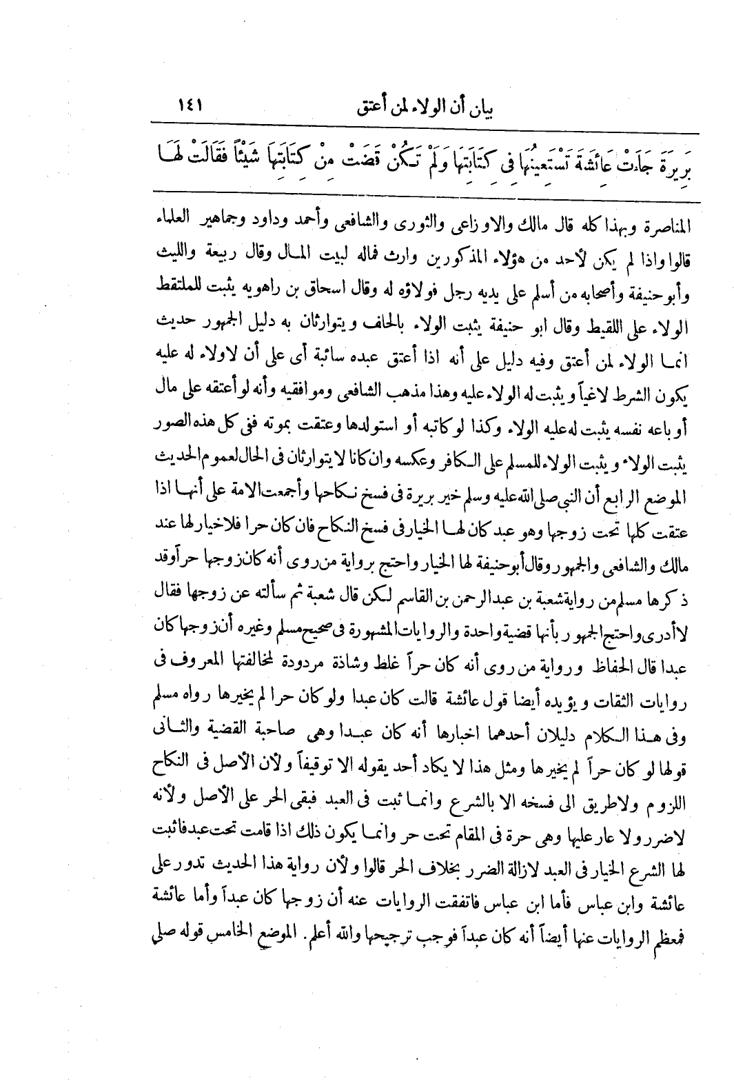 الْمُنَاصَرَةِ وَبِهَذَا كُلِّهِ قَالَ مَالِكٌ وَالْأَوْزَاعِيُّ وَالثَّوْرِيُّ وَالشَّافِعِيُّ وَأَحْمَدُ وَدَاوُدُ وَجَمَاهِيرُ الْعُلَمَاءِ قَالُوا وَإِذَا لَمْ يَكُنْ لِأَحَدٍ مِنْ هَؤُلَاءِ الْمَذْكُورِينَ وَارِثٌ فَمَالُهُ لِبَيْتِ الْمَالِ وَقَالَ رَبِيعَةُ وَاللَّيْثُ وَأَبُو حَنِيفَةَ وَأَصْحَابُهُ مَنْ أَسْلَمَ عَلَى يَدَيْهِ رَجُلٌ فَوَلَاؤُهُ لَهُ وَقَالَ إِسْحَاقُ بْنُ رَاهَوَيْهِ يَثْبُتُ لِلْمُلْتَقِطِ الْوَلَاءُ عَلَى اللَّقِيطِ وَقَالَ أَبُو حَنِيفَةَ يَثْبُتُ الْوَلَاءُ بِالْحِلْفِ وَيَتَوَارَثَانِ بِهِ دَلِيلُ الْجُمْهُورِ حَدِيثُ إِنَّمَا الْوَلَاءُ لِمَنْ أَعْتَقَ وَفِيهِ دَلِيلٌ عَلَى أَنَّهُ إِذَا أَعْتَقَ عَبْدَهُ سَائِبَةً أَيْ على أن لا وَلَاءَ لَهُ عَلَيْهِ يَكُونُ الشَّرْطُ لَاغِيًا وَيَثْبُتُ لَهُ الْوَلَاءُ عَلَيْهِ وَهَذَا مَذْهَبُ الشَّافِعِيِّ وَمُوَافِقِيهِ وَأَنَّهُ لَوْ أَعْتَقَهُ عَلَى مَالٍ أَوْ بَاعَهُ نَفْسَهُ يَثْبُتُ لَهُ عَلَيْهِ الْوَلَاءُ وَكَذَا لَوْ كَاتَبَهُ أَوِ اسْتَوْلَدَهَا وَعُتِقَتْ بِمَوْتِهِ فَفِي كُلِّ هَذِهِ الصُّوَرِ يَثْبُتُ الْوَلَاءُ وَيَثْبُتُ الْوَلَاءُ لِلْمُسْلِمِ عَلَى الْكَافِرِ وَعَكْسِهِ وَإِنْ كَانَا لَا يَتَوَارَثَانِ فِي الْحَالِ لِعُمُومِ الْحَدِيثِ الْمَوْضِعُ الرَّابِعُ أَنَّ النَّبِيَّ صَلَّى اللَّهُ عَلَيْهِ وَسَلَّمَ خَيَّرَ بَرِيرَةَ فِي فَسْخِ نِكَاحِهَا وَأَجْمَعَتِ الْأُمَّةُ عَلَى أَنَّهَا إِذَا عُتِقَتْ كُلُّهَا تَحْتَ زَوْجِهَا وَهُوَ عَبْدٌ كَانَ لَهَا الْخِيَارُ فِي فَسْخِ النِّكَاحِ فَإِنْ كَانَ حُرًّا فَلَا خِيَارَ لَهَا عِنْدَ مَالِكٍ وَالشَّافِعِيِّ وَالْجُمْهُورِ وَقَالَ أَبُو حَنِيفَةَ لَهَا الْخِيَارُ وَاحْتَجَّ بِرِوَايَةِ مَنْ رَوَى أَنَّهُ كَانَ زَوْجُهَا حُرًّا وَقَدْ ذَكَرَهَا مُسْلِمٌ مِنْ رِوَايَةِ شُعْبَةَ بْنِ عَبْدِ الرَّحْمَنِ بْنِ الْقَاسِمِ لَكِنْ قَالَ شُعْبَةُ ثُمَّ سَأَلْتُهُ عَنْ زَوْجِهَا فَقَالَ لَا أَدْرِي وَاحْتَجَّ الْجُمْهُورُ بِأَنَّهَا قَضِيَّةٌ وَاحِدَةٌ وَالرِّوَايَاتُ الْمَشْهُورَةُ فِي صَحِيحِ مُسْلِمٍ وَغَيْرِهِ أَنَّ زَوْجَهَا كَانَ عَبْدًا قَالَ الْحُفَّاظُ وَرِوَايَةُ مَنْ رَوَى أَنَّهُ كَانَ حُرًّا غَلَطٌ وَشَاذَّةٌ مَرْدُودَةٌ لِمُخَالَفَتِهَا الْمَعْرُوفَ فِي رِوَايَاتِ الثِّقَاتِ وَيُؤَيِّدُهُ أَيْضًا قَوْلُ عَائِشَةَ قَالَتْ كَانَ عَبْدًا وَلَوْ كَانَ حُرًّا لَمْ يُخَيِّرْهَا رَوَاهُ مُسْلِمٌ وَفِي هَذَا الْكَلَامِ دَلِيلَانِ أَحَدُهُمَا إِخْبَارُهَا أَنَّهُ كَانَ عَبْدًا وَهِيَ صَاحِبَةُ الْقَضِيَّةِ وَالثَّانِي قَوْلُهَا لَوْ كَانَ حُرًّا لَمْ يُخَيِّرْهَا وَمِثْلُ هَذَا لَا يَكَادُ أَحَدٌ يَقُولُهُ إِلَّا تَوْقِيفًا وَلِأَنَّ الْأَصْلَ فِي النِّكَاحِ اللُّزُومُ وَلَا طَرِيقَ إِلَى فَسْخِهِ إِلَّا بِالشَّرْعِ وَإِنَّمَا ثَبَتَ فِي الْعَبْدِ فَبَقِيَ الْحُرُّ عَلَى الْأَصْلِ وَلِأَنَّهُ لَا ضَرَرَ وَلَا عَارَ عَلَيْهَا وَهِيَ حُرَّةٌ فِي الْمُقَامِ تَحْتَ حُرٍّ وَإِنَّمَا يَكُونُ ذَلِكَ إِذَا قَامَتْ تَحْتَ عَبْدٍ فَأَثْبَتَ لَهَا الشَّرْعُ الْخِيَارَ فِي الْعَبْدِ لِإِزَالَةِ الضَّرَرِ بِخِلَافِ الْحُرِّ قَالُوا وَلِأَنَّ رِوَايَةَ هَذَا الْحَدِيثِ تدور على عائشة وبن عباس فأما بن عَبَّاسٍ فَاتَّفَقَتِ الرِّوَايَاتُ عَنْهُ أَنَّ زَوْجَهَا كَانَ عَبْدًا وَأَمَّا عَائِشَةُ فَمُعْظَمُ الرِّوَايَاتِ عَنْهَا أَيْضًا أَنَّهُ كَانَ عَبْدًا فَوَجَبَ تَرْجِيحُهَا وَاللَّهُ أَعْلَمُ الموضع الخامس قوله