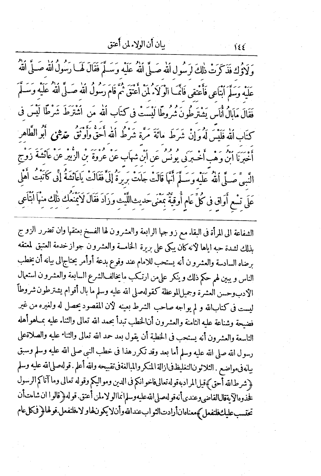 الشَّفَاعَةِ إِلَى الْمَرْأَةِ فِي الْبَقَاءِ مَعَ زَوْجِهَا الرَّابِعَةُ وَالْعِشْرُونَ لَهَا الْفَسْخُ بِعِتْقِهَا وَإِنْ تَضَرَّرَ الزَّوْجُ بِذَلِكَ لِشِدَّةِ حُبِّهِ إِيَّاهَا لِأَنَّهُ كَانَ يَبْكِي عَلَى بَرِيرَةَ الْخَامِسَةُ وَالْعِشْرُونَ جَوَازُ خِدْمَةِ الْعَتِيقِ لِمُعْتِقِهِ بِرِضَاهُ السَّادِسَةُ وَالْعِشْرُونَ أَنَّهُ يُسْتَحَبُّ لِلْإِمَامِ عِنْدَ وُقُوعِ بِدْعَةٍ أَوْ أَمْرٍ يُحْتَاجُ إِلَى بَيَانِهِ أَنْ يَخْطُبَ النَّاسَ وَيُبَيِّنَ لَهُمْ حُكْمَ ذَلِكَ وَيُنْكِرَ عَلَى مَنِ ارْتَكَبَ مَا يُخَالِفُ الشَّرْعَ السَّابِعَةُ وَالْعِشْرُونَ اسْتِعْمَالُ الْأَدَبِ وَحُسْنِ الْعِشْرَةِ وَجَمِيلِ الْمَوْعِظَةِ كَقَوْلِهِ صَلَّى اللَّهُ عَلَيْهِ وَسَلَّمَ مَا بَالُ أقوالم يَشْتَرِطُونَ شُرُوطًا لَيْسَتْ فِي كِتَابِ اللَّهِ وَلَمْ يُوَاجِهْ صَاحِبَ الشَّرْطِ بِعَيْنِهِ لِأَنَّ الْمَقْصُودَ يَحْصُلُ لَهُ وَلِغَيْرِهِ مِنْ غَيْرِ فَضِيحَةٍ وَشَنَاعَةٍ عَلَيْهِ الثَّامِنَةُ وَالْعِشْرُونَ أَنَّ الْخُطَبَ تَبْدَأُ بِحَمْدِ اللَّهِ تَعَالَى وَالثَّنَاءِ عَلَيْهِ بِمَا هُوَ أَهْلُهُ التَّاسِعَةُ وَالْعِشْرُونَ أَنَّهُ يُسْتَحَبُّ فِي الْخُطْبَةِ أَنْ يَقُولَ بعد الحمد اللَّهِ تَعَالَى وَالثَّنَاءِ عَلَيْهِ وَالصَّلَاةِ عَلَى رَسُولِ اللَّهِ صَلَّى اللَّهُ عَلَيْهِ وَسَلَّمَ أَمَّا بَعْدُ وَقَدْ تَكَرَّرَ هَذَا فِي خُطَبِ النَّبِيِّ صَلَّى اللَّهُ عَلَيْهِ وَسَلَّمَ وَسَبَقَ بَيَانُهُ فِي مَوَاضِعَ الثَّلَاثُونَ التَّغْلِيظُ فِي إِزَالَةِ الْمُنْكَرِ وَالْمُبَالَغَةُ فِي تَقْبِيحِهِ وَاللَّهُ أَعْلَمُ قَوْلُهُ صَلَّى اللَّهُ عَلَيْهِ وَسَلَّمَ (شَرْطُ اللَّهِ أَحَقُّ) قِيلَ الْمُرَادُ بِهِ قوله تعالى فإخوانكم في الدين ومواليكم وقوله تعالى وما آتاكم الرسول فخذوه الْآيَةُ قَالَ الْقَاضِي وَعِنْدِي أَنَّهُ قَوْلُهُ صَلَّى اللَّهُ عَلَيْهِ وَسَلَّمَ إِنَّمَا الْوَلَاءُ لِمَنْ أَعْتَقَ قوله (قالوا ان شاءت ان تَحْتَسِبُ عَلَيْكِ فَلْتَفْعَلْ) مَعْنَاهُ إِنْ أَرَادَتِ الثَّوَابَ عند الله وأن لا يَكُونَ لَهَا وَلَاءٌ فَلْتَفْعَلْ قَوْلُهَا (فِي كُلِّ عام