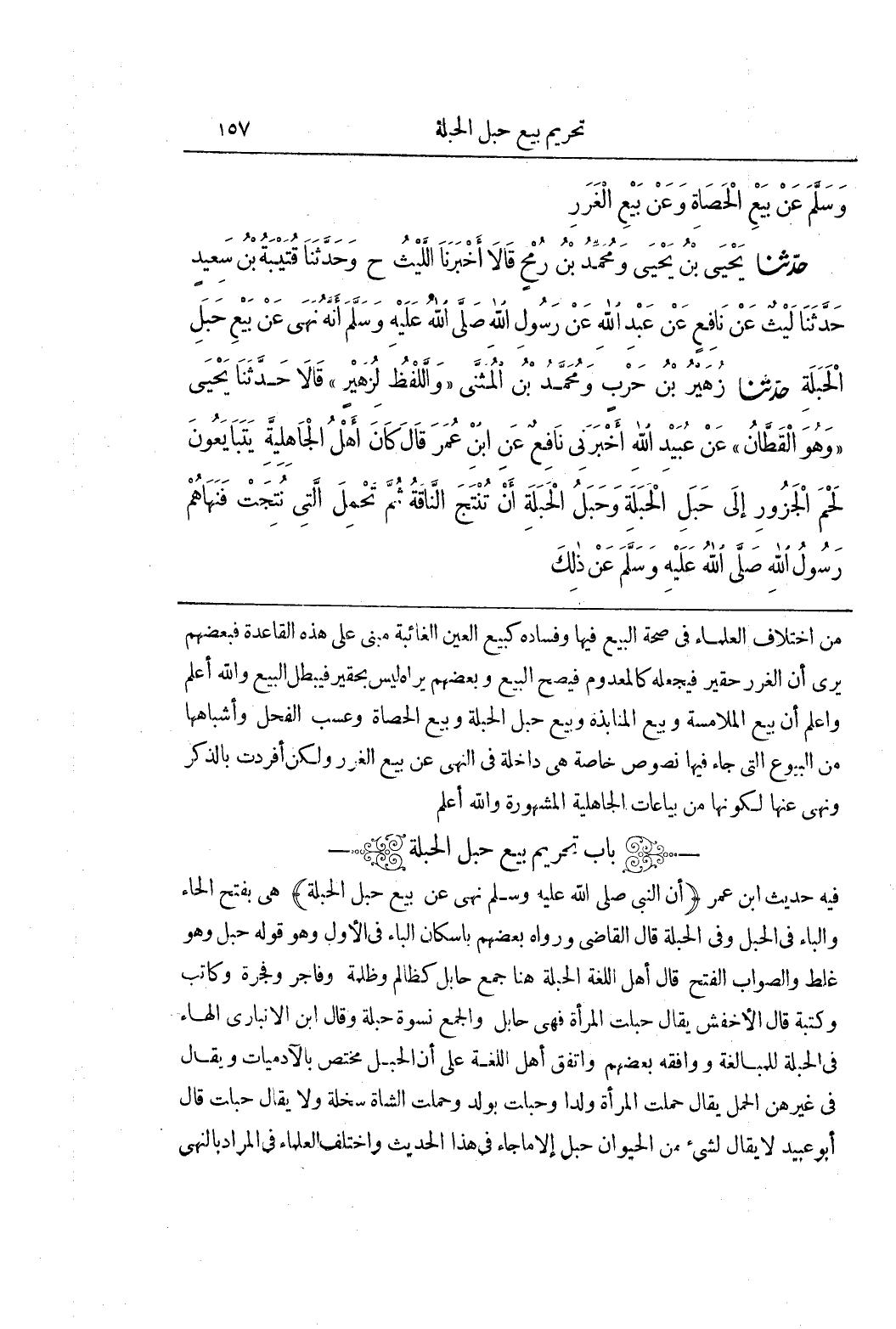 [1514] فيه حديث بن عُمَرَ (أَنَّ النَّبِيَّ صَلَّى اللَّهُ عَلَيْهِ وَسَلَّمَ نَهَى عَنْ بَيْعِ حَبَلِ الْحَبَلَةِ) هِيَ بِفَتْحِ الْحَاءِ وَالْبَاءِ فِي الْحَبَلِ وَفِي الْحَبَلَةِ قَالَ الْقَاضِي وَرَوَاهُ بَعْضُهُمْ بإِسْكَانِ الْبَاءِ فِي الْأَوَّلِ وَهُوَ قَوْلُهُ حَبْلُ وَهُوَ غَلَطٌ وَالصَّوَابُ الْفَتْحُ قَالَ أَهْلُ اللُّغَةِ الْحَبَلَةُ هُنَا جَمْعُ حَابِلٍ كَظَالِمٍ وَظَلَمَةٍ وَفَاجِرٍ وَفَجَرَةٍ وَكَاتِبٍ وَكَتَبَةٍ قَالَ الْأَخْفَشُ يُقَالُ حَبِلَتِ الْمَرْأَةُ فَهِيَ حَابِلٌ وَالْجَمْعُ نسوة حبلة وقال بن الْأَنْبَارِيِّ الْهَاءُ فِي الْحَبَلَةِ لِلْمُبَالَغَةِ وَوَافَقَهُ بَعْضُهُمْ وَاتَّفَقَ أَهْلُ اللُّغَةِ عَلَى أَنَّ الْحَبَلَ مُخْتَصٌّ بِالْآدَمِيَّاتِ وَيُقَالُ فِي غَيْرِهِنَّ الْحَمَلُ يُقَالُ حَمَلَتِ الْمَرْأَةُ وَلَدًا وَحَبِلَتْ بِوَلَدٍ وَحَمَلَتِ الشَّاةُ سَخْلَةً وَلَا يُقَالُ حَبِلَتْ قَالَ أَبُو عُبَيْدٍ لَا يُقَالُ لِشَيْءٍ مِنَ الْحَيَوَانِ حَبَلَ إِلَّا مَا جَاءَ فِي هَذَا الْحَدِيثِ وَاخْتَلَفَ الْعُلَمَاءُ فِي المراد بالنهى