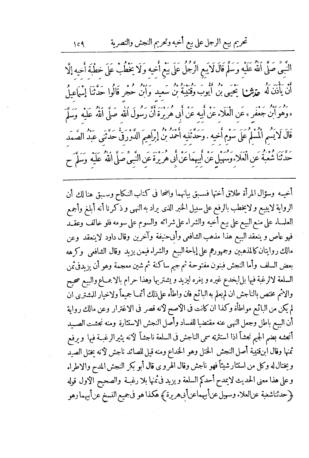 أَخِيهِ وَسُؤَالُ الْمَرْأَةِ طَلَاقَ أُخْتِهَا فَسَبَقَ بَيَانُهُمَا وَاضِحًا فِي كِتَابِ النِّكَاحِ وَسَبَقَ هُنَالِكَ أَنَّ الرِّوَايَةَ لَا يَبِيعُ وَلَا يَخْطِبُ بِالرَّفْعِ عَلَى سَبِيلِ الْخَبَرِ الَّذِي يُرَادُ بِهِ النَّهْيُ وَذَكَرْنَا أَنَّهُ أَبْلَغُ وَأَجْمَعَ الْعُلَمَاءُ عَلَى مَنْعِ الْبَيْعِ عَلَى بَيْعِ أَخِيهِ وَالشِّرَاءِ عَلَى شِرَائِهِ وَالسَّوْمِ عَلَى سَوْمِهِ فَلَوْ خَالَفَ وَعَقَدَ فَهُوَ عَاصٍ وَيَنْعَقِدُ الْبَيْعُ هَذَا مَذْهَبُ الشَّافِعِيِّ وَأَبِي حَنِيفَةَ وَآخَرِينَ وَقَالَ دَاوُدُ لَا يَنْعَقِدُ وَعَنْ مَالِكٍ رِوَايَتَانِ كَالْمَذْهَبَيْنِ وَجُمْهُورُهُمْ عَلَى إِبَاحَةِ الْبَيْعِ وَالشِّرَاءِ فِيمَنْ يَزِيدُ وَقَالَ الشَّافِعِيُّ وَكَرِهَهُ بَعْضُ السَّلَفِ وَأَمَّا النَّجْشُ فَبِنُونٍ مَفْتُوحَةٍ ثُمَّ جِيمٍ سَاكِنَةٍ ثُمَّ شِينٍ مُعْجَمَةٍ وَهُوَ أَنْ يَزِيدَ فِي ثَمَنِ السِّلْعَةِ لَا لِرَغْبَةٍ فِيهَا بَلْ لِيَخْدَعَ غَيْرَهُ وَيَغُرَّهُ لِيَزِيدَ وَيَشْتَرِيَهَا وَهَذَا حَرَامٌ بِالْإِجْمَاعِ وَالْبَيْعُ صَحِيحٌ وَالْإِثْمُ مُخْتَصٌّ بِالنَّاجِشِ إِنْ لَمْ يَعْلَمْ بِهِ الْبَائِعُ فَإِنْ وَاطَأَهُ عَلَى ذَلِكَ أَثِمَا جَمِيعًا وَلَا خِيَارَ لِلْمُشْتَرِي إِنْ لَمْ يَكُنْ مِنَ الْبَائِعِ مُوَاطَأَةٌ وَكَذَا إِنْ كَانَتْ فِي الْأَصَحِّ لِأَنَّهُ قَصَّرَ فِي الِاغْتِرَارِ وَعَنْ مَالِكٍ رِوَايَةٌ أَنَّ الْبَيْعَ بَاطِلٌ وَجَعَلَ النَّهْيَ عَنْهُ مُقْتَضِيًا لِلْفَسَادِ وَأَصْلُ النَّجْشِ الِاسْتِثَارَةُ وَمِنْهُ نَجَشْتُ الصَّيْدَ أَنْجُشُهُ بِضَمِّ الْجِيمِ نَجْشًا إِذَا اسْتَثَرْتُهُ سُمِّيَ النَّاجِشُ فِي السِّلْعَةِ نَاجِشًا لِأَنَّهُ يثير الرغبة فيها ويرفع ثمنها وقال بن قُتَيْبَةَ أَصْلُ النَّجْشِ الْخَتْلُ وَهُوَ الْخِدَاعُ وَمِنْهُ قِيلَ لِلصَّائِدِ نَاجِشٌ لِأَنَّهُ يَخْتِلُ الصَّيْدَ وَيَخْتَالُ له وكل من استثار شيئا فَهُوَ نَاجِشٌ وَقَالَ الْهَرَوِيُّ قَالَ أَبُو بَكْرٍ النَّجْشُ الْمَدْحُ وَالْإِطْرَاءُ وَعَلَى هَذَا مَعْنَى الْحَدِيثِ لا يمدح أحدكم السلعة ويزيد في ثمنها بِلَا رَغْبَةٍ وَالصَّحِيحُ الْأَوَّلُ قَوْلُهُ (حَدَّثَنَا شُعْبَةُ عَنِ الْعَلَاءِ وَسُهَيْلٍ عَنْ أَبِيهِمَا عَنْ أَبِي هُرَيْرَةَ) هَكَذَا هُوَ فِي جَمِيعِ النُّسَخِ عَنْ أبيهما وهو