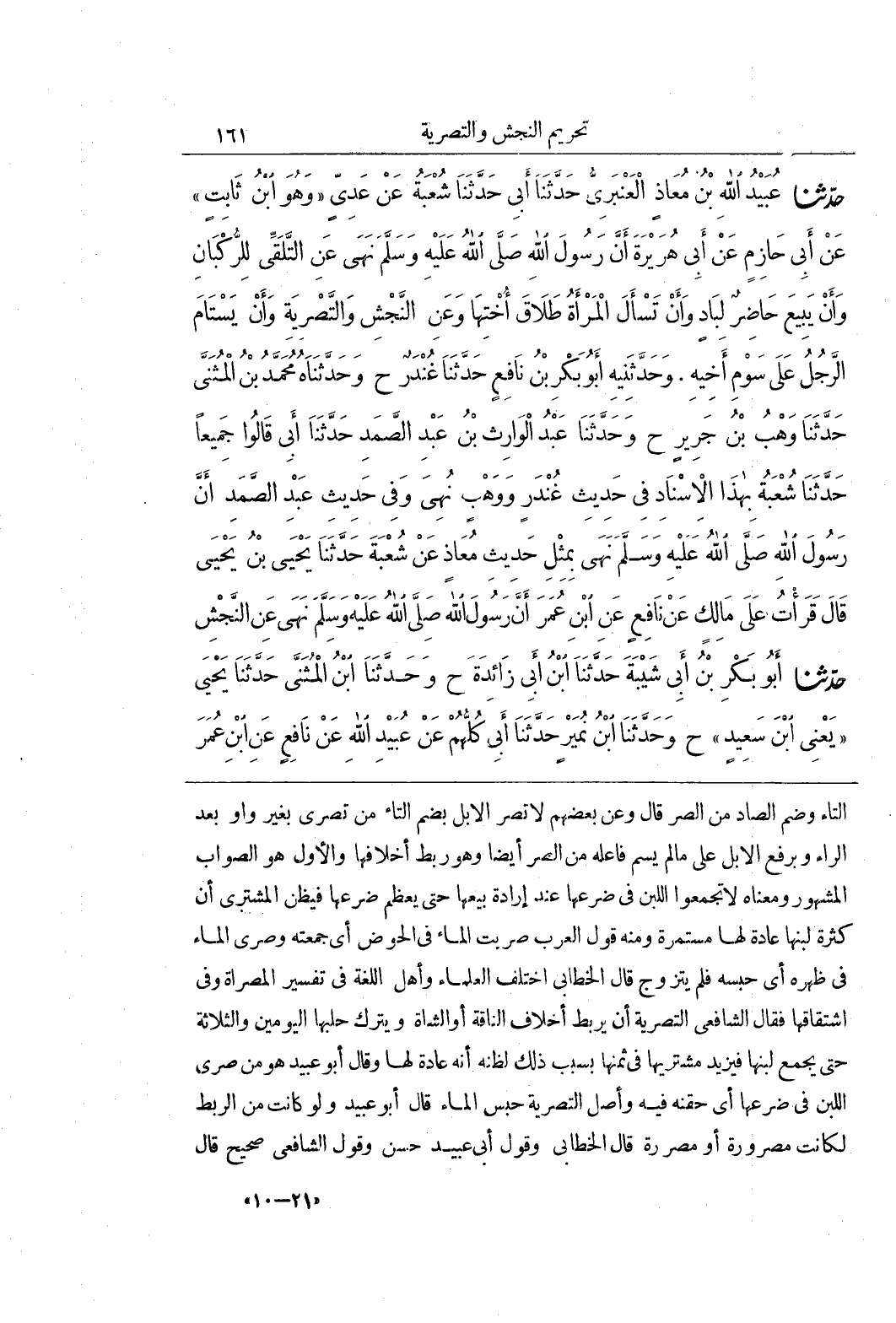 التَّاءِ وَضَمِّ الصَّادِ مِنَ الصَّرِّ قَالَ وَعَنْ بَعْضِهِمْ لَا تُصَرُّ الْإِبِلُ بِضَمِّ التَّاءِ مِنْ تُصْرَّى بِغَيْرِ وَاوٍ بَعْدَ الرَّاءِ وَبِرَفْعِ الْإِبِلِ عَلَى مَا لَمْ يُسَمَّ فَاعِلُهُ مِنَ الصِّرِّ أَيْضًا وَهُوَ رَبْطُ أَخْلَافِهَا وَالْأَوَّلُ هُوَ الصَّوَابُ الْمَشْهُورُ وَمَعْنَاهُ لَا تَجْمَعُوا اللَّبَنَ فِي ضَرْعِهَا عِنْدَ إِرَادَةِ بَيْعِهَا حَتَّى يَعْظُمَ ضَرْعُهَا فَيَظُنَّ الْمُشْتَرِي أَنَّ كَثْرَةَ لَبَنِهَا عَادَةٌ لَهَا مُسْتَمِرَّةٌ ومنه قول العرب صربت الْمَاءَ فِي الْحَوْضِ أَيْ جَمَعْتُهُ وَصَرَّى الْمَاءَ فِي ظَهْرِهِ أَيْ حَبَسَهُ فَلَمْ يَتَزَوَّجْ قَالَ الْخَطَّابِيُّ اخْتَلَفَ الْعُلَمَاءُ وَأَهْلُ اللُّغَةِ فِي تَفْسِيرِ الْمُصَرَّاةِ وَفِي اشْتِقَاقِهَا فَقَالَ الشَّافِعِيُّ التَّصْرِيَةُ أَنْ يَرْبِطَ أَخْلَافَ النَّاقَةِ أَوِ الشَّاةِ وَيَتْرُكَ حَلْبَهَا الْيَوْمَيْنِ وَالثَّلَاثَةَ حَتَّى يَجْمَعَ لَبَنَهَا فَيَزِيدَ مُشْتَرِيهَا فِي ثَمَنِهَا بِسَبَبِ ذَلِكَ لِظَنِّهِ أَنَّهُ عَادَةٌ لَهَا وَقَالَ أَبُو عُبَيْدٍ هُوَ مِنْ صَرَّى اللَّبَنَ فِي ضَرْعِهَا أَيْ حَقَنَهُ فِيهِ وَأَصْلُ التَّصْرِيَةِ حَبْسُ الْمَاءِ قَالَ أَبُو عُبَيْدٍ وَلَوْ كَانَتْ مِنَ الرَّبْطِ لَكَانَتْ مَصْرُورَةً أَوْ مُصَرَّرَةً قَالَ الْخَطَّابِيُّ وَقَوْلُ أَبِي عُبَيْدٍ حَسَنٌ وَقَوْلُ الشَّافِعِيِّ صَحِيحٌ قَالَ