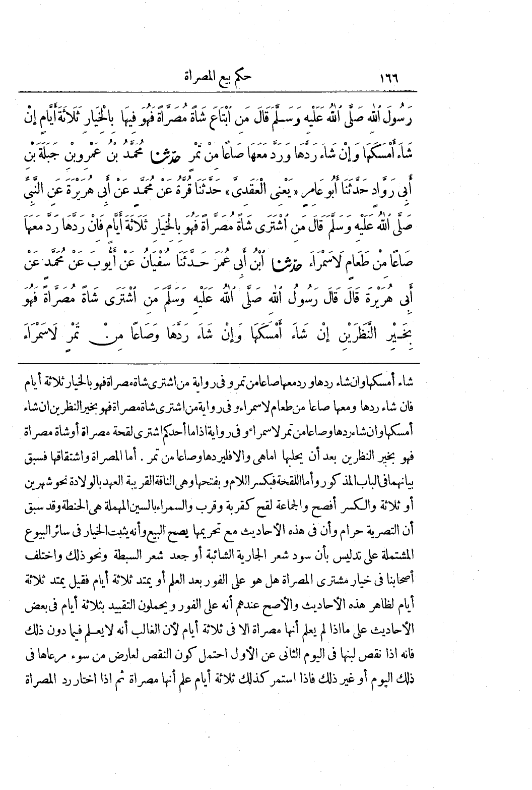 شَاءَ أَمْسَكَهَا وَإِنْ شَاءَ رَدَّهَا وَرَدَّ مَعَهَا صَاعًا مِنْ تَمْرٍ وَفِي رِوَايَةٍ مَنِ اشْتَرَى شَاةً مُصَرَّاةً فَهُوَ بِالْخِيَارِ ثَلَاثَةَ أَيَّامٍ فَإِنْ شَاءَ رَدَّهَا وَمَعَهَا صَاعًا مِنْ طَعَامٍ لَا سَمْرَاءَ وَفِي رِوَايَةٍ مَنِ اشْتَرَى شَاةً مُصَرَّاةً فَهُوَ بِخَيْرِ النَّظَرَيْنِ إِنْ شَاءَ أَمْسَكَهَا وَإِنْ شَاءَ رَدَّهَا وَصَاعًا مِنْ تَمْرٍ لَا سَمْرَاءَ وَفِي رِوَايَةٍ إِذَا مَا أَحَدُكُمُ اشْتَرَى لَقِحَةً مُصَرَّاةً أَوْ شَاةً مُصَرَّاةً فَهُوَ بِخَيْرِ النَّظَرَيْنِ بَعْدَ أَنْ يَحْلُبَهَا إِمَّا هِيَ وَإِلَّا فَلْيَرُدَّهَا وَصَاعًا مِنْ تَمْرٍ أَمَّا الْمُصَرَّاةُ وَاشْتِقَاقُهَا فَسَبَقَ أَنَّ التَّصْرِيَةَ حَرَامٌ وَأَنَّ فِي هَذِهِ الْأَحَادِيثِ مَعَ تَحْرِيمِهَا يَصِحُّ الْبَيْعُ وَأَنَّهُ يَثْبُتُ الْخِيَارُ فِي سَائِرِ الْبُيُوعِ الْمُشْتَمِلَةِ عَلَى تَدْلِيسٍ بِأَنْ سَوَّدَ شَعْرَ الْجَارِيَةِ الشَّائِبَةِ أَوْ جَعَّدَ شَعْرَ السَّبْطَةِ وَنَحْوَ ذَلِكَ وَاخْتَلَفَ أَصْحَابُنَا فِي خِيَارِ مُشْتَرِي الْمُصَرَّاةِ هَلْ هُوَ عَلَى الْفَوْرِ بَعْدَ الْعِلْمِ أَوْ يَمْتَدُّ ثَلَاثَةَ أَيَّامٍ فَقِيلَ يَمْتَدُّ ثَلَاثَةَ أَيَّامٍ لِظَاهِرِ هَذِهِ الْأَحَادِيثِ وَالْأَصَحُّ عِنْدَهُمْ أَنَّهُ عَلَى الْفَوْرِ وَيَحْمِلُونَ التَّقْيِيدَ بِثَلَاثَةِ أَيَّامٍ فِي بَعْضِ الْأَحَادِيثِ عَلَى مَا إِذَا لَمْ يَعْلَمْ أَنَّهَا مُصَرَّاةٌ إِلَّا فِي ثَلَاثَةِ أَيَّامٍ لِأَنَّ الْغَالِبَ أَنَّهُ لَا يُعْلَمُ فِيمَا دُونَ ذَلِكَ فَإِنَّهُ إِذَا نَقَصَ لَبَنُهَا فِي الْيَوْمِ الثَّانِي عَنِ الْأَوَّلِ احْتُمِلَ كَوْنُ النَّقْصِ لِعَارِضٍ مِنْ سُوءِ مَرْعَاهَا فِي ذَلِكَ الْيَوْمِ أَوْ غَيْرِ ذَلِكَ فَإِذَا اسْتَمَرَّ كَذَلِكَ ثَلَاثَةَ أَيَّامٍ عُلِمَ أَنَّهَا مُصَرَّاةٌ ثُمَّ إِذَا اخْتَارَ رَدَّ المصراة