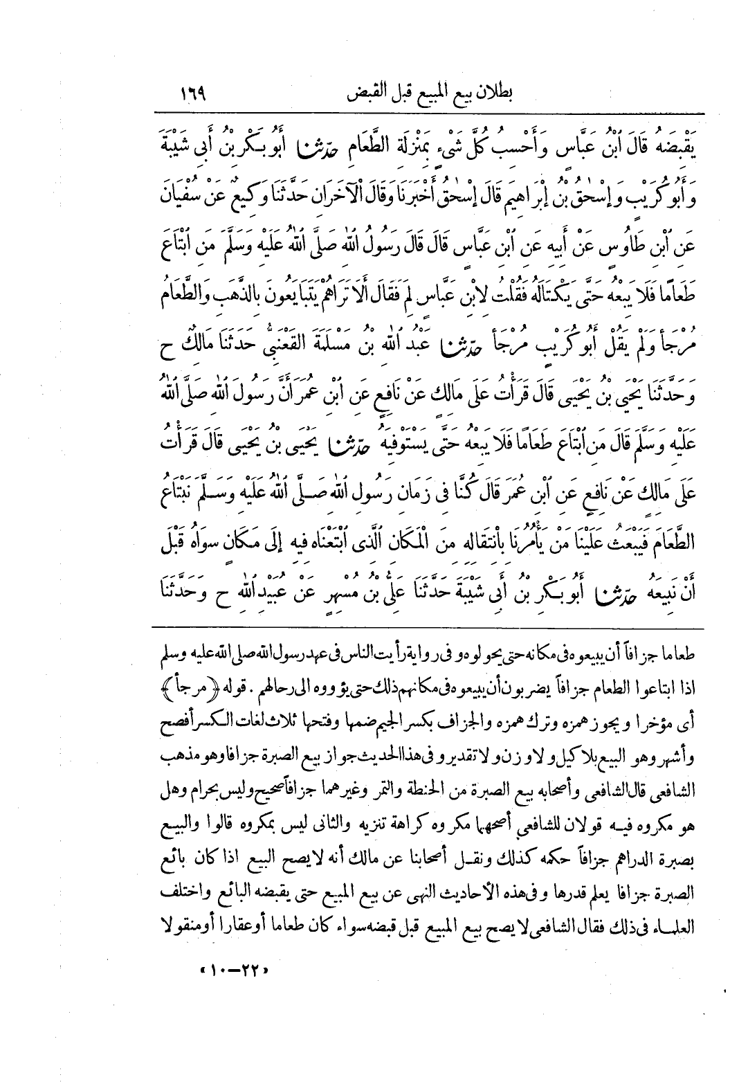 طَعَامًا جِزَافًا أَنْ يَبِيعُوهُ فِي مَكَانِهِ حَتَّى يُحَوِّلُوهُ وَفِي رِوَايَةٍ رَأَيْتُ النَّاسَ فِي عَهْدِ رسول اببه صَلَّى اللَّهُ عَلَيْهِ وَسَلَّمَ إِذَا ابْتَاعُوا الطَّعَامَ جِزَافًا يَضْرِبُونَ أَنْ يَبِيعُوهُ فِي مَكَانِهِمْ ذَلِكَ حَتَّى يُؤْوُوهُ إِلَى رِحَالِهِمْ قَوْلُهُ (مُرْجَأً) أَيْ مُؤَخَّرًا وَيَجُوزُ هَمْزُهُ وَتَرْكُ هَمْزِهِ وَالْجِزَافُ بِكَسْرِ الجيم ضمها وَفَتْحِهَا ثَلَاثُ لُغَاتٍ الْكَسْرُ أَفْصَحُ وَأَشْهَرُ وَهُوَ الْبَيْعُ بِلَا كَيْلٍ وَلَا وَزْنٍ وَلَا تَقْدِيرٍ وَفِي هَذَا الْحَدِيثِ جَوَازُ بَيْعِ الصُّبْرَةِ جِزَافًا وَهُوَ مَذْهَبُ الشَّافِعِيِّ قَالَ الشَّافِعِيُّ وَأَصْحَابُهُ بَيْعُ الصُّبْرَةِ مِنَ الْحِنْطَةِ وَالتَّمْرِ وَغَيْرِهِمَا جِزَافًا صَحِيحٌ وَلَيْسَ بِحَرَامٍ وَهَلْ هُوَ مَكْرُوهٌ فِيهِ قَوْلَانِ لِلشَّافِعِيِّ أَصَحُّهُمَا مَكْرُوهٌ كَرَاهَةَ تَنْزِيهٍ وَالثَّانِي لَيْسَ بِمَكْرُوهٍ قَالُوا وَالْبَيْعُ بِصُبْرَةِ الدَّرَاهِمِ جِزَافًا حُكْمُهُ كَذَلِكَ وَنَقَلَ أَصْحَابُنَا عَنْ مَالِكٍ أَنَّهُ لَا يَصِحُّ الْبَيْعُ إِذَا كَانَ بَائِعُ الصُّبْرَةِ جِزَافًا يَعْلَمُ قَدْرَهَا وفِي هَذِهِ الْأَحَادِيثِ النَّهْيُ عَنْ بَيْعِ الْمَبِيعِ حَتَّى يَقْبِضَهُ الْبَائِعُ وَاخْتَلَفَ الْعُلَمَاءُ فِي ذَلِكَ فَقَالَ الشَّافِعِيُّ لَا يَصِحُّ بَيْعُ الْمَبِيعِ قَبْلَ قَبْضِهِ سَوَاءٌ كَانَ طَعَامًا أَوْ عَقَارًا أَوْ مَنْقُولًا