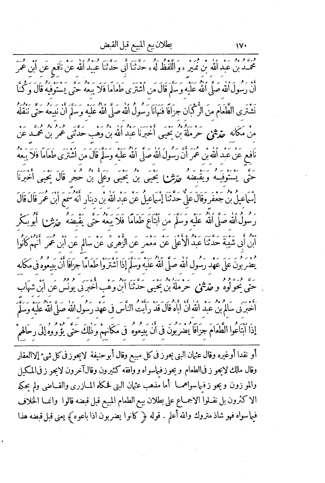 أَوْ نَقْدًا أَوْ غَيْرَهُ وَقَالَ عُثْمَانُ الْبَتِّيُّ يَجُوزُ فِي كُلِّ مَبِيعٍ وَقَالَ أَبُو حَنِيفَةَ لا يَجُوزُ فِي كُلِّ شَيْءٍ إِلَّا الْعَقَارَ وَقَالَ مَالِكٌ لَا يَجُوزُ فِي الطَّعَامِ وَيَجُوزُ فِيمَا سِوَاهُ وَوَافَقَهُ كَثِيرُونَ وَقَالَ آخَرُونَ لَا يَجُوزُ فِي الْمَكِيلِ وَالْمَوْزُونِ وَيَجُوزُ فِيمَا سِوَاهُمَا أَمَّا مَذْهَبُ عُثْمَانَ الْبَتِّيِّ فَحَكَاهُ الْمَازِرِيُّ وَالْقَاضِي وَلَمْ يحكه الا كثرون بَلْ نَقَلُوا الْإِجْمَاعَ عَلَى بُطْلَانِ بَيْعِ الطَّعَامِ المبيع قبل قبضه قالوا وإنما الْخِلَافُ فِيمَا سِوَاهُ فَهُوَ شَاذٌّ مَتْرُوكٌ وَاللَّهُ أَعْلَمُ قَوْلُهُ (كَانُوا يُضْرَبُونَ إِذَا بَاعُوهُ) يَعْنِي قَبْلَ قَبْضِهِ هَذَا