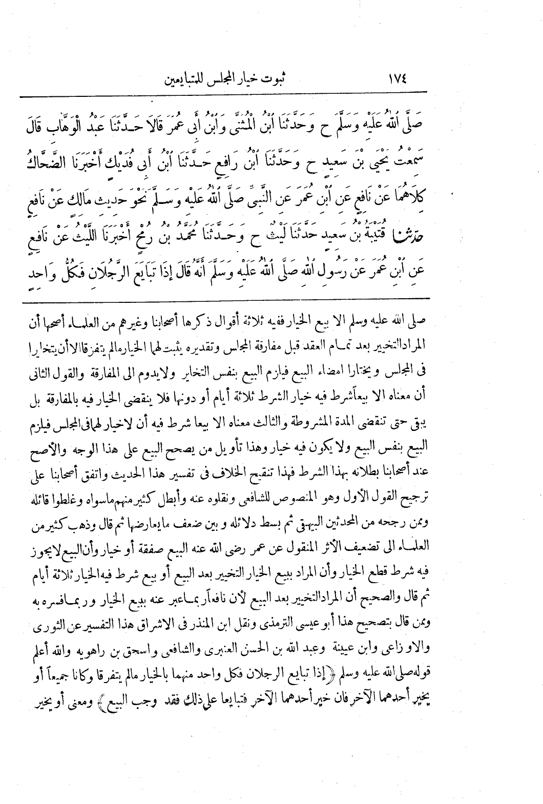 (إِلَّا بَيْعَ الْخِيَارِ ففيه ثَلَاثَةُ أَقْوَالٍ ذَكَرَهَا أَصْحَابُنَا وَغَيْرُهُمْ مِنَ الْعُلَمَاءِ وأصحها أَنَّ الْمُرَادَ التَّخْيِيرُ بَعْدَ تَمَامِ الْعَقْدِ قَبْلَ مُفَارَقَةِ الْمَجْلِسِ وَتَقْدِيرُهُ يَثْبُتُ لَهُمَا الْخِيَارُ مَا لَمْ يَتَفَرَّقَا إِلَّا أَنْ يَتَخَايَرَا فِي الْمَجْلِسِ وَيَخْتَارَا إِمْضَاءَ الْبَيْعِ فَيَلْزَمَ الْبَيْعُ بِنَفْسِ التَّخَايُرِ وَلَا يَدُومُ إِلَى الْمُفَارَقَةِ وَالْقَوْلُ الثَّانِي أَنَّ مَعْنَاهُ إِلَّا بَيْعًا شُرِطَ فِيهِ خِيَارُ الشَّرْطِ ثَلَاثَةَ أَيَّامٍ أَوْ دُونَهَا فَلَا يَنْقَضِي الْخِيَارُ فِيهِ بِالْمُفَارَقَةِ بَلْ يَبْقَى حَتَّى تَنْقَضِيَ الْمُدَّةُ الْمَشْرُوطَةُ وَالثَّالِثُ مَعْنَاهُ إِلَّا بَيْعًا شُرِطَ فِيهِ أن لا خِيَارَ لَهُمَا فِي الْمَجْلِسِ فَيَلْزَمُ الْبَيْعُ بِنَفْسِ الْبَيْعِ وَلَا يَكُونُ فِيهِ خِيَارٌ وَهَذَا تَأْوِيلُ مَنْ يُصَحِّحُ الْبَيْعَ عَلَى هَذَا الْوَجْهِ وَالْأَصَحُّ عِنْدَ أَصْحَابِنَا بُطْلَانُهُ بِهَذَا الشَّرْطِ فَهَذَا تَنْقِيحُ الْخِلَافِ فِي تَفْسِيرِ هَذَا الْحَدِيثِ وَاتَّفَقَ أَصْحَابُنَا عَلَى تَرْجِيحِ الْقَوْلِ الْأَوَّلِ وَهُوَ الْمَنْصُوصُ لِلشَّافِعِيِّ وَنَقَلُوهُ عَنْهُ وَأَبْطَلَ كَثِيرٌ مِنْهُمْ مَا سِوَاهُ وَغَلَّطُوا قَائِلَهُ وَمِمَّنْ رَجَّحَهُ مِنَ الْمُحَدِّثِينَ الْبَيْهَقِيُّ ثُمَّ بَسَطَ دَلَائِلَهُ وَبَيَّنَ ضَعْفَ مَا يُعَارِضُهَا ثُمَّ قَالَ وَذَهَبَ كَثِيرٌ مِنَ الْعُلَمَاءِ إِلَى تَضْعِيفِ الْأَثَرِ الْمَنْقُولِ عَنْ عُمَرَ رَضِيَ اللَّهُ عَنْهُ الْبَيْعُ صَفْقَةٌ أَوْ خِيَارٌ وَأَنَّ الْبَيْعَ لَا يَجُوزُ فِيهِ شَرْطُ قَطْعِ الْخِيَارِ وَأَنَّ الْمُرَادَ بِبَيْعِ الْخِيَارِ التَّخْيِيرُ بَعْدَ الْبَيْعِ أَوْ بيعٌ شُرِطَ فِيهِ الْخِيَارُ ثَلَاثَةَ أَيَّامٍ ثُمَّ قَالَ وَالصَّحِيحُ أَنَّ الْمُرَادَ التَّخْيِيرُ بَعْدَ الْبَيْعِ لِأَنَّ نَافِعًا رُبَّمَا عَبَّرَ عَنْهُ بِبَيْعِ الْخِيَارِ وَرُبَّمَا فَسَّرَهُ بِهِ وَمِمَّنْ قَالَ بِتَصْحِيحِ هَذَا أبو عيسى الترمذى ونقل بن الْمُنْذِرِ فِي الْإِشْرَاقِ هَذَا التَّفْسِيرَ عَنِ الثَّوْرِيِّ والاوزاعى وبن عُيَيْنَةَ وَعَبْدِ اللَّهِ بْنِ الْحَسَنِ الْعَنْبَرِيِّ وَالشَّافِعِيِّ وَإِسْحَاقَ بْنِ رَاهَوَيْهِ وَاللَّهُ أَعْلَمُ قَوْلُهُ صَلَّى اللَّهُ عَلَيْهِ وَسَلَّمَ (إِذَا تَبَايَعَ الرَّجُلَانِ فَكُلُّ وَاحِدٍ مِنْهُمَا بِالْخِيَارِ مَا لَمْ يَتَفَرَّقَا وَكَانَا جَمِيعًا أَوْ يُخَيِّرُ أَحَدُهُمَا الْآخَرَ فَإِنْ خَيَّرَ أَحَدُهُمَا الْآخَرَ فَتَبَايَعَا عَلَى ذَلِكَ فَقَدْ وَجَبَ الْبَيْعُ) وَمَعْنَى أَوْ يُخَيِّرُ)