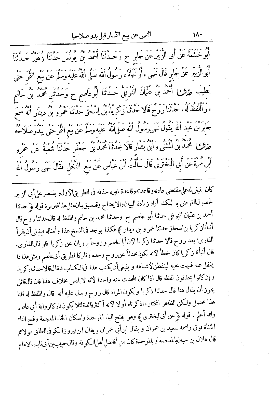 كَانَ يَنْبَغِي لَهُ عَلَى مُقْتَضَى عَادَتِهِ وَقَاعِدَتِهِ وَقَاعِدَةِ غَيْرِهِ حَذْفُهُ فِي الطَّرِيقِ الْأَوَّلِ وَيَقْتَصِرُ عَلَى أَبِي الزُّبَيْرِ لِحُصُولِ الْغَرَضِ بِهِ لَكِنَّهُ أَرَادَ زِيَادَةَ الْبَيَانِ وَالْإِيضَاحِ وَقَدْ سَبَقَ بَيَانُ مِثْلِ هَذَا غَيْرَ مَرَّةٍ قَوْلُهُ (حَدَّثَنَا أَحْمَدُ بْنُ عُثْمَانَ النَّوْفَلِيُّ حَدَّثَنَا أَبُو عَاصِمٍ ح وَحَدَّثَنَا مُحَمَّدُ بْنُ حَاتِمٍ وَاللَّفْظُ لَهُ قَالَ حدثنا روح قال أنبأنا زكريا بْنُ إِسْحَاقَ حَدَّثَنَا عَمْرُو بْنُ دِينَارٍ) هَكَذَا يُوجَدُ فِي النُّسَخِ هَذَا وَأَمْثَالُهُ فَيَنْبَغِي أَنْ يقرأ القارئ بعد روح قالا حدثنا زكريا لأن أبا عاصم وروحا يرويان عن زكريا فلو قال القارئ قال أنبأنا زكريا كَانَ خَطَأً لِأَنَّهُ يَكُونُ مُحَدِّثًا عَنْ رَوْحٍ وَحْدِهِ وَتَارِكًا لِطَرِيقِ أَبِي عَاصِمٍ وَمِثْلُ هَذَا مِمَّا يُغْفَلُ عَنْهُ فَنَبَّهْتُ عَلَيْهِ لِيُتَفَطَّنَ لِأَشْبَاهِهِ وَيَنْبَغِي أَنْ يُكْتَبَ هَذَا فِي الْكِتَابِ فَيُقَالَ قالا حدثنا زكريا وَإِنْ كَانُوا يَحْذِفُونَ لَفْظَهُ قَالَ إِذَا كَانَ الْمُحَدِّثُ عَنْهُ وَاحِدًا لِأَنَّهُ لَا يُلْبَسُ بِخِلَافِ هَذَا فَإِنْ قَالَ قَائِلٌ يَجُوزُ أَنْ يُقَالَ هنا قال حدثنا زكريا وَيَكُونَ الْمُرَادُ قَالَ رَوْحٌ وَيَدُلُّ عَلَيْهِ أَنَّهُ قَالَ وَاللَّفْظُ لَهُ قُلْنَا هَذَا مُحْتَمَلٌ وَلَكِنَّ الظَّاهِرَ الْمُخْتَارَ مَا ذَكَرْنَاهُ أَوَّلًا لِأَنَّهُ أَكْثَرُ فَائِدَةً لِئَلَّا يَكُونَ تَارِكًا لِرِوَايَةِ أَبِي عَاصِمٍ وَاللَّهُ أَعْلَمُ