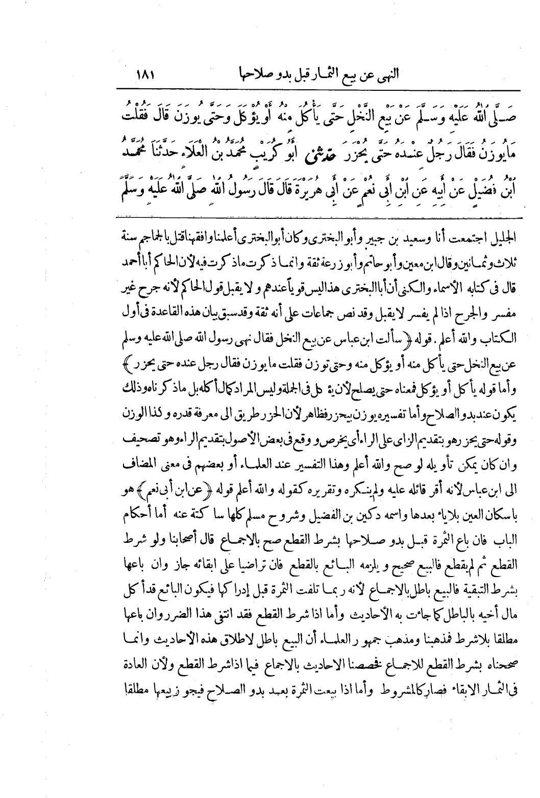 الْجَلِيلُ اجْتَمَعْتُ أَنَا وَسَعِيدُ بْنُ جُبَيْرٍ وَأَبُو الْبَخْتَرِيِّ وَكَانَ أَبُو الْبَخْتَرِيِّ أَعْلَمَنَا وَأَفْقَهَنَا قُتِلَ بالجماجم سنة ثلاث وثمانين وقال بن مَعِينٍ وَأَبُو حَاتِمٍ وَأَبُو زُرْعَةَ ثِقَةٌ وَإِنَّمَا ذَكَرْتُ مَا ذَكَرْتُ فِيهِ لِأَنَّ الْحَاكِمَ أَبَا أَحْمَدَ قَالَ فِي كِتَابِهِ الْأَسْمَاءُ وَالْكُنَى إِنَّ أَبَا الْبَخْتَرِيِّ هَذَا لَيْسَ قَوِيًّا عِنْدَهُمْ وَلَا يُقْبَلُ قَوْلُ الْحَاكِمِ لِأَنَّهُ جَرْحٌ غَيْرُ مُفَسَّرٍ وَالْجَرْحُ إِذَا لَمْ يُفَسَّرْ لَا يُقْبَلُ وَقَدْ نَصَّ جَمَاعَاتٌ عَلَى أَنَّهُ ثِقَةٌ وَقَدْ سَبَقَ بَيَانُ هَذِهِ الْقَاعِدَةِ فِي أَوَّلِ الْكِتَابِ وَاللَّهُ أعلم قوله (سألت بن عَبَّاسٍ عَنْ بَيْعِ النَّخْلِ فَقَالَ نَهَى رَسُولُ اللَّهِ صَلَّى اللَّهُ عَلَيْهِ وَسَلَّمَ عَنْ بَيْعِ النَّخْلِ حَتَّى يَأْكُلَ مِنْهُ أَوْ يُؤْكَلَ مِنْهُ وحتى توزن فقلت ما يوزن فَقَالَ رَجُلٌ عِنْدَهُ حَتَّى يُحْزَرَ) وَأَمَّا قَوْلُهُ يَأْكُلُ أَوْ يُؤْكَلُ فَمَعْنَاهُ حَتَّى يَصْلُحَ لِأَنْ يُؤْكَلَ فِي الْجُمْلَةِ وَلَيْسَ الْمُرَادُ كَمَالَ أَكْلِهِ بَلْ مَا ذَكَرْنَاهُ وَذَلِكَ يَكُونُ عِنْدَ بُدُوِّ الصلاح وأما تفسيره يوزن بيحزر فَظَاهِرٌ لِأَنَّ الْحَزْرَ طَرِيقٌ إِلَى مَعْرِفَةِ قَدْرِهِ وكذا الوزن وقوله حتى يحزر هو بِتَقْدِيمِ الزَّايِ عَلَى الرَّاءِ أَيْ يُخْرَصَ وَوَقَعَ فِي بَعْضِ الْأُصُولِ بِتَقْدِيمِ الرَّاءِ وَهُوَ تَصْحِيفٌ وَإِنْ كَانَ يُمْكِنُ تَأْوِيلُهُ لَوْ صَحَّ وَاللَّهُ أَعْلَمُ وَهَذَا التَّفْسِيرُ عِنْدَ الْعُلَمَاءِ أَوْ بَعْضِهِمْ في معنى المضاف إلى بن عَبَّاسٍ لِأَنَّهُ أَقَرَّ قَائِلَهُ عَلَيْهِ وَلَمْ يُنْكِرْهُ وتقريره كقوله والله أعلم قوله (عن بن أَبِي نُعْمٍ) هُوَ بِإِسْكَانِ الْعَيْنِ بِلَا يَاءَ بَعْدَهَا وَاسْمُهُ دُكَيْنُ بْنُ الْفُضَيْلِ وَشُرُوحُ مُسْلِمٍ كُلُّهَا سَاكِتَةٌ عَنْهُ أَمَّا أَحْكَامُ الْبَابِ فَإِنْ بَاعَ الثَّمَرَةَ قَبْلَ بُدُوِّ صَلَاحِهَا بِشَرْطِ الْقَطْعِ صَحَّ بِالْإِجْمَاعِ قَالَ أَصْحَابُنَا وَلَوْ شَرَطَ الْقَطْعَ ثُمَّ لَمْ يَقْطَعْ فَالْبَيْعُ صَحِيحٌ وَيُلْزِمُهُ الْبَائِعُ بِالْقَطْعِ فَإِنْ تَرَاضَيَا عَلَى إِبْقَائِهِ جَازَ وَإِنْ بَاعَهَا بِشَرْطِ التَّبْقِيَةِ فَالْبَيْعُ بَاطِلٌ بِالْإِجْمَاعِ لِأَنَّهُ رُبَّمَا تَلِفَتِ الثَّمَرَةُ قَبْلَ إِدْرَاكِهَا فَيَكُونُ الْبَائِعُ قَدْ أَكَلَ مَالَ أَخِيهِ بِالْبَاطِلِ كَمَا جَاءَتْ بِهِ الْأَحَادِيثُ وَأَمَّا إِذَا شَرَطَ الْقَطْعَ فَقَدِ انْتَفَى هَذَا الضَّرَرُ وَإِنْ بَاعَهَا مُطْلَقًا بِلَا شَرْطٍ فَمَذْهَبُنَا وَمَذْهَبُ جُمْهُورِ الْعُلَمَاءِ أَنَّ الْبَيْعَ بَاطِلٌ لِإِطْلَاقِ هَذِهِ الْأَحَادِيثِ وَإِنَّمَا صَحَّحْنَاهُ بِشَرْطِ الْقَطْعِ لِلْإِجْمَاعِ فَخَصَّصْنَا الْأَحَادِيثَ بِالْإِجْمَاعِ فِيمَا إِذَا شُرِطَ الْقَطْعُ وَلِأَنَّ الْعَادَةَ فِي الثِّمَارِ الْإِبْقَاءُ فَصَارَ كَالْمَشْرُوطِ وَأَمَّا إِذَا بِيعَتِ الثَّمَرَةُ بَعْدَ بُدُوِّ الصَّلَاحِ فَيَجُوزُ بَيْعُهَا مُطْلَقًا