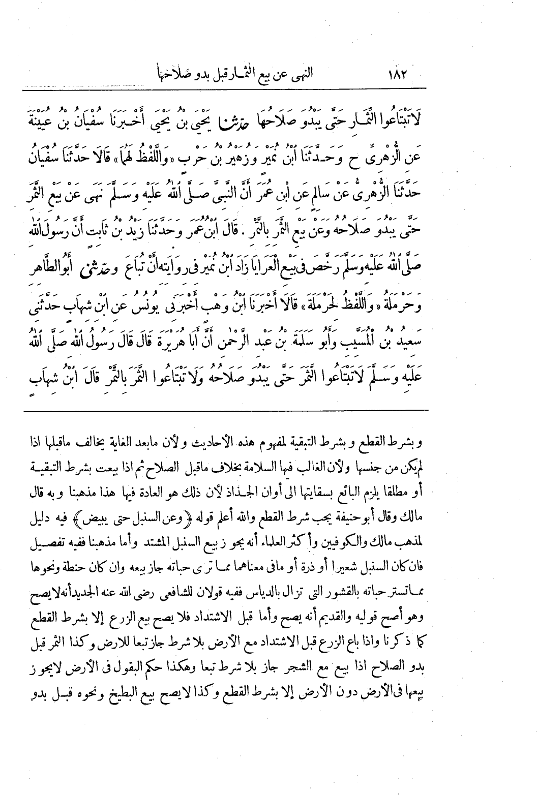 وَبِشَرْطِ الْقَطْعِ وَبِشَرْطِ التَّبْقِيَةِ لِمَفْهُومِ هَذِهِ الْأَحَادِيثِ وَلِأَنَّ مَا بَعْدَ الْغَايَةِ يُخَالِفُ مَا قَبْلَهَا إِذَا لَمْ يَكُنْ مِنْ جِنْسِهَا وَلِأَنَّ الْغَالِبَ فِيهَا السَّلَامَةُ بِخِلَافِ مَا قَبْلَ الصَّلَاحِ ثُمَّ إِذَا بِيعَتْ بِشَرْطِ التَّبْقِيَةِ أَوْ مُطْلَقًا يُلْزَمُ الْبَائِعُ بِسِقَايَتِهَا إِلَى أَوَانِ الْجُذَاذِ لِأَنَّ ذَلِكَ هُوَ الْعَادَةُ فِيهَا هَذَا مَذْهَبُنَا وَبِهِ قَالَ مَالِكٌ وَقَالَ أَبُو حَنِيفَةَ يَجِبُ شَرْطُ الْقَطْعِ وَاللَّهُ أَعْلَمُ قَوْلُهُ (وَعَنِ السُّنْبُلِ حَتَّى يَبْيَضَّ) فِيهِ دَلِيلٌ لِمَذْهَبِ مَالِكٍ وَالْكُوفِيِّينَ وَأَكْثَرِ الْعُلَمَاءِ أَنَّهُ يَجُوزُ بَيْعُ السُّنْبُلِ الْمُشْتَدِّ وَأَمَّا مَذْهَبُنَا فَفِيهِ تَفْصِيلٌ فَإِنْ كَانَ السُّنْبُلُ شَعِيرًا أَوْ ذُرَةً أَوْ مَا فِي مَعْنَاهُمَا مِمَّا تُرَى حَبَّاتُهُ جَازَ بَيْعُهُ وَإِنْ كَانَ حِنْطَةً وَنَحْوَهَا مِمَّا تُسْتَرُ حَبَّاتُهُ بِالْقُشُورِ الَّتِي تُزَالُ بِالدِّيَاسِ فَفِيهِ قَوْلَانِ لِلشَّافِعِيِّ رَضِيَ اللَّهُ عَنْهُ الْجَدِيدُ أَنَّهُ لَا يَصِحُّ وَهُوَ أَصَحُّ قَوْلَيْهِ وَالْقَدِيمُ أَنَّهُ يَصِحُّ وَأَمَّا قَبْلَ الِاشْتِدَادِ فَلَا يَصِحُّ بَيْعُ الزَّرْعِ إِلَّا بِشَرْطِ الْقَطْعِ كَمَا ذَكَرْنَا وَإِذَا بَاعَ الزَّرْعَ قَبْلَ الِاشْتِدَادِ مَعَ الْأَرْضِ شَرْطٍ جَازَ تَبَعًا لِلْأَرْضِ وَكَذَا الثَّمَرُ قَبْلَ بُدُوِّ الصَّلَاحِ إِذَا بِيعَ مَعَ الشَّجَرِ جَازَ بلا شرط تبعا ونكذا حُكْمُ الْبُقُولِ فِي الْأَرْضِ لَا يَجُوزُ بَيْعُهَا فِي الْأَرْضِ دُونَ الْأَرْضِ إِلَّا بِشَرْطِ الْقَطْعِ وَكَذَا لَا يَصِحُّ بَيْعُ الْبِطِّيخِ وَنَحْوِهِ قَبْلَ بدو