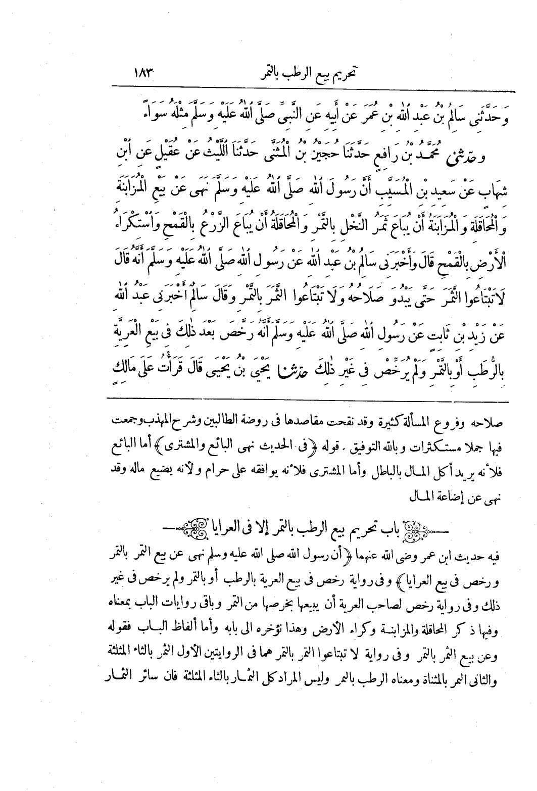 (باب تحريم بيع الرطب بالتمر إلا في العرايا فيه حديث بن عُمَرَ رَضِيَ اللَّهُ عَنْهُمَا (أَنَّ رَسُولَ اللَّهِ صَلَّى اللَّهُ عَلَيْهِ وَسَلَّمَ نَهَى عَنْ بَيْعِ التَّمْرِ بِالتَّمْرِ وَرَخَّصَ فِي بَيْعِ الْعَرَايَا) وَفِي رِوَايَةٍ رَخَّصَ فِي بَيْعِ الْعَرِيَّةِ بِالرُّطَبِ أَوْ بِالتَّمْرِ وَلَمْ يُرَخِّصْ فِي غَيْرِ ذَلِكَ وَفِي رِوَايَةٍ رَخَّصَ لِصَاحِبِ الْعَرِيَّةِ أَنْ يَبِيعَهَا بِخَرْصِهَا مِنَ التَّمْرِ وَبَاقِي رِوَايَاتِ الْبَابِ بِمَعْنَاهُ وَفِيهَا ذِكْرُ الْمُحَاقَلَةِ وَالْمُزَابَنَةِ وَكِرَاءِ الْأَرْضِ وَهَذَا نُؤَخِّرُهُ إِلَى بَابِهِ وَأَمَّا أَلْفَاظُ الْبَابِ فَقَوْلُهُ وَعَنْ بَيْعِ الثَّمَرِ بِالتَّمْرِ وَفِي رِوَايَةٍ لَا تَبْتَاعُوا التَّمْرَ بِالتَّمْرِ هُمَا فِي الرِّوَايَتَيْنِ الْأَوَّلُ الثَّمَرُ بِالثَّاءِ الْمُثَلَّثَةِ وَالثَّانِي التَّمْرُ بِالْمُثَنَّاةِ وَمَعْنَاهُ الرُّطَبُ بِالتَّمْرِ وَلَيْسَ الْمُرَادُ كُلَّ الثِّمَارِ بِالثَّاءِ الْمُثَلَّثَةِ فَإِنَّ سَائِرَ الثِّمَارِ)