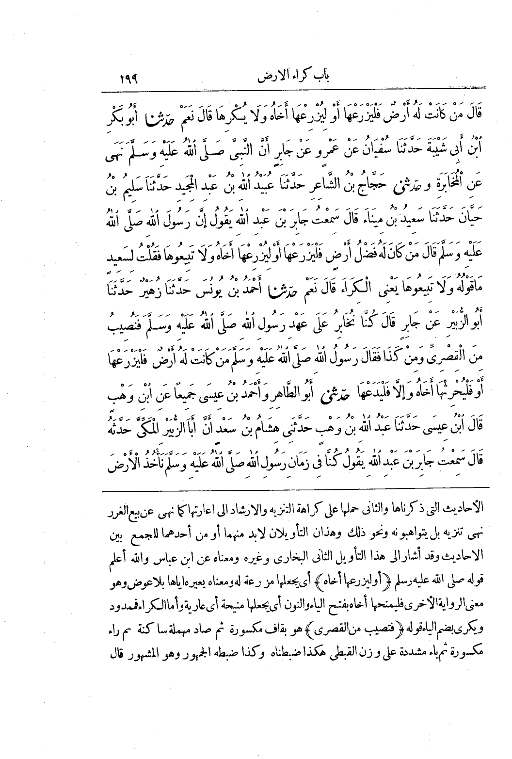 الْأَحَادِيثِ الَّتِي ذَكَرْنَاهَا وَالثَّانِي حَمْلُهَا عَلَى كَرَاهَةِ التَّنْزِيهِ وَالْإِرْشَادِ إِلَى إِعَارَتِهَا كَمَا نَهَى عَنْ بَيْعِ الْغَرَرِ نَهْيَ تَنْزِيهٍ بَلْ يَتَوَاهَبُونَهُ وَنَحْوَ ذلك وهذان التأولان لابد مِنْهُمَا أَوْ مِنْ أَحَدِهِمَا لِلْجَمْعِ بَيْنَ الْأَحَادِيثِ وَقَدْ أَشَارَ إِلَى هَذَا التَّأْوِيلِ الثَّانِي الْبُخَارِيُّ وغيره ومعناه عن بن عَبَّاسٍ وَاللَّهُ أَعْلَمُ قَوْلُهُ صَلَّى اللَّهُ عَلَيْهِ وَسَلَّمَ (أوليزرعها أَخَاهُ) أَيْ يَجْعَلْهَا مَزْرَعَةً لَهُ وَمَعْنَاهُ يُعِيرُهُ إِيَّاهَا بِلَا عِوَضٍ وَهُوَ مَعْنَى الرِّوَايَةِ الْأُخْرَى فَلْيَمْنَحْهَا أَخَاهُ بِفَتْحِ الْيَاءِ وَالنُّونِ أَيْ يَجْعَلُهَا مَنِيحَةً أَيْ عَارِيَةً وَأَمَّا الْكِرَاءُ فَمَمْدُودٌ وَيُكْرِي بِضَمِّ الْيَاءِ قَوْلُهُ (فَتُصِيبُ مِنَ الْقِصْرِيِّ) هُوَ بِقَافٍ مَكْسُورَةٍ ثُمَّ صَادٍ مُهْمَلَةٍ سَاكِنَةٍ ثُمَّ رَاءٍ مَكْسُورَةٍ ثُمَّ يَاءٍ مُشَدَّدَةٍ عَلَى وَزْنِ الْقِبْطِيِّ هَكَذَا ضَبَطْنَاهُ وَكَذَا ضَبَطَهُ الْجُمْهُورُ وَهُوَ المشهور قال