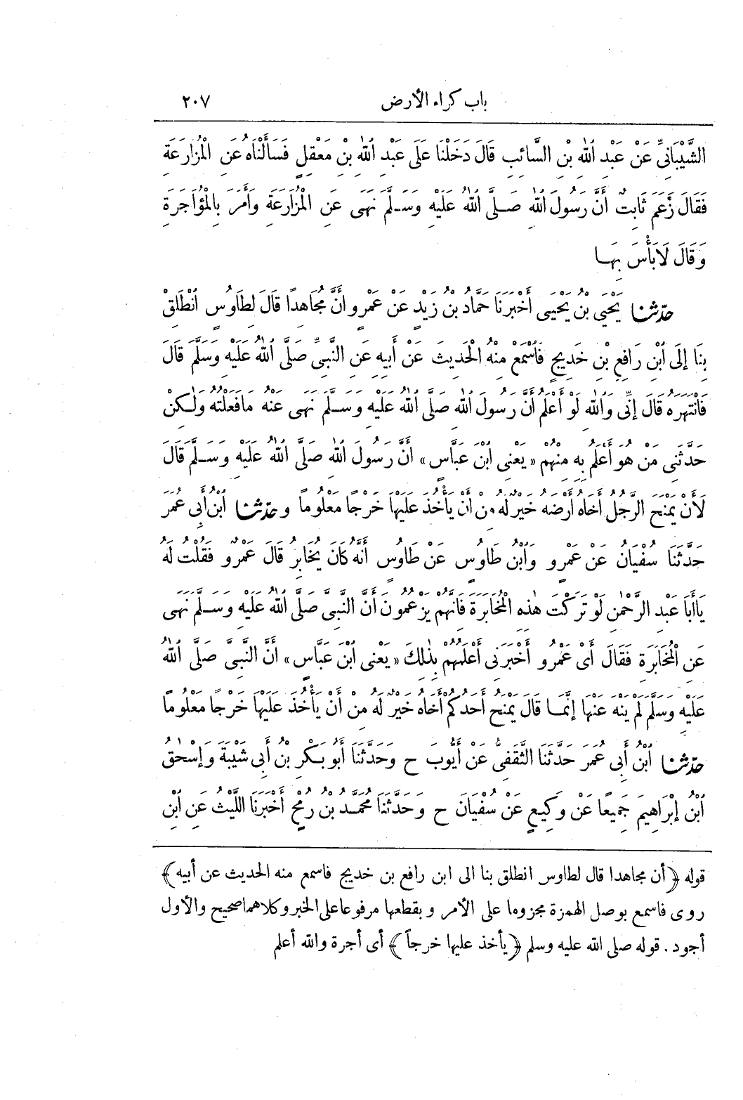 [1550] قَوْلُهُ (إِنَّ مُجَاهِدًا قَالَ لِطَاوُسٍ انْطَلِقْ بِنَا إلى بن رَافِعِ بْنِ خَدِيجٍ فَاسْمَعْ مِنْهُ الْحَدِيثَ عَنْ أَبِيهِ) رُوِيَ فَاسْمَعْ بِوَصْلِ الْهَمْزَةِ مَجْزُومًا عَلَى الْأَمْرِ وَبِقَطْعِهَا مَرْفُوعًا عَلَى الْخَبَرِ وَكِلَاهُمَا صَحِيحٌ وَالْأَوَّلُ أَجْوَدُ قَوْلُهُ صَلَّى اللَّهُ عَلَيْهِ وَسَلَّمَ (يَأْخُذُ عَلَيْهَا خَرْجًا) أَيْ أُجْرَةً وَاللَّهُ أَعْلَمُ