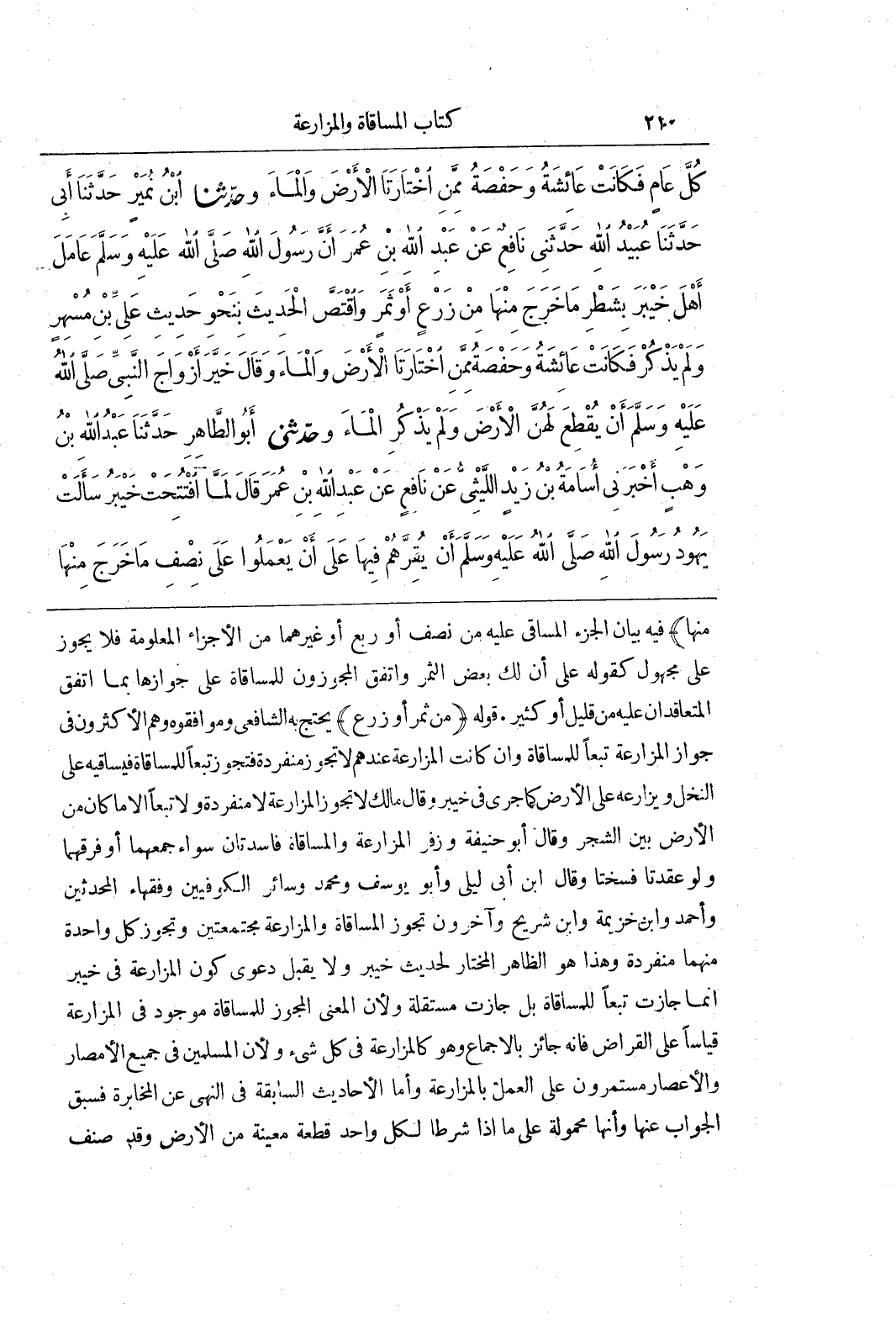 منها) فيه بَيَانِ الْجُزْءِ الْمُسَاقَى عَلَيْهِ مِنْ نِصْفٍ أَوْ رُبُعٍ أَوْ غَيْرِهِمَا مِنَ الْأَجْزَاءِ الْمَعْلُومَةِ فَلَا يجوز على مجهول كقوله على أن لك بَعْضُ الثَّمَرِ وَاتَّفَقَ الْمُجَوِّزُونَ لِلْمُسَاقَاةِ عَلَى جَوَازِهَا بِمَا اتَّفَقَ الْمُتَعَاقِدَانِ عَلَيْهِ مِنْ قَلِيلٍ أَوْ كَثِيرٍ قَوْلُهُ (مِنْ ثَمَرٍ أَوْ زَرْعٍ) يَحْتَجُّ بِهِ الشَّافِعِيُّ وَمُوَافِقُوهُ وَهُمُ الْأَكْثَرُونَ فِي جَوَازِ الْمُزَارَعَةِ تَبَعًا لِلْمُسَاقَاةِ وَإِنْ كَانَتِ الْمُزَارَعَةُ عِنْدَهُمْ لَا تَجُوزُ مُنْفَرِدَةً فَتَجُوزُ تَبَعًا لِلْمُسَاقَاةِ فَيُسَاقِيهِ عَلَى النَّخْلِ وَيُزَارِعُهُ عَلَى الْأَرْضِ كَمَا جَرَى فِي خَيْبَرَ وَقَالَ مَالِكٌ لَا تَجُوزُ الْمُزَارَعَةُ لَا مُنْفَرِدَةً وَلَا تَبَعًا إِلَّا مَا كَانَ مِنَ الْأَرْضِ بَيْنَ الشَّجَرِ وَقَالَ أَبُو حَنِيفَةَ وَزُفَرُ الْمُزَارَعَةُ وَالْمُسَاقَاةُ فَاسِدَتَانِ سَوَاءٌ جَمَعَهُمَا أَوْ فرقهما ولو عقدتا فسختا وقال بن أَبِي لَيْلَى وَأَبُو يُوسُفَ وَمُحَمَّدٌ وَسَائِرُ الْكُوفِيِّينَ وفقهاء المحدثين وأحمد وبن خزيمة وبن شُرَيْحٍ وَآخَرُونَ تَجُوزُ الْمُسَاقَاةُ وَالْمُزَارَعَةُ مُجْتَمِعَتَيْنِ وَتَجُوزُ كُلُّ وَاحِدَةٍ مِنْهُمَا مُنْفَرِدَةً وَهَذَا هُوَ الظَّاهِرُ الْمُخْتَارُ لِحَدِيثِ خَيْبَرَ وَلَا يُقْبَلُ دَعْوَى كَوْنِ الْمُزَارَعَةِ فِي خَيْبَرَ إِنَّمَا جَازَتْ تَبَعًا لِلْمُسَاقَاةِ بَلْ جَازَتْ مُسْتَقِلَّةً وَلِأَنَّ الْمَعْنَى الْمُجَوِّزَ لِلْمُسَاقَاةِ مَوْجُودٌ فِي الْمُزَارَعَةِ قِيَاسًا عَلَى الْقِرَاضِ فَإِنَّهُ جَائِزٌ بِالْإِجْمَاعِ وَهُوَ كَالْمُزَارَعَةِ فِي كُلِّ شَيْءٍ وَلِأَنَّ الْمُسْلِمِينَ فِي جَمِيعِ الْأَمْصَارِ وَالْأَعْصَارِ مُسْتَمِرُّونَ عَلَى الْعَمَلِ بِالْمُزَارَعَةِ وَأَمَّا الْأَحَادِيثُ السَّابِقَةُ فِي النَّهْيِ عَنِ الْمُخَابَرَةِ فَسَبَقَ الْجَوَابُ عَنْهَا وَأَنَّهَا مَحْمُولَةٌ عَلَى مَا إِذَا شَرَطَا لِكُلِّ وَاحِدٍ قطعة معينة من الأرض وقد صنف