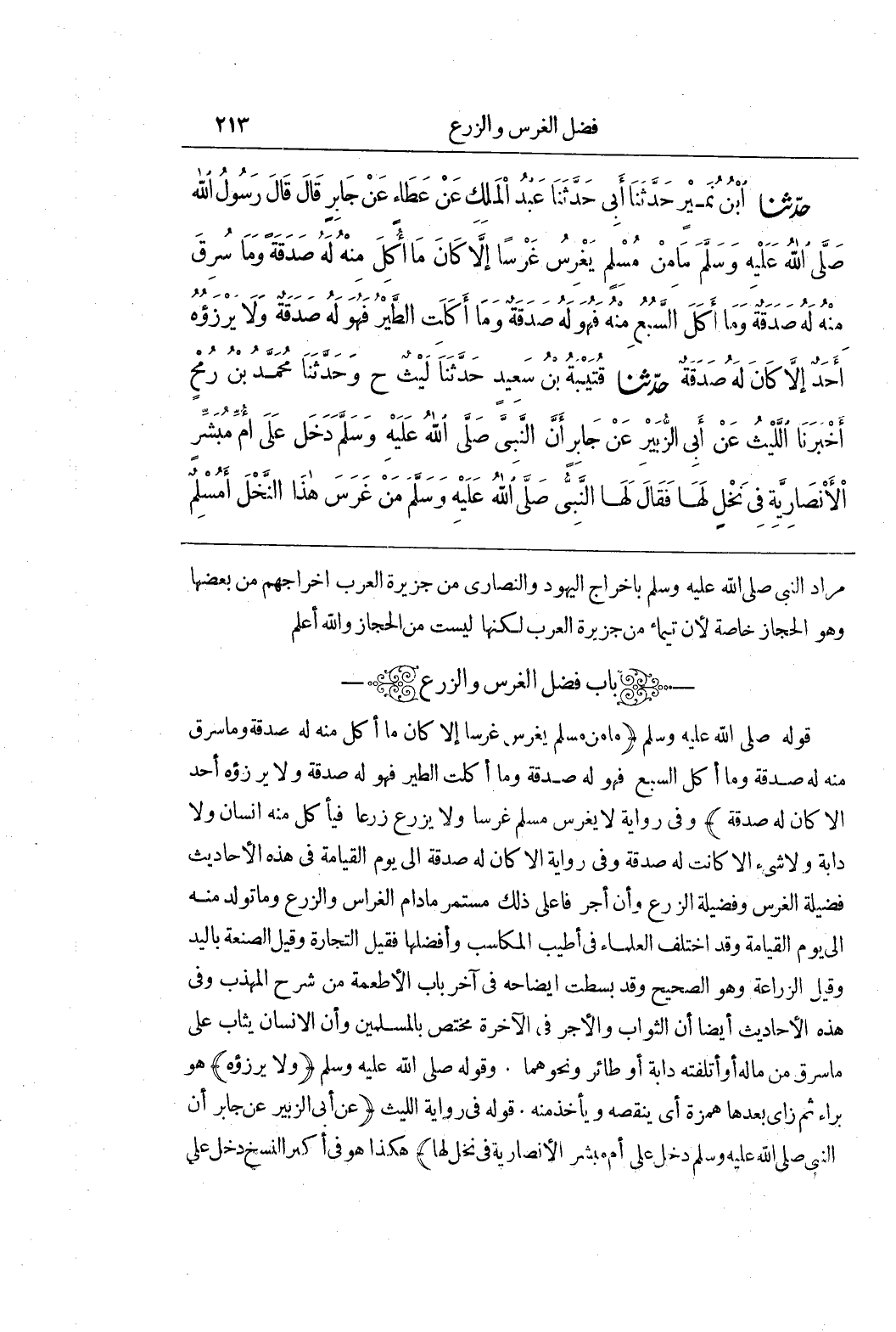 [1552] قَوْلُهُ صَلَّى اللَّهُ عَلَيْهِ وَسَلَّمَ (مَا مِنْ مُسْلِمٍ يَغْرِسُ غَرْسًا إِلَّا كَانَ مَا أَكْلَ مِنْهُ لَهُ صَدَقَةٌ وَمَا سُرِقَ مِنْهُ لَهُ صَدَقَةٌ وَمَا أَكَلَ السَّبْعُ فَهُوَ لَهُ صَدَقَةٌ وَمَا أَكَلَتِ الطَّيْرُ فَهُوَ لَهُ صَدَقَةٌ وَلَا يَرْزَؤُهُ أَحَدٌ إِلَّا كَانَ لَهُ صَدَقَةٌ) وَفِي رِوَايَةٍ لَا يَغْرِسُ مُسْلِمٌ غَرْسًا وَلَا يَزْرَعُ زَرْعًا فَيَأْكُلُ منه انسان ولا دابة ولا شئ إِلَّا كَانَتْ لَهُ صَدَقَةٌ وَفِي رِوَايَةٍ إِلَّا كَانَ لَهُ صَدَقَةٌ إِلَى يَوْمِ الْقِيَامَةِ فِي هَذِهِ الْأَحَادِيثِ فَضِيلَةُ الْغَرْسِ وَفَضِيلَةُ الزَّرْعِ وَأَنَّ أجر فاعلى ذلك مستمر مادام الْغِرَاسُ وَالزَّرْعُ وَمَا تَوَلَّدَ مِنْهُ إِلَى يَوْمِ الْقِيَامَةِ وَقَدِ اخْتَلَفَ الْعُلَمَاءُ فِي أَطْيَبِ الْمَكَاسِبِ وَأَفْضَلِهَا فَقِيلَ التِّجَارَةُ وَقِيلَ الصَّنْعَةُ بِالْيَدِ وَقِيلَ الزِّرَاعَةُ وَهُوَ الصَّحِيحُ وَقَدْ بَسَطْتُ إِيضَاحَهُ فِي آخِرِ بَابِ الْأَطْعِمَةِ مِنْ شَرْحِ الْمُهَذَّبِ وَفِي هَذِهِ الْأَحَادِيثِ أَيْضًا أَنَّ الثَّوَابَ وَالْأَجْرَ فِي الْآخِرَةِ مُخْتَصٌّ بِالْمُسْلِمِينَ وَأَنَّ الْإِنْسَانَ يُثَابُ عَلَى مَا سُرِقَ مِنْ مَالِهِ أَوْ أَتْلَفَتْهُ دَابَّةٌ أَوْ طَائِرٌ وَنَحْوُهُمَا وَقَوْلُهُ صَلَّى اللَّهُ عَلَيْهِ وَسَلَّمَ (وَلَا يَرْزَؤُهُ) هُوَ بِرَاءٍ ثُمَّ زَايٍ بَعْدَهَا هَمْزَةٌ أَيْ يَنْقُصُهُ وَيَأْخُذُ مِنْهُ قَوْلُهُ فِي رِوَايَةِ اللَّيْثِ (عَنْ أَبِي الزُّبَيْرِ عَنْ جَابِرٍ أَنَّ النَّبِيَّ صَلَّى اللَّهُ عَلَيْهِ وَسَلَّمَ دَخَلَ عَلَى أُمِّ مُبَشِّرٍ الْأَنْصَارِيَّةِ فِي نَخْلٍ لَهَا) هَكَذَا هُوَ فِي أَكْثَرِ النُّسَخِ دَخَلَ علي)