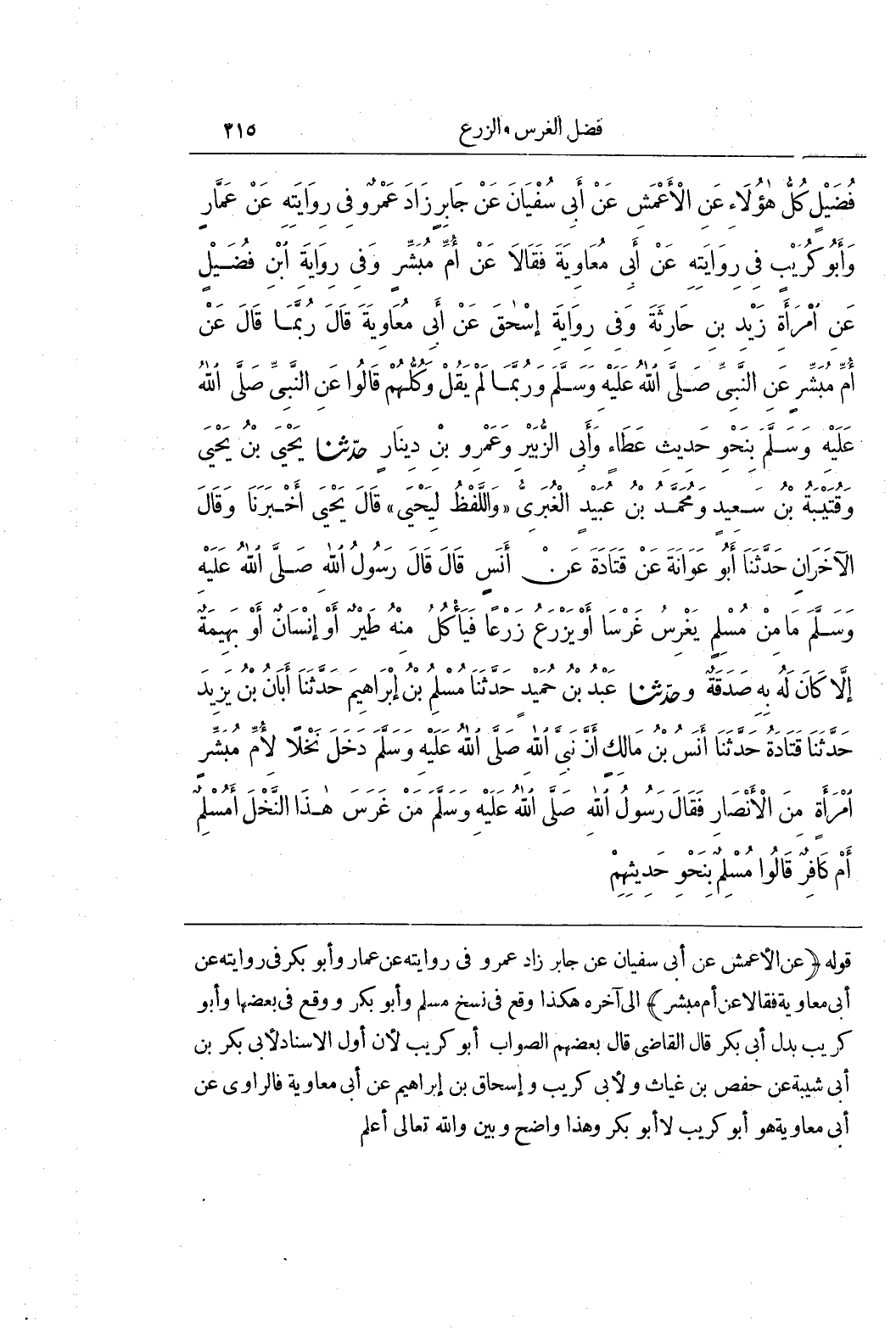 قَوْلُهُ (عَنِ الْأَعْمَشِ عَنْ أَبِي سُفْيَانَ عَنْ جَابِرٍ زَادَ عَمْرٌو فِي رِوَايَتِهِ عَنْ عَمَّارٍ وَأَبُو بَكْرٍ فِي رِوَايَتِهِ عَنْ أَبِي مُعَاوِيَةَ فَقَالَا عَنْ أُمِّ مُبَشِّرٍ) إِلَى آخِرِهِ هَكَذَا وَقَعَ فِي نُسَخِ مُسْلِمٍ وَأَبُو بَكْرٍ وَوَقَعَ فِي بَعْضِهَا وَأَبُو كُرَيْبٍ بَدَلَ أَبِي بَكْرٍ قَالَ الْقَاضِي قَالَ بَعْضُهُمْ الصَّوَابُ أَبُو كُرَيْبٍ لِأَنَّ أَوَّلَ الْإِسْنَادِ لِأَبِي بَكْرِ بْنِ أَبِي شَيْبَةَ عَنْ حَفْصِ بْنِ غِيَاثٍ وَلِأَبِي كُرَيْبٍ وَإِسْحَاقَ بْنِ إِبْرَاهِيمَ عَنْ أَبِي مُعَاوِيَةَ فَالرَّاوِي عَنْ أَبِي مُعَاوِيَةَ هُوَ أَبُو كُرَيْبٍ لَا أَبُو بَكْرٍ وَهَذَا وَاضِحٌ وَبَيِّنٌ وَاللَّهُ تَعَالَى أعلم