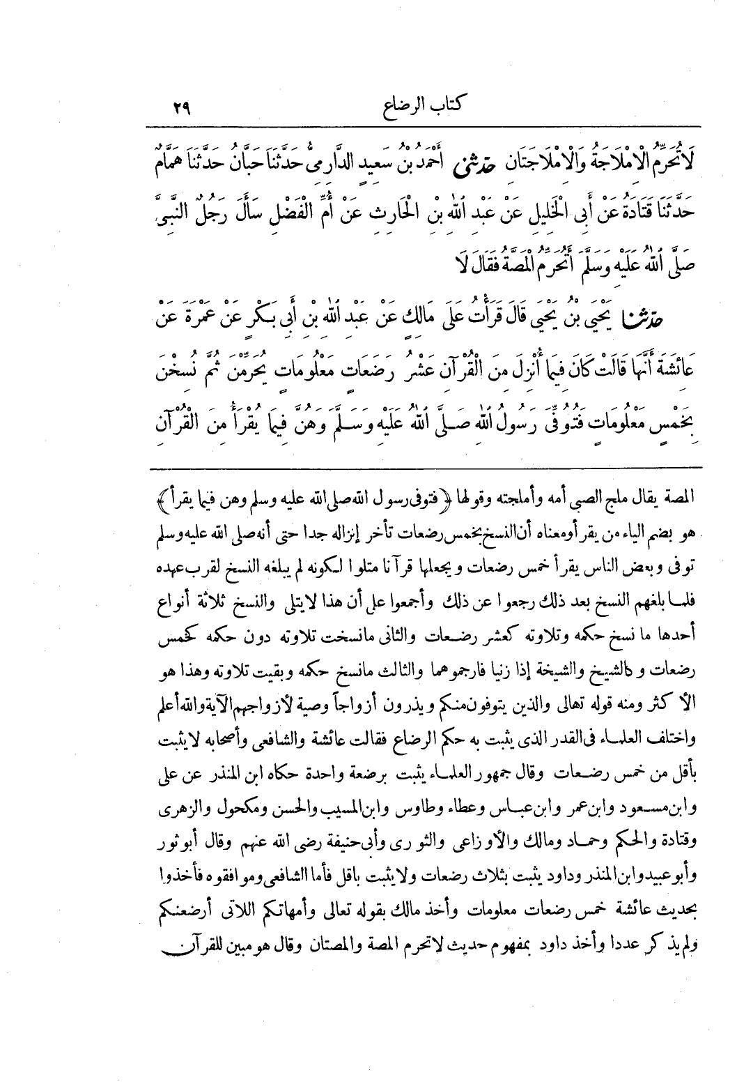 [1452] وَقَوْلُهَا (فَتُوُفِيَ رَسُولُ اللَّهِ صَلَّى اللَّهُ عَلَيْهِ وَسَلَّمَ وَهُنَّ فِيمَا يُقْرَأُ) هُوَ بِضَمِّ الْيَاءِ مِنْ يُقْرَأُ وَمَعْنَاهُ أَنَّ النَّسْخَ بِخَمْسِ رَضَعَاتٍ تَأَخَّرَ إِنْزَالُهُ جِدًّا حَتَى إِنَّهُ صَلَّى اللَّهُ عَلَيْهِ وَسَلَّمَ تُوُفِّيَ وَبَعْضُ النَّاسِ يَقْرَأُ خَمْسُ رَضَعَاتٍ وَيَجْعَلُهَا قُرْآنًا مَتْلُوًّا لِكَوْنِهِ لَمْ يَبْلُغْهُ النَّسْخُ لِقُرْبِ عَهْدِهِ فَلَمَّا بَلَغَهُمُ النَّسْخُ بَعْدَ ذَلِكَ رَجَعُوا عَنْ ذَلِكَ وَأَجْمَعُوا عَلَى أَنَّ هَذَا لَا يُتْلَى وَالنَّسْخُ ثَلَاثَةُ أَنْوَاعٍ أَحَدُهَا مَا نُسِخَ حُكْمُهُ وَتِلَاوَتُهُ كَعَشْرِ رَضَعَاتٍ وَالثَّانِي مَا نسخت تلاوته دون حكمة كخمس رضعات وكالشيخ وَالشَّيْخَةُ إِذَا زَنَيَا فَارْجُمُوهُمَا وَالثَّالِثُ مَا نُسِخَ حُكْمُهُ وَبَقِيَتْ تِلَاوَتُهُ وَهَذَا هُوَ الْأَكْثَرُ وَمِنْهُ قوله تعالى والذين يتوفون منكم ويذرون أزواجا وصية لأزواجهم الْآيَةَ وَاللَّهُ أَعْلَمُ وَاخْتَلَفَ الْعُلَمَاءُ فِي الْقَدْرِ الَّذِي يَثْبُتُ بِهِ حُكْمُ الرَّضَاعِ فَقَالَتْ عَائِشَةُ وَالشَّافِعِيُّ وَأَصْحَابُهُ لَا يَثْبُتُ بِأَقَلَّ مِنْ خَمْسِ رَضَعَاتٍ وَقَالَ جُمْهُورُ الْعُلَمَاءِ يَثْبُتُ بِرَضْعَةٍ وَاحِدَةٍ حكاه بن المنذر عن علي وبن مسعود وبن عمر وبن عباس وعطاء وطاوس وبن الْمُسَيِّبِ وَالْحَسَنِ وَمَكْحُولٍ وَالزُّهْرِيِّ وَقَتَادَةَ وَالْحَكَمِ وَحَمَّادٍ وَمَالِكٍ وَالْأَوْزَاعِيِّ وَالثَّوْرِيِّ وَأَبِي حَنِيفَةَ رَضِيَ اللَّهُ عنهم وقال أبو ثور وأبو عبيد وبن الْمُنْذِرِ وَدَاوُدُ يَثْبُتُ بِثَلَاثِ رَضَعَاتٍ وَلَا يَثْبُتُ بِأَقَلَّ فَأَمَّا الشَّافِعِيُّ وَمُوَافِقُوهُ فَأَخَذُوا بِحَدِيثِ عَائِشَةَ خَمْسُ رَضَعَاتٍ مَعْلُومَاتٍ وَأَخَذَ مَالِكٌ بقَوْلِهِ تَعَالَى وأمهاتكم اللاتي أرضعنكم وَلَمْ يَذْكُرْ عَدَدًا وَأَخَذَ دَاوُدُ بِمَفْهُومِ حَدِيثِ لَا تُحَرِّمُ الْمَصَّةُ وَالْمَصَّتَانِ وَقَالَ هُوَ مُبَيِّنٌ للقرآن