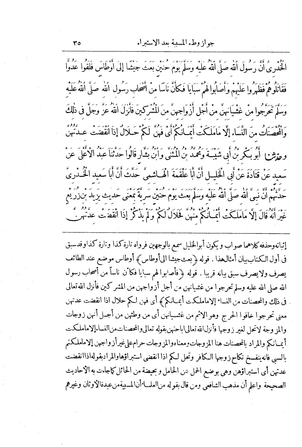 إِثْبَاتَهُ وَحَذْفَهُ كِلَاهُمَا صَوَابٌ وَيَكُونُ أَبُو الْخَلِيلِ سَمِعَ بِالْوَجْهَيْنِ فَرَوَاهُ تَارَةً كَذَا وَتَارَةً كَذَا وَقَدْ سَبَقَ فِي أَوَّلِ الْكِتَابِ بَيَانُ أَمْثَالِ هَذَا قَوْلُهُ (بَعَثَ جَيْشًا إِلَى أَوْطَاسَ) أَوْطَاسُ مَوْضِعٌ عِنْدَ الطَّائِفِ يُصْرَفُ وَلَا يُصْرَفُ سَبَقَ بَيَانُهُ قَرِيبًا قَوْلُهُ (فَأَصَابُوا لَهُمْ سَبَايَا فَكَأَنَّ نَاسًا مِنْ أَصْحَابِ رَسُولِ اللَّهِ صَلَّى اللَّهُ عَلَيْهِ وَسَلَّمَ تحرجوا من غشيانهن مِنْ أَجْلِ أَزْوَاجِهِنَّ مِنَ الْمُشْرِكِينَ فَأَنْزَلَ اللَّهُ تَعَالَى فِي ذَلِكَ وَالْمُحْصَنَاتُ مِنَ النِّسَاءِ إِلَّا ما ملكت أيمانكم) أَيْ فَهُنَّ لَكُمْ حَلَالٌ إِذَا انْقَضَتْ عِدَّتُهُنَّ مَعْنَى تَحَرَّجُوا خَافُوا الْحَرَجَ وَهُوَ الْإِثْمُ مِنْ غِشْيَانِهِنَّ أَيْ مِنْ وَطْئِهِنَّ مِنْ أَجْلِ أَنَّهُنَّ زَوْجَاتٌ وَالْمُزَوَّجَةُ لَا تَحِلُّ لِغَيْرِ زَوْجِهَا فَأَنْزَلَ اللَّهُ تَعَالَى إِبَاحَتَهُنَّ بِقَوْلِهِ تَعَالَى وَالْمُحْصَنَاتُ مِنَ النساء إلا ما ملكت أيمانكم وَالْمُرَادُ بِالْمُحْصَنَاتِ هُنَا الْمُزَوَّجَاتُ وَمَعْنَاهُ وَالْمُزَوَّجَاتُ حَرَامٌ عَلَى غَيْرِ أَزْوَاجِهِنَّ إِلَّا مَا مَلَكْتُمْ بِالسَّبْيِ فَإِنَّهُ يَنْفَسِخُ نِكَاحُ زَوْجِهَا الْكَافِرِ وَتَحِلُّ لَكُمْ إِذَا انْقَضَى اسْتِبْرَاؤُهَا وَالْمُرَادُ بِقَوْلِهِ إِذَا انْقَضَتْ عِدَّتُهُنَّ أَيِ اسْتِبْرَاؤُهُنَّ وَهِيَ بِوَضْعِ الْحَمْلِ عَنِ الْحَامِلِ وَبِحَيْضَةٍ مِنَ الْحَائِلِ كَمَا جَاءَتْ بِهِ الْأَحَادِيثُ الصَّحِيحَةُ وَاعْلَمْ أَنَّ مَذْهَبَ الشَّافِعِيِّ وَمَنْ قَالَ بِقَوْلِهِ مِنَ الْعُلَمَاءِ أَنَّ الْمَسْبِيَّةَ مِنْ عَبَدَةِ الْأَوْثَانِ وَغَيْرِهِمْ