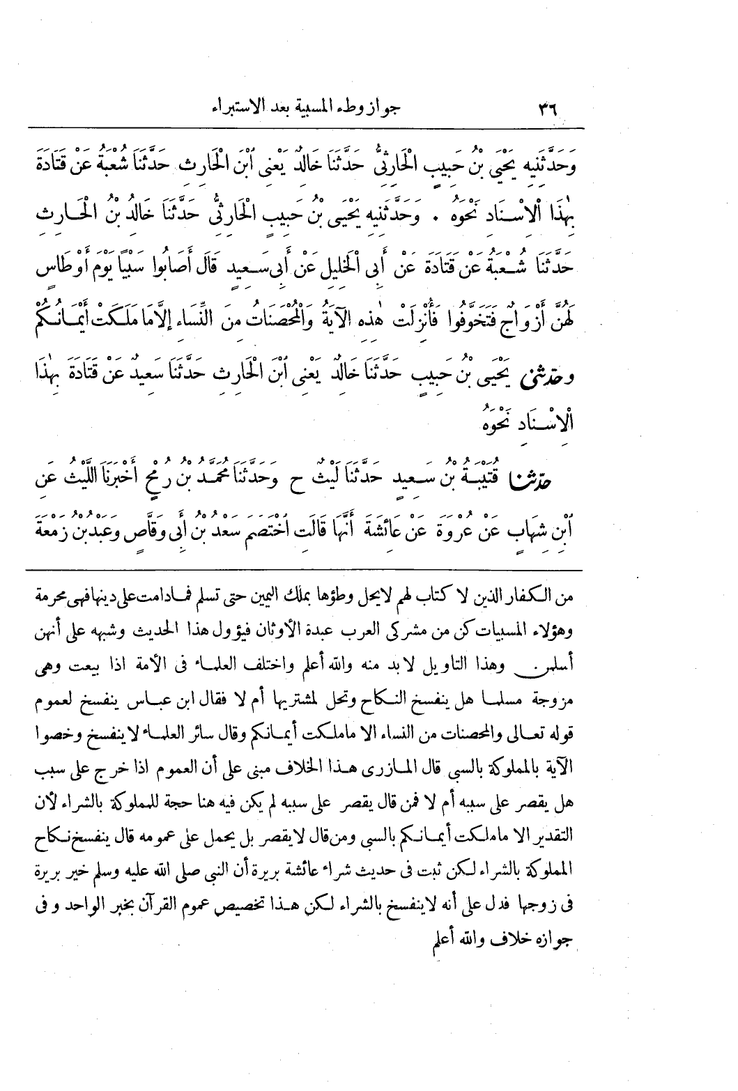 مِنَ الْكُفَّارِ الَّذِينَ لَا كِتَابَ لَهُمْ لَا يَحِلُّ وَطْؤُهَا بِمِلْكِ الْيَمِينِ حَتَّى تُسْلِمَ فَمَا دَامَتْ عَلَى دِينِهَا فَهِيَ مُحَرَّمَةٌ وهَؤُلَاءِ الْمَسْبِيَّاتُ كن من مشركي العرب عبدة الأوثان فيؤول هَذَا الْحَدِيثُ وَشِبْهُهُ عَلَى أَنَّهُنَّ أَسْلَمْنَ وَهَذَا التَّأْوِيلُ لَا بُدَّ مِنْهُ وَاللَّهُ أَعْلَمُ وَاخْتَلَفَ الْعُلَمَاءُ فِي الْأَمَةِ إِذَا بِيعَتْ وَهِيَ مُزَوَّجَةٌ مُسْلِمًا هَلْ يَنْفَسِخُ النِّكَاحُ وَتَحِلُّ لِمُشْتَرِيهَا أَمْ لا فقال بن عَبَّاسٍ يَنْفَسِخُ لِعُمُومِ قَوْلِهِ تَعَالَى وَالْمُحْصَنَاتُ مِنَ النساء الا ما ملكت أيمانكم وَقَالَ سَائِرُ الْعُلَمَاءِ لَا يَنْفَسِخُ وَخَصُّوا الْآيَةَ بِالْمَمْلُوكَةِ بِالسَّبْيِ قَالَ الْمَازِرِيُّ هَذَا الْخِلَافُ مَبْنِيٌّ عَلَى أَنَّ الْعُمُومَ إِذَا خَرَجَ عَلَى سَبَبٍ هَلْ يُقْصَرُ عَلَى سَبَبِهِ أَمْ لَا فَمَنْ قال يقصر على سببه لم يكن فيه هنا حجة للمملوكة بالشراء لأن التقدير الا ماملكت أيمانكم بالسبى ومن قَالَ لَا يُقْصَرُ بَلْ يُحْمَلُ عَلَى عُمُومِهِ قَالَ يَنْفَسِخُ نِكَاحُ الْمَمْلُوكَةِ بِالشِّرَاءِ لَكِنْ ثَبَتَ فِي حَدِيثِ شِرَاءِ عَائِشَةَ بَرِيرَةَ أَنَّ النَّبِيَّ صَلَّى اللَّهُ عَلَيْهِ وَسَلَّمَ خَيَّرَ بَرِيرَةَ فِي زَوْجِهَا فَدَلَّ عَلَى أَنَّهُ لَا يَنْفَسِخُ بِالشِّرَاءِ لَكِنْ هَذَا تَخْصِيصُ عُمُومِ الْقُرْآنِ بِخَبَرِ الْوَاحِدِ وفي جوازه خلاف والله أعلم