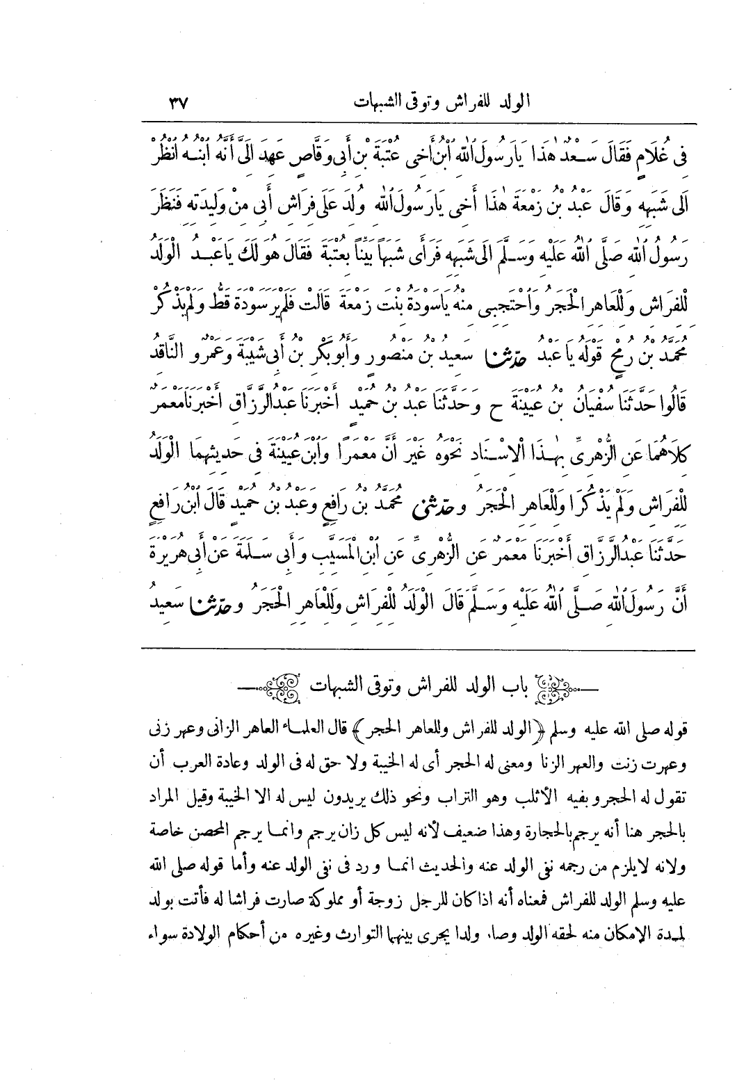[1457] قَوْلُهُ صَلَّى اللَّهُ عَلَيْهِ وَسَلَّمَ (الْوَلَدُ لِلْفِرَاشِ وَلِلْعَاهِرِ الْحَجَرُ) قَالَ الْعُلَمَاءُ الْعَاهِرُ الزَّانِي وَعَهَرَ زنى وعهرت زنت والعهر الزنى ومعنى له الْحَجَرِ أَيْ لَهُ الْخَيْبَةُ وَلَا حَقَّ لَهُ فِي الْوَلَدِ وَعَادَةُ الْعَرَبِ أَنَّ تَقُولَ لَهُ الْحَجَرُ وَبِفِيهِ الْأَثْلَبُ وَهُوَ التُّرَابُ وَنَحْوَ ذَلِكَ يُرِيدُونَ لَيْسَ لَهُ إِلَّا الْخَيْبَةُ وَقِيلَ الْمُرَادُ بالحجر هنا أنه يُرْجَمَ بِالْحِجَارَةِ وَهَذَا ضَعِيفٌ لِأَنَّهُ لَيْسَ كُلُّ زَانٍ يُرْجَمُ وَإِنَّمَا يُرْجَمُ الْمُحْصَنُ خَاصَّةً وَلِأَنَّهُ لَا يَلْزَمُ مِنْ رَجْمِهِ نَفْيُ الْوَلَدِ عَنْهُ وَالْحَدِيثُ إِنَّمَا وَرَدَ فِي نَفْيِ الْوَلَدِ عَنْهُ وَأَمَّا قَوْلُهُ صَلَّى اللَّهُ عَلَيْهِ وَسَلَّمَ الْوَلَدُ لِلْفِرَاشِ فَمَعْنَاهُ أَنَّهُ إِذَا كَانَ لِلرَّجُلِ زَوْجَةٌ أَوْ مَمْلُوكَةٌ صَارَتْ فِرَاشًا لَهُ فَأَتَتْ بِوَلَدٍ لِمُدَّةِ الْإِمْكَانِ مِنْهُ لَحِقَهُ الْوَلَدُ وَصَارَ وَلَدًا يَجْرِي بَيْنَهُمَا التَّوَارُثُ وَغَيْرُهُ مِنْ أَحْكَامِ الْوِلَادَةِ سواء