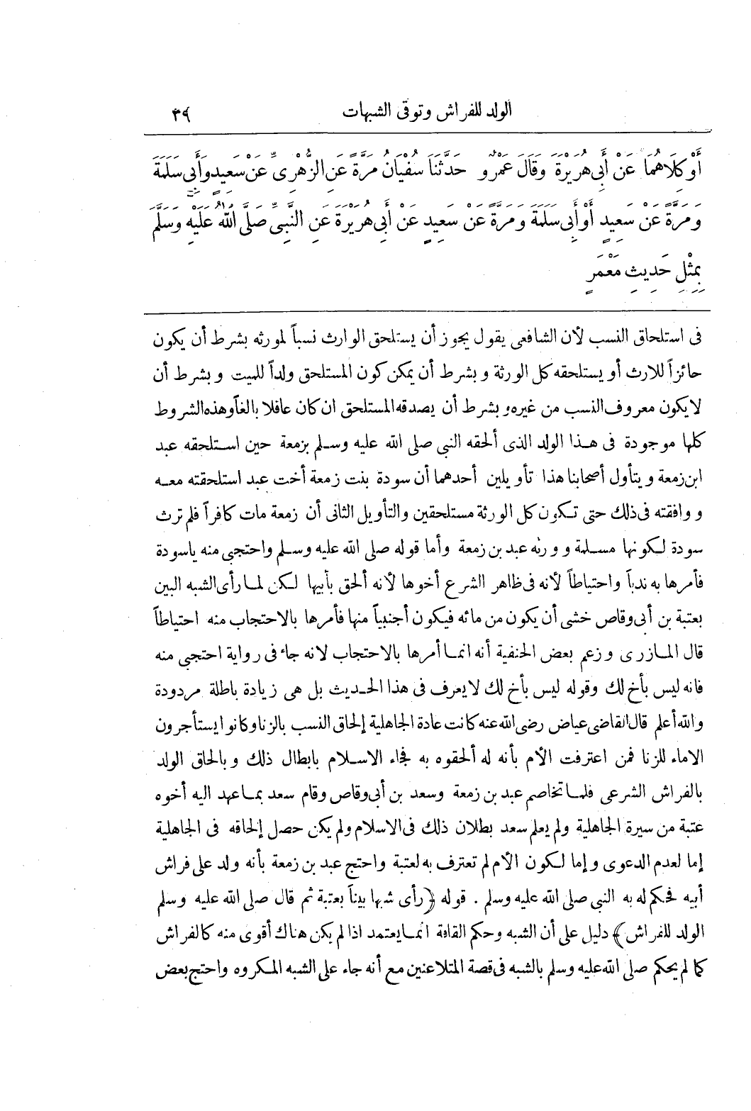 فِي اسْتِلْحَاقِ النَّسَبِ لِأَنَّ الشَّافِعِيَّ يَقُولُ يِجَوَزُ أن يستلحق الوارث نسبا لمورثه بِشَرْطِ أَنْ يَكُونَ حَائِزًا لِلْإِرْثِ أَوْ يَسْتَلْحِقَهُ كُلُّ الْوَرَثَةِ وَبِشَرْطِ أَنْ يُمْكِنَ كَوْنُ الْمُسْتَلْحَقِ وَلَدًا لِلْمَيِّتِ وَبِشَرْطِ أَنْ لَا يَكُونَ مَعْرُوفَ النَّسَبِ مِنْ غَيْرِهِ وَبِشَرْطِ أَنْ يُصَدِّقَهُ الْمُسْتَلْحَقُ إِنْ كَانَ عَاقِلًا بَالِغًا وَهَذِهِ الشُّرُوطُ كُلُّهَا مَوْجُودَةٌ فِي هَذَا الْوَلَدِ الَّذِي أَلْحَقَهُ النَّبِيُّ صَلَّى اللَّهُ عَلَيْهِ وَسَلَّمَ بِزَمْعَةَ حِينَ اسْتَلْحَقَهُ عَبْدُ بْنُ زَمْعَةَ وَيَتَأَوَّلُ أَصْحَابُنَا هَذَا تَأْوِيلَيْنِ أحدهما أن سودة بنت زمعة أخت عبد اسْتَلْحَقَتْهُ مَعَهُ وَوَافَقَتْهُ فِي ذَلِكَ حَتَّى تَكُونَ كُلُّ الْوَرَثَةِ مُسْتَلْحِقِينَ وَالتَّأْوِيلُ الثَّانِي أَنَّ زَمْعَةَ مَاتَ كَافِرًا فَلَمْ تَرِثْهُ سَوْدَةُ لِكَوْنِهَا مُسْلِمَةً وَوَرِثَهُ عَبْدُ بْنُ زَمْعَةَ وَأَمَّا قَوْلُهُ صَلَّى اللَّهُ عَلَيْهِ وَسَلَّمَ وَاحْتَجِبِي مِنْهُ يَا سَوْدَةُ فَأَمَرَهَا بِهِ نَدْبًا وَاحْتِيَاطًا لِأَنَّهُ فِي ظَاهِرِ الشَّرْعِ أَخُوهَا لِأَنَّهُ أُلْحِقَ بِأَبِيهَا لَكِنْ لَمَّا رَأَى الشَّبَهَ الْبَيِّنَ بِعُتْبَةَ بْنِ أَبِي وَقَّاصٍ خَشِيَ أَنْ يَكُونَ مِنْ مَائِهِ فَيَكُونَ أَجْنَبِيًّا مِنْهَا فَأَمَرَهَا بِالِاحْتِجَابِ مِنْهُ احْتِيَاطًا قَالَ الْمَازِرِيُّ وَزَعَمَ بَعْضُ الْحَنَفِيَّةِ أَنَّهُ إِنَّمَا أَمَرَهَا بِالِاحْتِجَابِ لِأَنَّهُ جَاءَ فِي رِوَايَةٍ احْتَجِبِي مِنْهُ فَإِنَّهُ لَيْسَ بِأَخٍ لَكِ وَقَوْلُهُ لَيْسَ بِأَخٍ لَكِ لَا يُعْرَفُ فِي هَذَا الْحَدِيثِ بَلْ هِيَ زيادة باطلة مردودة وَاللَّهُ أَعْلَمُ قَالَ الْقَاضِي عِيَاضٌ رَضِيَ اللَّهُ عنه كانت عادة الجاهلية إلحاق النسب بالزنى وكانوا يستأجرون الإماء لِلزِّنَا فَمَنِ اعْتَرَفَتِ الْأُمُّ بِأَنَّهُ لَهُ أَلْحَقُوهُ بِهِ فَجَاءَ الْإِسْلَامُ بِإِبْطَالِ ذَلِكَ وَبِإِلْحَاقِ الْوَلَدِ بِالْفِرَاشِ الشَّرْعِيِّ فَلَمَّا تَخَاصَمَ عَبْدُ بْنُ زَمْعَةَ وَسَعْدُ بْنُ أَبِي وَقَّاصٍ وَقَامَ سَعْدٌ بِمَا عَهِدَ إِلَيْهِ أَخُوهُ عُتْبَةُ مِنْ سِيرَةِ الْجَاهِلِيَّةِ وَلَمْ يَعْلَمْ سَعْدٌ بُطْلَانَ ذَلِكَ فِي الْإِسْلَامِ وَلَمْ يَكُنْ حَصَلَ إِلْحَاقُهُ فِي الْجَاهِلِيَّةِ إِمَّا لِعَدَمِ الدَّعْوَى وَإِمَّا لِكَوْنِ الْأُمِّ لَمْ تَعْتَرِفْ بِهِ لِعُتْبَةَ وَاحْتَجَّ عَبْدُ بْنُ زَمْعَةَ بِأَنَّهُ وُلِدَ عَلَى فِرَاشِ أَبِيهِ فَحَكَمَ لَهُ بِهِ النَّبِيُّ صَلَّى اللَّهُ عَلَيْهِ وَسَلَّمَ قَوْلُهُ (رَأَى شَبَهًا بَيِّنًا بِعُتْبَةَ ثُمَّ قَالَ صَلَّى اللَّهُ عَلَيْهِ وَسَلَّمَ الْوَلَدُ لِلْفِرَاشِ) دَلِيلٌ عَلَى أَنَّ الشَّبَهَ وَحُكْمَ الْقَافَةِ إِنَّمَا يُعْتَمَدُ إِذَا لَمْ يَكُنْ هُنَاكَ أَقْوَى مِنْهُ كَالْفِرَاشِ كَمَا لَمْ يَحْكُمْ صَلَّى اللَّهُ عَلَيْهِ وَسَلَّمَ بِالشَّبَهِ فِي قِصَّةِ الْمُتَلَاعِنَيْنِ مَعَ أَنَّهُ جَاءَ عَلَى الشَّبَهِ الْمَكْرُوهِ وَاحْتَجَّ بَعْضُ