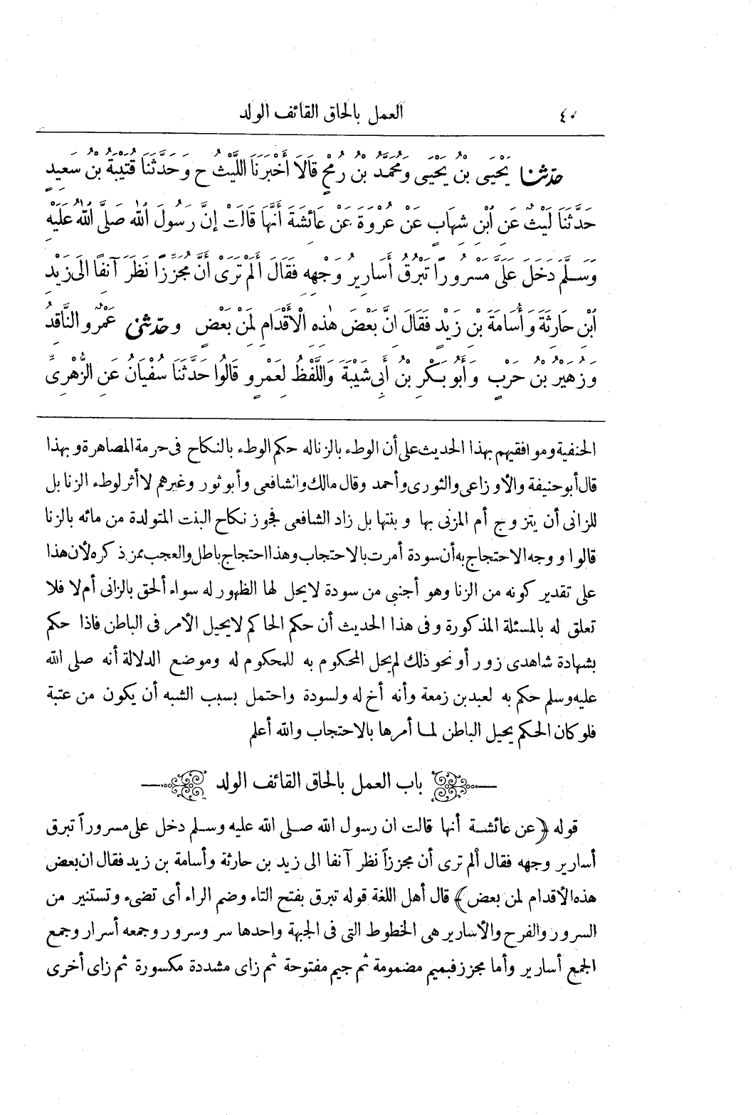 [1459] قَوْلُهُ (عَنْ عَائِشَةَ أَنَّهَا قَالَتْ إِنَّ رَسُولَ اللَّهِ صَلَّى اللَّهُ عَلَيْهِ وَسَلَّمَ دَخَلَ عَلَيَّ مسرور تَبْرُقُ أَسَارِيرُ وَجْهِهِ فَقَالَ أَلَمْ تَرَيْ أَنَّ مُجَزِّزًا نَظَرَ آنِفًا إِلَى زَيْدِ بْنِ حَارِثَةَ وَأُسَامَةَ بْنِ زَيْدٍ فَقَالَ إِنَّ بَعْضَ هَذِهِ الْأَقْدَامِ لَمِنْ بَعْضٍ) قَالَ أَهْلُ اللُّغَةِ قَوْلُهُ تَبْرُقُ بِفَتْحِ التَّاءِ وَضَمِّ الرَّاءِ أَيْ تُضِيءُ وتستنير من السرور والفرح والأسارير هِيَ الْخُطُوطُ الَّتِي فِي الْجَبْهَةِ وَاحِدُهَا سِرٌّ وَسُرُورٌ وَجَمْعُهُ أَسْرَارٌ وَجَمْعُ الْجَمْعِ أَسَارِيرُ وَأَمَّا مُجَزِّزٌ فَبِمِيمٍ مَضْمُومَةٍ ثُمَّ جِيمٍ مَفْتُوحَةٍ ثُمَّ زَايٍ مُشَدَّدَةٍ مَكْسُورَةٍ ثُمَّ زَايٍ أُخْرَى