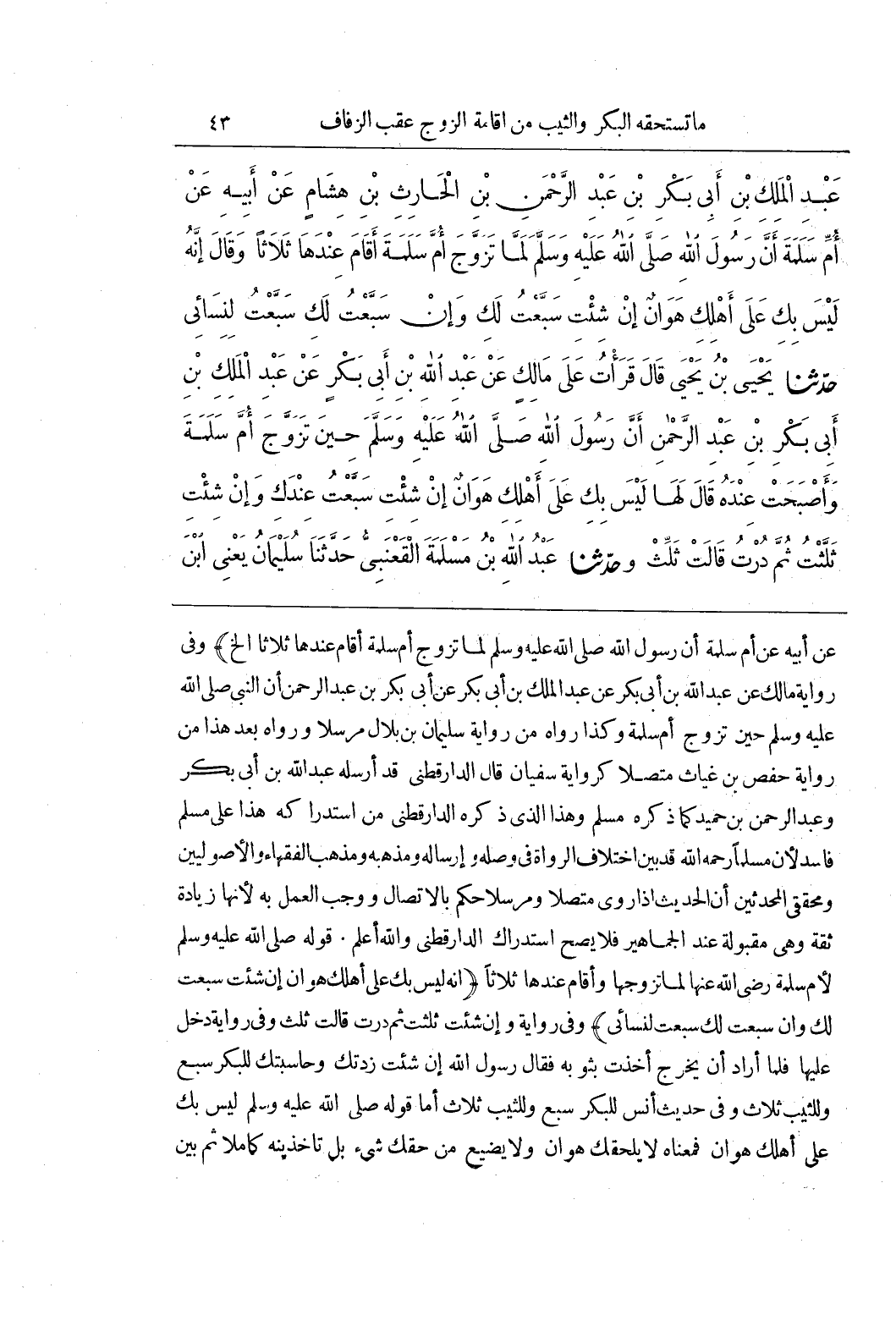 عَنْ أَبِيهِ عَنْ أُمِّ سَلَمَةَ أَنَّ رَسُولَ اللَّهِ صَلَّى اللَّهُ عَلَيْهِ وَسَلَّمَ لَمَّا تَزَوَّجَ أُمَّ سَلَمَةَ أَقَامَ عِنْدَهَا ثَلَاثًا إِلَخْ) وَفِي رِوَايَةِ مَالِكٍ عَنْ عَبْدِ اللَّهِ بْنِ أَبِي بَكْرٍ عَنْ عَبْدِ الْمَلِكِ بْنِ أَبِي بَكْرِ عن أَبِي بَكْرِ بْنِ عَبْدِ الرَّحْمَنِ أَنَّ النَّبِيَّ صَلَّى اللَّهُ عَلَيْهِ وَسَلَّمَ حِينَ تَزَوَّجَ أُمَّ سلمة وكذا رَوَاهُ مِنْ رِوَايَةِ سُلَيْمَانَ بْنِ بِلَالٍ مُرْسَلًا وَرَوَاهُ بَعْدَ هَذَا مِنْ رِوَايَةِ حَفْصِ بْنِ غِيَاثٍ مُتَّصِلًا كَرِوَايَةِ سُفْيَانَ قَالَ الدَّارَقُطْنِيُّ قَدْ أَرْسَلَهُ عَبْدُ اللَّهِ بْنُ أَبِي بَكْرٍ وَعَبْدُ الرَّحْمَنِ بْنُ حُمَيْدٍ كَمَا ذَكَرَهُ مُسْلِمٌ وَهَذَا الَّذِي ذَكَرَهُ الدَّارَقُطْنِيُّ مِنَ اسْتِدْرَاكِهِ هَذَا عَلَى مُسْلِمٍ فَاسِدٌ لِأَنَّ مُسْلِمًا رَحِمَهُ اللَّهُ قَدْ بَيَّنَ اخْتِلَافَ الرُّوَاةِ فِي وَصْلِهِ وَإِرْسَالِهِ وَمَذْهَبُهُ وَمَذْهَبُ الْفُقَهَاءِ وَالْأُصُولِيِّينَ وَمُحَقِّقِي الْمُحَدِّثِينَ أَنَّ الْحَدِيثَ إِذَا رُوِيَ مُتَّصِلًا وَمُرْسَلًا حُكِمَ بِالِاتِّصَالِ وَوَجَبَ العمل به لِأَنَّهَا زِيَادَةُ ثِقَةٍ وَهِيَ مَقْبُولَةٌ عِنْدَ الْجَمَاهِيرِ فَلَا يَصِحُّ اسْتِدْرَاكُ الدَّارَقُطْنِيِّ وَاللَّهُ أَعْلَمُ قَوْلُهُ صَلَّى اللَّهُ عَلَيْهِ وَسَلَّمَ لِأُمِّ سَلَمَةَ رَضِيَ اللَّهُ عَنْهَا لَمَّا تَزَوَّجَهَا وَأَقَامَ عِنْدهَا ثَلَاثًا (إِنَّهُ لَيْسَ بِكِ عَلَى أَهْلِكِ هَوَانٌ إِنْ شِئْتِ سَبَّعْتُ لَكِ وَإِنْ سَبَّعْتُ لَكِ سَبَّعْتُ لِنِسَائِي) وَفِي رِوَايَةٍ وَإِنْ شِئْتِ ثَلَّثْتُ ثُمَّ دُرْتُ قَالَتْ ثَلِّثْ وَفِي رِوَايَةٍ دَخَلَ عَلَيْهَا فَلَمَّا أَرَادَ أَنْ يَخْرُجَ أَخَذَتْ بِثَوْبِهِ فَقَالَ رَسُولُ اللَّهِ إِنْ شِئْتِ زِدْتُكِ وَحَاسَبْتُكِ لِلْبِكْرِ سَبْعٌ وَلِلثَّيِّبِ ثَلَاثٌ وَفِي حَدِيثِ أَنَسٍ لِلْبِكْرِ سَبْعٌ وَلِلثَّيِّبِ ثَلَاثٌ أَمَّا قَوْلُهُ صَلَّى اللَّهُ عَلَيْهِ وَسَلَّمَ لَيْسَ بِكِ عَلَى أَهْلِكِ هَوَانٌ فَمَعْنَاهُ لَا يَلْحَقُكِ هَوَانٌ وَلَا يَضِيعُ مِنْ حَقِّكِ شَيْءٌ بَلْ تَأْخُذِينَهُ كَامِلًا ثُمَّ بَيَّنَ
