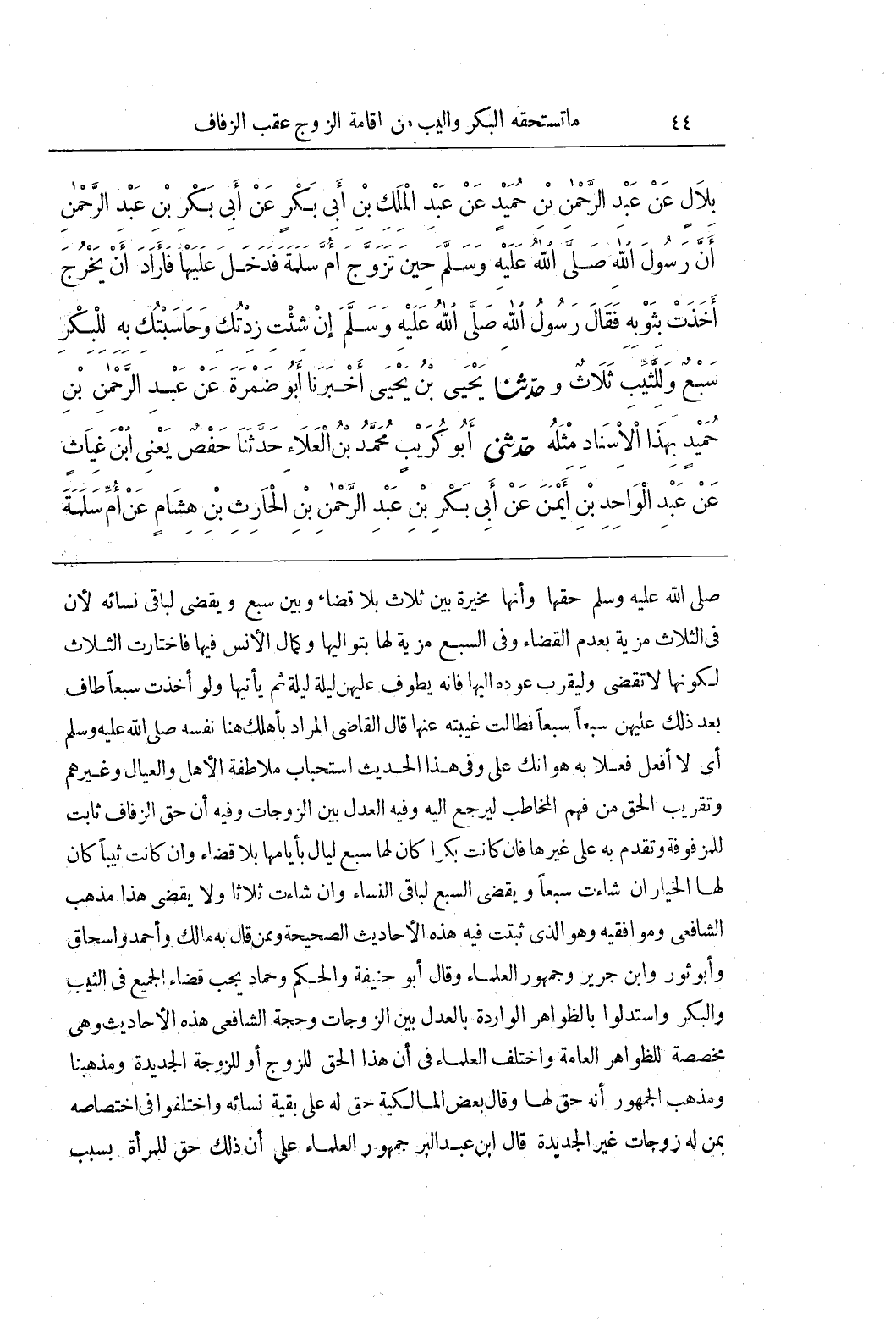 (حَقَّهَا وَأَنَّهَا مُخَيَّرَةٌ بين ثلاث بلا قضاء وبين سبع ويقضى لباقي نسائه لأن في الثلاث مَزِيَّةً بِعَدَمِ الْقَضَاءِ وَفِي السَّبْعِ مَزِيَّةٌ لَهَا بِتَوَالِيهَا وَكَمَالِ الْأُنْسِ فِيهَا فَاخْتَارَتِ الثَّلَاثَ لِكَوْنِهَا لَا تُقْضَى وَلِيَقْرُبَ عَوْدُهُ إِلَيْهَا فَإِنَّهُ يَطُوفُ عَلَيْهِنَّ لَيْلَةً لَيْلَةً ثُمَّ يَأْتِيهَا وَلَوْ أَخَذَتْ سَبْعًا طَافَ بَعْدَ ذَلِكَ عَلَيْهِنَّ سَبْعًا سَبْعًا فَطَالَتْ غَيْبَتُهُ عَنْهَا قَالَ الْقَاضِي الْمُرَادُ بِأَهْلِكِ هُنَا نَفْسُهُ صَلَّى اللَّهُ عَلَيْهِ وَسَلَّمَ أَيْ لَا أَفْعَلُ فِعْلًا بِهِ هَوَانُكِ عَلَيَّ وَفِي هَذَا الْحَدِيثِ اسْتِحْبَابُ مُلَاطَفَةِ الْأَهْلِ وَالْعِيَالِ وَغَيْرِهِمْ وَتَقْرِيبُ الْحَقِّ مِنْ فَهْمِ الْمُخَاطَبِ لِيَرْجِعَ إِلَيْهِ وَفِيهِ الْعَدْلُ بَيْنَ الزَّوْجَاتِ وَفِيهِ أَنَّ حَقَّ الزِّفَافِ ثَابِتٌ لِلْمَزْفُوفَةِ وَتُقَدَّمُ بِهِ عَلَى غَيْرِهَا فإن كانت بكرا كان لها سبع لَيَالٍ بِأَيَّامِهَا بِلَا قَضَاءٍ وَإِنْ كَانَتْ ثَيِّبًا كان لها الخياران شَاءَتْ سَبْعًا وَيَقْضِي السَّبْعَ لِبَاقِي النِّسَاءِ وَإِنْ شَاءَتْ ثَلَاثًا وَلَا يَقْضِي هَذَا مَذْهَبُ الشَّافِعِيِّ وَمُوَافِقِيهِ وَهُوَ الَّذِي ثَبَتَتْ فِيهِ هَذِهِ الْأَحَادِيثُ الصَّحِيحَةُ وَمِمَّنْ قَالَ بِهِ مَالِكٌ وَأَحْمَدُ وَإِسْحَاقُ وأبو ثور وبن جَرِيرٍ وَجُمْهُورُ الْعُلَمَاءِ وَقَالَ أَبُو حَنِيفَةَ وَالْحَكَمُ وَحَمَّادٌ يَجِبُ قَضَاءُ الْجَمِيعِ فِي الثَّيِّبِ وَالْبِكْرِ وَاسْتَدَلُّوا بِالظَّوَاهِرِ الْوَارِدَةِ بِالْعَدْلِ بَيْنَ الزَّوْجَاتِ وَحُجَّةُ الشَّافِعِيِّ هَذِهِ الْأَحَادِيثُ وَهِيَ مُخَصِّصَةٌ لِلظَّوَاهِرِ الْعَامَّةِ وَاخْتَلَفَ الْعُلَمَاءُ فِي أَنَّ هَذَا الْحَقَّ لِلزَّوْجِ أَوْ لِلزَّوْجَةِ الْجَدِيدَةِ وَمَذْهَبُنَا وَمَذْهَبُ الْجُمْهُورِ أَنَّهُ حَقٌّ لَهَا وَقَالَ بَعْضُ الْمَالِكِيَّةِ حَقٌّ لَهُ عَلَى بَقِيَّةِ نِسَائِهِ وَاخْتَلَفُوا فِي اخْتِصَاصِهِ بِمَنْ له زوجات غير الجديدة قال بن عَبْدِ الْبَرِّ جُمْهُورُ الْعُلَمَاءِ عَلَى أَنَّ ذَلِكَ حق للمرأة)