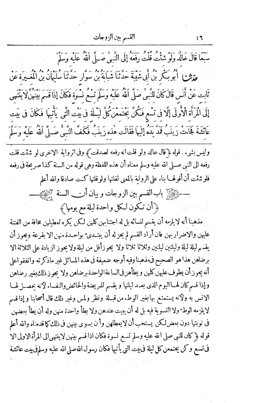 (أن تكون لكل واحدة ليلة مع يومها) مَذْهَبُنَا أَنَّهُ لَا يَلْزَمُهُ أَنْ يَقْسِمَ لِنِسَائِهِ بَلْ لَهُ اجْتِنَابُهُنَّ كُلِّهِنَّ لَكِنْ يُكْرَهُ تَعْطِيلُهُنَّ مَخَافَةً مِنَ الْفِتْنَةِ عَلَيْهِنَّ وَالْإِضْرَارِ بِهِنَّ فَإِنْ أراد القسم لم يجز له أن يبتديء بِوَاحِدَةٍ مِنْهُنَّ إِلَّا بِقُرْعَةٍ وَيَجُوزُ أَنْ يَقْسِمَ لَيْلَةً لَيْلَةً وَلَيْلَتَيْنِ لَيْلَتَيْنِ وَثَلَاثًا ثَلَاثًا وَلَا يَجُوزُ أَقَلُّ مِنْ لَيْلَةٍ وَلَا يَجُوزُ الزِّيَادَةُ عَلَى الثَّلَاثَةِ إِلَّا بِرِضَاهُنَّ هَذَا هُوَ الصَّحِيحُ فِي مَذْهَبِنَا وَفِيهِ أَوْجُهٌ ضَعِيفَةٌ فِي هَذِهِ الْمَسَائِلِ غَيْرَ مَا ذَكَرْتُهُ وَاتَّفَقُوا عَلَى أَنَّهُ يَجُوزُ أَنْ يَطُوفَ عَلَيْهِنَّ كُلِّهِنَّ وَيَطَأَهُنَّ فِي السَّاعَةِ الْوَاحِدَةِ بِرِضَاهُنَّ وَلَا يَجُوزُ ذَلِكَ بِغَيْرِ رِضَاهُنَّ وَإِذَا قَسَمَ كَانَ لَهَا الْيَوْمُ الَّذِي بَعْدَ لَيْلَتِهَا وَيَقْسِمُ لِلْمَرِيضَةِ وَالْحَائِضِ وَالنُّفَسَاءِ لِأَنَّهُ يَحْصُلُ لَهَا الْأُنْسُ بِهِ وَلِأَنَّهُ يَسْتَمْتِعُ بِهَا بغير الوطيء مِنْ قُبْلَةٍ وَنَظَرٍ وَلَمْسٍ وَغَيْرِ ذَلِكَ قَالَ أَصْحَابُنَا وَإِذَا قَسَمَ لَا يَلْزَمُهُ الْوَطْءُ وَلَا التَّسْوِيَةُ فِيهِ بَلْ لَهُ أَنْ يَبِيتَ عِنْدَهُنَّ وَلَا يَطَأُ وَاحِدَةً مِنْهُنَّ وَلَهُ أَنْ يَطَأَ بَعْضَهُنَّ فِي نَوْبَتِهَا دُونَ بَعْضٍ لَكِنْ يُسْتَحَبُّ أن لا يُعَطِّلَهُنَّ وَأَنْ يُسَوِّيَ بَيْنهُنَّ فِي ذَلِكَ كَمَا قَدَّمْنَاهُ وَاللَّهُ أَعْلَمُ