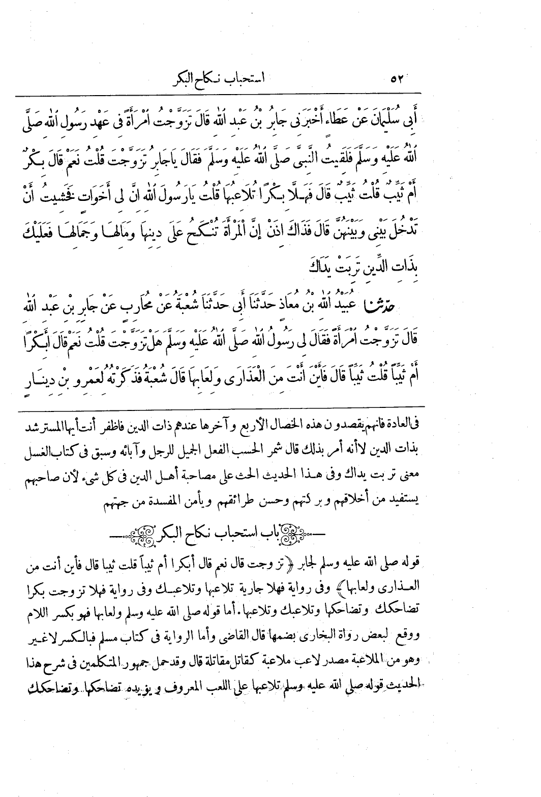 قوله صلى الله عليه وسلم لجابر (تَزَوَّجْتَ قَالَ نَعَمْ قَالَ أَبِكْرًا أَمْ ثَيِّبًا قلت ثَيِّبًا قَالَ فَأَيْنَ أَنْتَ مِنَ الْعَذَارَى وَلِعَابِهَا) وَفِي رِوَايَةٍ فَهَلَّا جَارِيَةً تُلَاعِبُهَا وَتُلَاعِبُكَ وَفِي رِوَايَةٍ فَهَلَّا تَزَوَّجْتَ بِكْرًا تُضَاحِكُكَ وَتُضَاحِكُهَا وَتُلَاعِبُكَ وَتُلَاعِبُهَا أَمَّا قَوْلُهُ صَلَّى اللَّهُ عَلَيْهِ وَسَلَّمَ وَلِعَابِهَا فَهُوَ بِكَسْرِ اللَّامِ وَوَقَعَ لِبَعْضِ رُوَاةِ الْبُخَارِيِّ بِضَمِّهَا قَالَ الْقَاضِي وَأَمَّا الرِّوَايَةُ فِي كِتَابِ مُسْلِمٍ فَبِالْكَسْرِ لَا غَيْرَ وَهُوَ مِنَ الْمُلَاعَبَةِ مَصْدَرُ لَاعَبَ مُلَاعَبَةً كَقَاتَلَ مُقَاتَلَةً قَالَ وَقَدْ حَمَلَ جُمْهُورُ الْمُتَكَلِّمِينَ فِي شَرْحِ هَذَا الْحَدِيثِ قَوْلَهُ صَلَّى اللَّهُ عَلَيْهِ وَسَلَّمَ تُلَاعِبُهَا عَلَى اللَّعِبِ الْمَعْرُوفِ وَيُؤَيِّدُهُ تُضَاحِكُهَا وَتُضَاحِكُكَ