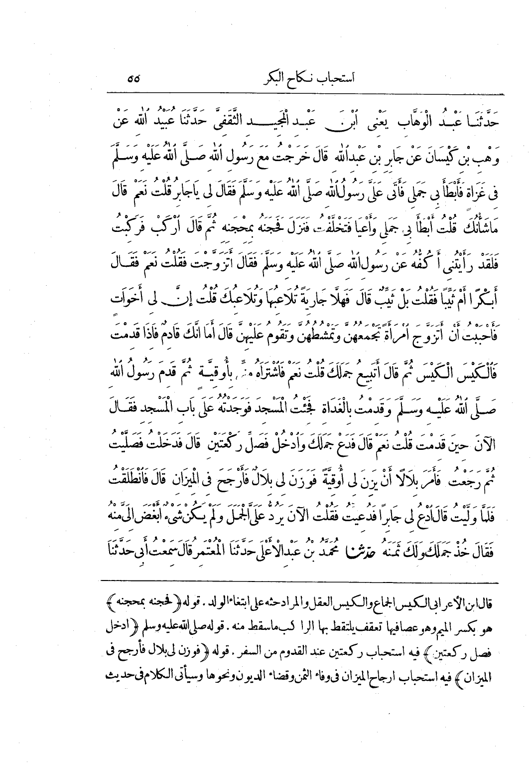 قال بن الْأَعْرَابِيِّ الْكَيْسُ الْجِمَاعُ وَالْكَيْسُ الْعَقْلُ وَالْمُرَادُ حَثُّهُ عَلَى ابْتِغَاءِ الْوَلَدِ قَوْلُهُ (فَحَجَنَهُ بِمِحْجَنِهِ) هُوَ بكسر الميم وهو عصافيها تَعَقُّفٌ يَلْتَقِطُ بِهَا الرَّاكِبُ مَا سَقَطَ مِنْهُ قَوْلُهُ صَلَّى اللَّهُ عَلَيْهِ وَسَلَّمَ (ادْخُلْ فَصَلِّ رَكْعَتَيْنِ) فِيهِ اسْتِحْبَابُ رَكْعَتَيْنِ عِنْدَ الْقُدُومِ مِنَ السَّفَرِ قَوْلُهُ (فَوَزَنَ لِي بِلَالٌ فَأَرْجَحَ فِي الْمِيزَانِ) فِيهِ اسْتِحْبَابُ إِرْجَاحِ الْمِيزَانِ فِي وَفَاءِ الثَّمَنِ وَقَضَاءِ الدُّيُونِ وَنَحْوِهَا وَسَيَأْتِي الْكَلَامُ فِي حديث