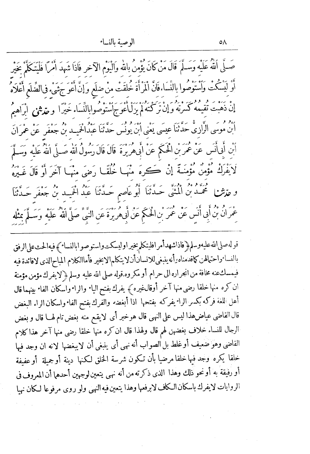 قَوْلُهُ صَلَّى اللَّهُ عَلَيْهِ وَسَلَّمَ (فَإِذَا شَهِدَ أَمْرًا فَلْيَتَكَلَّمْ بِخَيْرٍ أَوْ لِيَسْكُتْ وَاسْتَوْصُوا بِالنِّسَاءِ) فِيهِ الْحَثُّ عَلَى الرِّفْقِ بِالنِّسَاءِ وَاحْتِمَالِهِنَّ كَمَا قَدَّمْنَاهُ وَأَنَّهُ يَنْبَغِي لِلْإِنْسَانِ أَنْ لَا يَتَكَلَّمَ إِلَّا بِخَيْرٍ فَأَمَّا الْكَلَامُ الْمُبَاحُ الَّذِي لَا فَائِدَةَ فِيهِ فَيُمْسِكُ عَنْهُ مَخَافَةً مِنَ انْجِرَارِهِ إِلَى حَرَامٍ أَوْ مَكْرُوهٍ