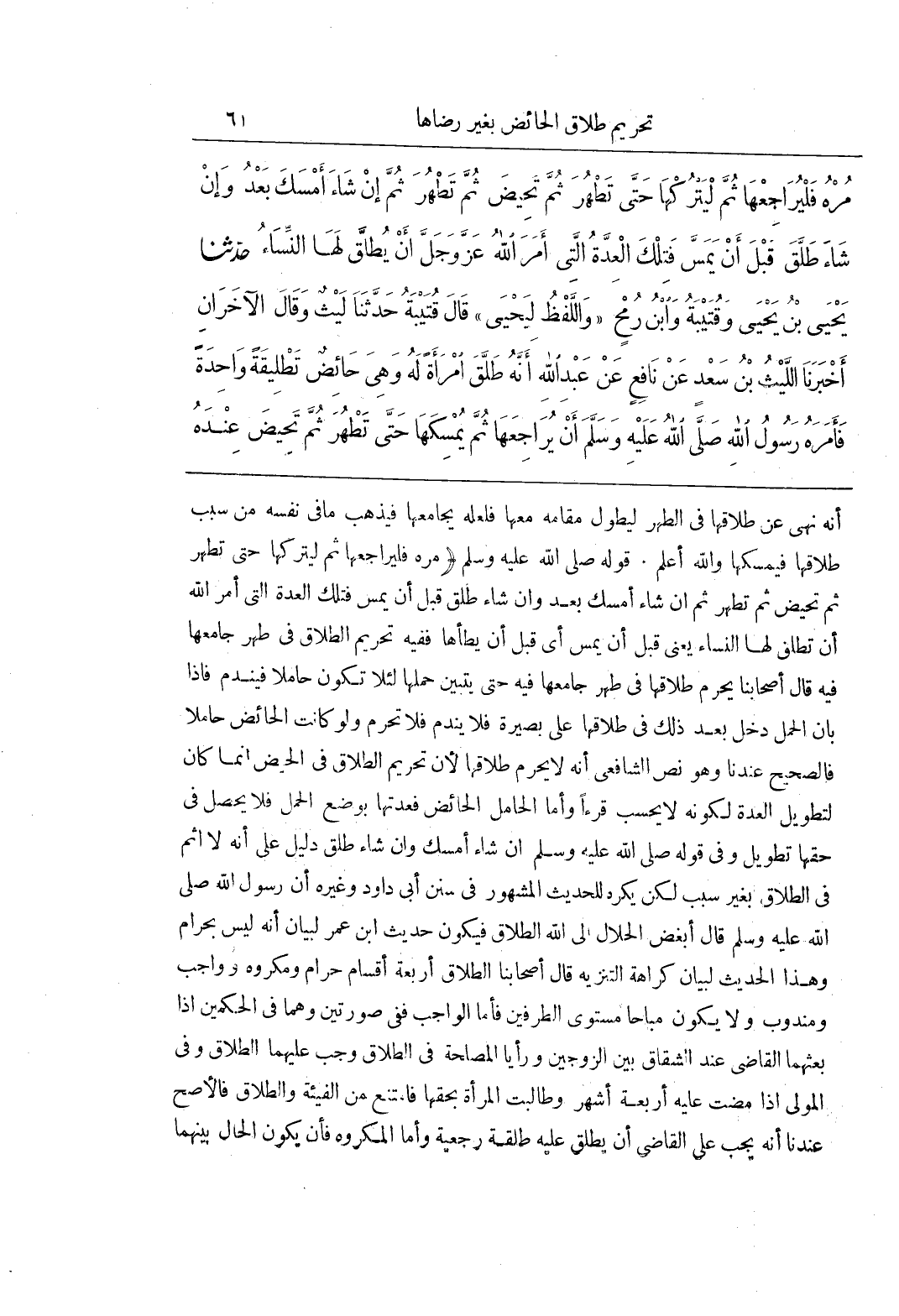 أَنَّهُ نُهِيَ عَنْ طَلَاقِهَا فِي الطُّهْرِ لِيَطُولَ مَقَامُهُ مَعَهَا فَلَعَلَّهُ يُجَامِعُهَا فَيَذْهَبُ مَا فِي نَفْسِهِ مِنْ سَبَبِ طَلَاقِهَا فَيُمْسِكُهَا وَاللَّهُ أَعْلَمُ قَوْلُهُ صَلَّى اللَّهُ عَلَيْهِ وَسَلَّمَ (مره فليراجعها ثُمَّ لْيَتْرُكْهَا حَتَّى تَطْهُرَ ثُمَّ تَحِيضَ ثُمَّ تَطْهُرَ ثُمَّ إِنْ شَاءَ أَمْسَكَ بَعْدُ وَإِنْ شَاءَ طَلَّقَ قَبْلَ أَنْ يَمَسَّ فَتِلْكَ الْعِدَّةُ التي أمر الله أن تطلق لَهَا النِّسَاءُ يَعْنِي قَبْلَ أَنْ يَمَسَّ أَيْ قَبْلَ أَنْ يَطَأَهَا فَفِيهِ تَحْرِيمُ الطَّلَاقِ فِي طُهْرٍ جَامَعَهَا فِيهِ قَالَ أَصْحَابُنَا يَحْرُمُ طَلَاقُهَا فِي طُهْرٍ جَامَعَهَا فِيهِ حَتَّى يَتَبَيَّنَ حَمْلُهَا لِئَلَّا تَكُونَ حَامِلًا فَيَنْدَمَ فَإِذَا بَانَ الْحَمْلُ دَخَلَ بَعْدَ ذَلِكَ فِي طَلَاقِهَا عَلَى بَصِيرَةٍ فَلَا يَنْدَمُ فَلَا تُحَرَّمُ وَلَوْ كَانَتِ الْحَائِضُ حاملا فالصحيح عندنا وهو نَصُّ الشَّافِعِيِّ أَنَّهُ لَا يَحْرُمُ طَلَاقُهَا لِأَنَّ تَحْرِيمَ الطَّلَاقِ فِي الْحَيْضِ إِنَّمَا كَانَ لِتَطْوِيلِ الْعِدَّةِ لِكَوْنِهِ لَا يُحْسَبُ قُرْءًا وَأَمَّا الْحَامِلُ الْحَائِضُ فَعِدَّتُهَا بِوَضْعِ الْحَمْلِ فَلَا يَحْصُلُ فِي حَقِّهَا تَطْوِيلٌ وَفِي قَوْلِهِ صَلَّى اللَّهُ عَلَيْهِ وَسَلَّمَ إِنْ شَاءَ أَمْسَكَ وَإِنْ شَاءَ طَلَّقَ دَلِيلٌ عَلَى أَنَّهُ لَا إِثْمَ فِي الطَّلَاقِ بِغَيْرِ سَبَبٍ لَكِنْ يُكْرَهُ لِلْحَدِيثِ الْمَشْهُورِ فِي سُنَنِ أَبِي دَاوُدَ وَغَيْرِهِ أَنَّ رَسُولَ اللَّهِ صَلَّى اللَّهُ عَلَيْهِ وَسَلَّمَ قَالَ أَبْغَضُ الْحَلَالِ إلى الله الطلاق فيكون حديث بن عُمَرَ لِبَيَانِ أَنَّهُ لَيْسَ بِحَرَامٍ وَهَذَا الْحَدِيثُ لِبَيَانِ كَرَاهَةِ التَّنْزِيهِ قَالَ أَصْحَابُنَا الطَّلَاقُ أَرْبَعَةُ أَقْسَامٍ حَرَامٌ وَمَكْرُوهٌ وَوَاجِبٌ وَمَنْدُوبٌ وَلَا يَكُونُ مُبَاحًا مُسْتَوِيَ الطَّرَفَيْنِ فَأَمَّا الْوَاجِبُ فَفِي صُورَتَيْنِ وَهُمَا فِي الْحَكَمَيْنِ إِذَا بَعَثَهُمَا الْقَاضِي عِنْدَ الشِّقَاقِ بَيْنَ الزَّوْجَيْنِ وَرَأَيَا الْمَصْلَحَةَ فِي الطَّلَاقِ وَجَبَ عَلَيْهِمَا الطَّلَاقُ وَفِي الْمُولِي إِذَا مَضَتْ عَلَيْهِ أَرْبَعَةُ أَشْهُرٍ وَطَالَبَتِ الْمَرْأَةُ بِحَقِّهَا فَامْتَنَعَ مِنَ الْفَيْئَةِ وَالطَّلَاقِ فَالْأَصَحُّ عِنْدَنَا أَنَّهُ يَجِبُ عَلَى الْقَاضِي أَنْ يُطَلِّقَ عَلَيْهِ طَلْقَةً رَجْعِيَّةً وَأَمَّا الْمَكْرُوهُ فَأَنْ يَكُونَ الْحَالُ بَيْنَهُمَا