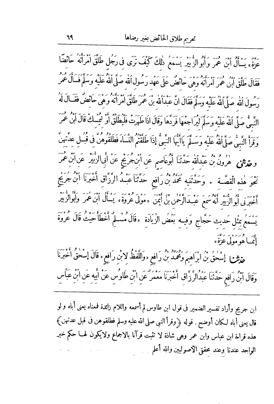 بن جريج وأراد تفسير الضمير في قوله بن طَاوُسٍ لَمْ أَسْمَعْهُ وَاللَّامُ زَائِدَةٌ فَمَعْنَاهُ يُعْنَى أَبَاهُ وَلَوْ قَالَ يَعْنِي أَبَاهُ لَكَانَ أَوْضَحَ قَوْلُهُ (وَقَرَأَ النَّبِيُّ صَلَّى اللَّهُ عَلَيْهِ وَسَلَّمَ فطلقوهن في قبل عدتهن) هذه قراءة بن عباس وبن عُمَرَ وَهِيَ شَاذَّةٌ لَا تَثْبُتُ قُرْآنًا بِالْإِجْمَاعِ وَلَا يَكُونُ لَهَا حُكْمُ خَبَرِ الْوَاحِدِ عِنْدَنَا وَعِنْدَ مُحَقِّقِي الْأُصُولِيِّينَ وَاللَّهُ أَعْلَمُ