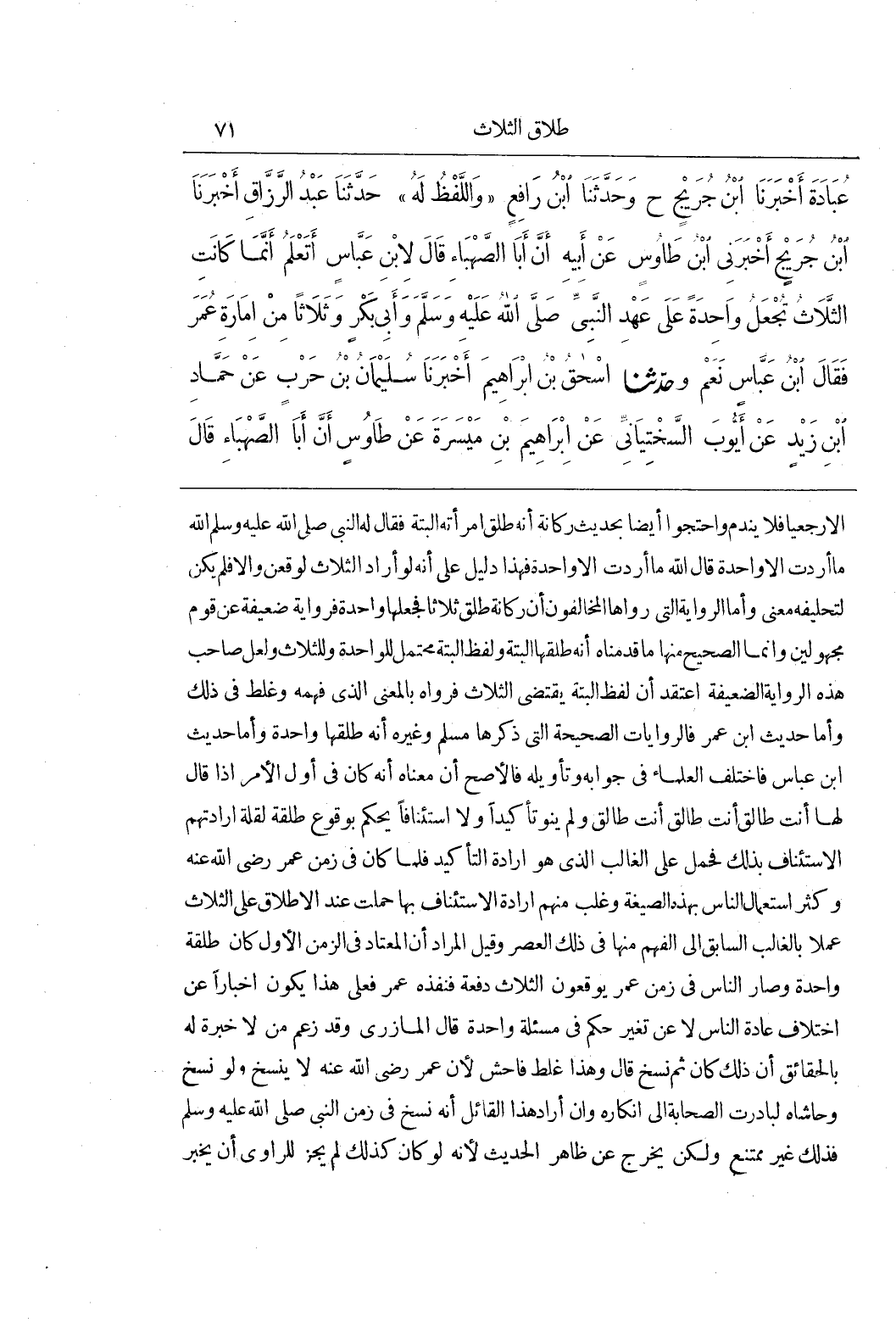 إِلَّا رَجْعِيًّا فَلَا يَنْدَمُ وَاحْتَجُّوا أَيْضًا بِحَدِيثِ رُكَانَةَ أَنَّهُ طَلَّقَ امْرَأَتَهُ أَلْبَتَّةَ فَقَالَ لَهُ النَّبِيُّ صَلَّى اللَّهُ عَلَيْهِ وَسَلَّمَ مَا أَرَدْتَ إِلَّا وَاحِدَةً قَالَ اللَّهَ مَا أَرَدْتُ إِلَّا وَاحِدَةً فَهَذَا دَلِيلٌ عَلَى أَنَّهُ لَوْ أَرَادَ الثَّلَاثَ لَوَقَعْنَ وَإِلَّا فَلَمْ يَكُنْ لِتَحْلِيفِهِ مَعْنًى وَأَمَّا الرِّوَايَةُ الَّتِي رَوَاهَا الْمُخَالِفُونَ أَنَّ رُكَانَةُ طَلَّقَ ثَلَاثًا فَجَعَلَهَا وَاحِدَةً فَرِوَايَةٌ ضَعِيفَةٌ عَنْ قَوْمٍ مَجْهُولِينَ وَإِنَّمَا الصَّحِيحُ مِنْهَا مَا قَدَّمْنَاهُ أَنَّهُ طَلَّقَهَا أَلْبَتَّةَ وَلَفْظُ أَلْبَتَّةَ مُحْتَمِلٌ لِلْوَاحِدَةِ وَلِلثَّلَاثِ وَلَعَلَّ صَاحِبَ هَذِهِ الرِّوَايَةِ الضَّعِيفَةِ اعْتَقَدَ أَنَّ لَفْظَ أَلْبَتَّةَ يَقْتَضِي الثَّلَاثَ فَرَوَاهُ بِالْمَعْنَى الَّذِي فَهِمَهُ وَغَلِطَ فِي ذَلِكَ وأما حديث بن عُمَرَ فَالرِّوَايَاتُ الصَّحِيحَةُ الَّتِي ذَكَرَهَا مُسْلِمٌ وَغَيْرُهُ أنه طلقها واحدة وأما حديث بن عَبَّاسٍ فَاخْتَلَفَ الْعُلَمَاءُ فِي جَوَابِهِ وَتَأْوِيلِهِ فَالْأَصَحُّ أَنَّ مَعْنَاهُ أَنَّهُ كَانَ فِي أَوَّلِ الْأَمْرِ إِذَا قَالَ لَهَا أَنْتِ طَالِقٌ أَنْتِ طَالِقٌ أَنْتِ طَالِقٌ وَلَمْ يَنْوِ تَأْكِيدًا وَلَا اسْتِئْنَافًا يُحْكَمُ بِوُقُوعِ طَلْقَةٍ لِقِلَّةِ إِرَادَتِهِمُ الِاسْتِئْنَافَ بِذَلِكَ فَحُمِلَ عَلَى الْغَالِبِ الَّذِي هُوَ إِرَادَةُ التَّأْكِيدِ فَلَمَّا كَانَ فِي زَمَنِ عُمَرَ رَضِيَ اللَّهُ عَنْهُ وَكَثُرَ اسْتِعْمَالُ النَّاسِ بِهَذِهِ الصِّيغَةِ وَغَلَبَ مِنْهُمْ إِرَادَةُ الِاسْتِئْنَافِ بِهَا حُمِلَتْ عِنْدَ الْإِطْلَاقِ عَلَى الثَّلَاثِ عَمَلًا بِالْغَالِبِ السَّابِقِ إِلَى الْفَهْمِ مِنْهَا فِي ذَلِكَ الْعَصْرِ وَقِيلَ الْمُرَادُ أَنَّ الْمُعْتَادَ فِي الزَّمَنِ الْأَوَّلِ كَانَ طَلْقَةً وَاحِدَةً وَصَارَ النَّاسُ فِي زَمَنِ عُمَرَ يُوقِعُونَ الثَّلَاثَ دَفْعَةً فَنَفَذَهُ عُمَرُ فَعَلَى هَذَا يَكُونُ إِخْبَارًا عَنِ اخْتِلَافِ عَادَةِ النَّاسِ لَا عَنْ تَغَيُّرِ حُكْمٍ فِي مَسْأَلَةٍ وَاحِدَةٍ قَالَ الْمَازِرِيُّ وَقَدْ زَعَمَ مَنْ لَا خِبْرَةَ لَهُ بِالْحَقَائِقِ أَنَّ ذَلِكَ كَانَ ثُمَّ نُسِخَ قَالَ وَهَذَا غَلَطٌ فَاحِشٌ لِأَنَّ عُمَرَ رَضِيَ اللَّهُ عَنْهُ لَا يَنْسَخُ وَلَوْ نَسَخَ وَحَاشَاهُ لَبَادَرَتِ الصَّحَابَةُ إِلَى إِنْكَارِهِ وَإِنْ أَرَادَ هَذَا الْقَائِلُ أَنَّهُ نُسِخَ فِي زَمَنِ النَّبِيِّ صَلَّى اللَّهُ عَلَيْهِ وَسَلَّمَ فَذَلِكَ غَيْرُ مُمْتَنِعٍ وَلَكِنْ يَخْرُجُ عَنْ ظَاهِرِ الْحَدِيثِ لِأَنَّهُ لَوْ كَانَ كَذَلِكَ لَمْ يَجُزْ لِلرَّاوِي أَنْ يُخْبِرَ