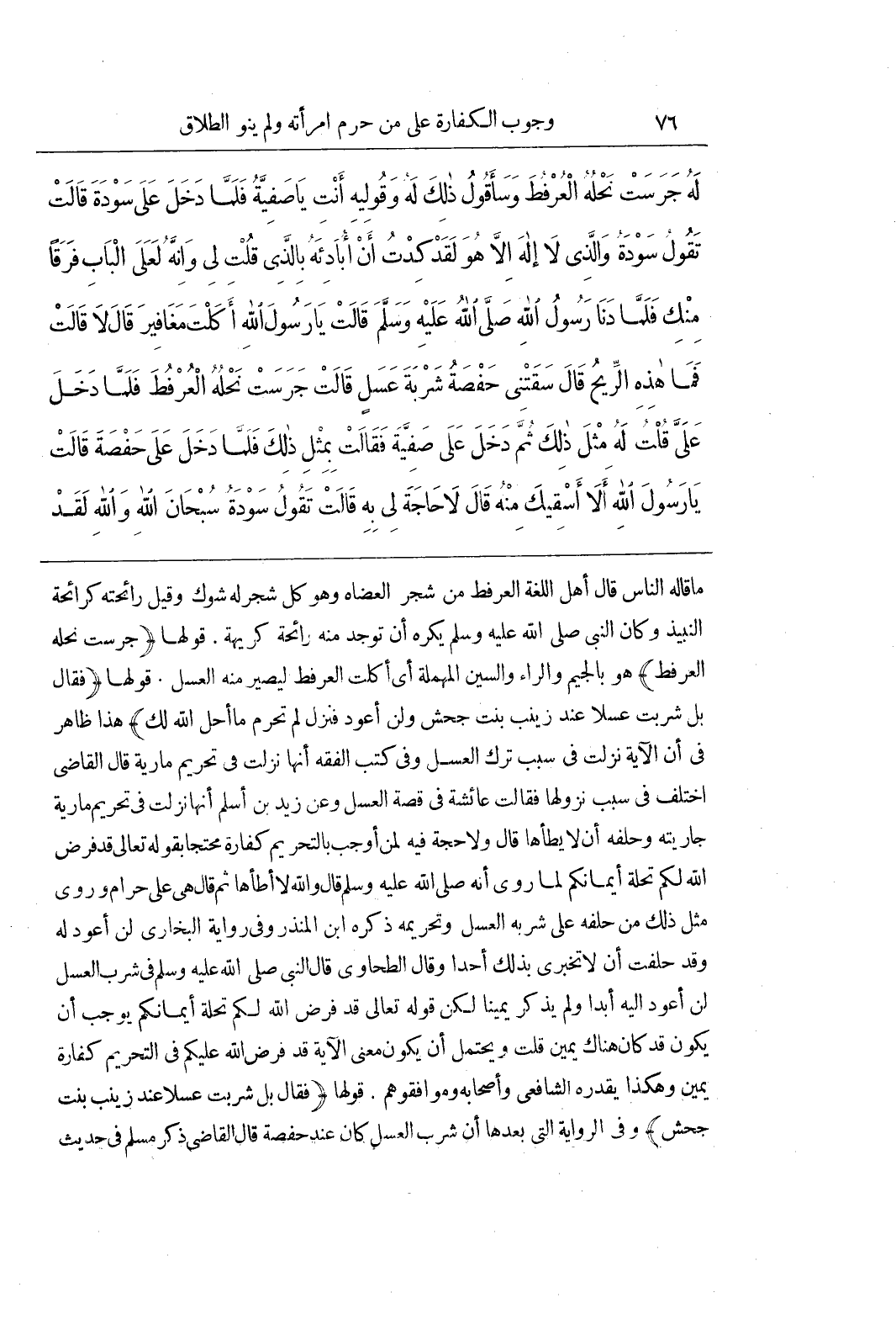 مَا قَالَهُ النَّاسُ قَالَ أَهْلُ اللُّغَةِ الْعُرْفُطُ مِنْ شَجَرِ الْعِضَاهِ وَهُوَ كُلُّ شَجَرٍ لَهُ شَوْكٌ وَقِيلَ رَائِحَتُهُ كَرَائِحَةِ النَّبِيذِ وَكَانَ النَّبِيُّ صَلَّى اللَّهُ عَلَيْهِ وَسَلَّمَ يَكْرَهُ أَنْ تُوجَدَ مِنْهُ رَائِحَةٌ كَرِيهَةٌ قَوْلُهَا (جَرَسَتْ نَحْلُهُ الْعُرْفُطَ) هُوَ بِالْجِيمِ وَالرَّاءِ وَالسِّينِ الْمُهْمَلَةِ أَيْ أَكَلَتِ الْعُرْفُطَ لِيَصِيرَ مِنْهُ الْعَسَلُ قوْلُهَا (فَقَالَ بَلْ شربت عسلا عند زينب بن جَحْشٍ وَلَنْ أَعُودَ فَنَزَلَ لِمَ تُحَرِّمُ مَا أحل الله لك) هَذَا ظَاهِرٌ فِي أَنَّ الْآيَةَ نَزَلَتْ فِي سَبَبِ تَرْكِ الْعَسَلِ وَفِي كُتُبِ الْفِقْهِ أَنَّهَا نَزَلَتْ فِي تَحْرِيمِ مَارِيَةَ قَالَ الْقَاضِي اخْتُلِفَ فِي سَبَبِ نُزُولِهَا فَقَالَتْ عَائِشَةُ فِي قِصَّةِ الْعَسَلِ وَعَنْ زَيْدِ بْنِ أَسْلَمَ أَنَّهَا نَزَلَتْ فِي تَحْرِيمِ مَارِيَةَ جَارِيَتِهِ وَحَلِفِهِ أَنْ لَا يَطَأَهَا قَالَ وَلَا حُجَّةَ فِيهِ لِمَنْ أَوْجَبَ بِالتَّحْرِيمِ كَفَّارَةً مُحْتَجًّا بِقَوْلِهِ تَعَالَى قَدْ فَرَضَ الله لكم تحلة أيمانكم لِمَا رُوِي أَنَّهُ صَلَّى اللَّهُ عَلَيْهِ وَسَلَّمَ قَالَ وَاللَّهِ لَا أَطَأُهَا ثُمَّ قَالَ هِيَ عَلَيَّ حَرَامٌ وَرُوِيَ مِثْلُ ذَلِكَ مِنْ حَلِفِهِ على شربه العسل وتحريمه ذكره بن الْمُنْذِرِ وَفِي رِوَايَةِ الْبُخَارِيِّ لَنْ أَعُودَ لَهُ وقد حلفت أن لا تخبره بِذَلِكَ أَحَدًا وَقَالَ الطَّحَاوِيُّ قَالَ النَّبِيُّ صَلَّى اللَّهُ عَلَيْهِ وَسَلَّمَ فِي شُرْبِ الْعَسَلِ لَنْ أَعُودَ إِلَيْهِ أَبَدًا وَلَمْ يَذْكُرْ يَمِينًا لَكِنْ قوله تعالى قَدْ فَرَضَ اللَّهُ عَلَيْكُمْ فِي التَّحْرِيمِ كَفَّارَةَ يَمِينٍ وَهَكَذَا يُقَدِّرُهُ الشَّافِعِيُّ وَأَصْحَابُهُ وَمُوَافِقُوهُمْ قَوْلُهَا (فَقَالَ بَلْ شَرِبْتُ عَسَلًا عِنْدَ زَيْنَبَ بِنْتِ جَحْشٍ) وَفِي الرِّوَايَةِ الَّتِي بَعْدَهَا أَنَّ شُرْبَ الْعَسَلِ كَانَ عِنْدَ حَفْصَةَ قَالَ الْقَاضِي ذَكَرَ مسلم فى حديث