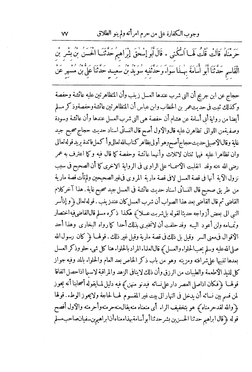 حجاج عن بن جُرَيْجٍ أَنَّ الَّتِي شَرِبَ عِنْدهَا الْعَسَلَ زَيْنَبُ وَأَنَّ الْمُتَظَاهِرَتَيْنِ عَلَيْهِ عَائِشَةُ وَحَفْصَةُ وَكَذَلِكَ ثَبَتَ فى حديث عمر بن الخطاب وبن عَبَّاسٍ أَنَّ الْمُتَظَاهِرَتَيْنِ عَائِشَةُ وَحَفْصَةُ وَذَكَرَ مُسْلِمٌ أَيْضًا مِنْ رِوَايَةِ أَبِي أُسَامَةَ عَنْ هِشَامٍ أَنَّ حَفْصَةَ هِيَ الَّتِي شَرِبَ الْعَسَلَ عِنْدَهَا وَأَنَّ عَائِشَةَ وَسَوْدَةَ وَصْفِيَّةَ مِنَ اللَّوَاتِي تَظَاهَرْنَ عليه وقال وَالْأَوَّلُ أَصَحُّ قَالَ النَّسَائِيُّ إِسْنَادُ حَدِيثِ حَجَّاجٍ صَحِيحٌ جَيِّدٌ غَايَةٌ وَقَالَ الْأَصِيلِيُّ حَدِيثُ حَجَّاجٍ أَصَحُّ وَهُوَ أَوْلَى بِظَاهِرِ كِتَابِ اللَّهِ تَعَالَى وَأَكْمَلُ فَائِدَةً يُرِيدُ قَوْلَهُ تَعَالَى وَإِنْ تَظَاهَرَا عَلَيْهِ فَهُمَا اثْنَتَانِ لَا ثَلَاثٌ وَأَنَّهُمَا عَائِشَةُ وَحَفْصَةُ كَمَا قَالَ فِيهِ وَكَمَا اعْتَرَفَ بِهِ عُمَرُ رَضِيَ اللَّهُ عَنْهُ وَقَدِ انْقَلَبَتِ الْأَسْمَاءُ على الرواى فِي الرِّوَايَةِ الْأُخْرَى كَمَا أَنَّ الصَّحِيحَ فِي سَبَبِ نُزُولِ الْآيَةِ أَنَّهَا فِي قِصَّةِ الْعَسَلِ لا في قصة مارية المروى فِي غَيْرِ الصَّحِيحَيْنِ وَلَمْ تَأْتِ قِصَّةُ مَارِيَةَ مِنْ طَرِيقٍ صَحِيحٍ قَالَ النَّسَائِيُّ إِسْنَادُ حَدِيثِ عَائِشَةَ فِي الْعَسَلِ جَيِّدٌ صَحِيحٌ غَايَةٌ هَذَا آخِرُ كَلَامِ الْقَاضِي ثُمَّ قَالَ الْقَاضِي بَعْدَ هَذَا الصَّوَابُ أَنَّ شُرْبَ الْعَسَلِ كَانَ عِنْدَ زَيْنَبَ قَوْلُهُ تَعَالَى (وَإِذْ أَسَرَّ النَّبِيُّ إِلَى بعض أزواجه حديثا لِقَوْلِهِ بَلْ شَرِبْتُ عَسَلًا) هَكَذَا ذَكَرَهُ مُسْلِمٌ قَالَ الْقَاضِي فِيهِ اخْتِصَارٌ وَتَمَامُهُ وَلَنْ أَعُودَ إِلَيْهِ وَقَدْ حَلَفْتُ أَنْ لَا تُخْبِرِي بِذَلِكَ أَحَدًا كَمَا رَوَاهُ الْبُخَارِيُّ وَهَذَا أَحَدُ الْأَقْوَالِ فِي مَعْنَى السِّرِّ وَقِيلَ بَلْ ذَلِكَ فِي قِصَّةِ مَارِيَةَ وَقِيلَ غَيْرُ ذَلِكَ قَوْلُهَا (كَانَ رَسُولُ اللَّهِ صَلَّى اللَّهُ عَلَيْهِ وَسَلَّمَ يُحِبُّ الْحَلْوَاءَ وَالْعَسَلَ) قَالَ الْعُلَمَاءُ الْمُرَادُ بِالْحَلْوَاءِ هُنَا كل شئ حُلْوٍ وَذَكَرَ الْعَسَلَ بَعْدَهَا تَنْبِيهًا عَلَى شَرَافَتِهِ وَمَزِيَّتِهِ وَهُوَ مِنْ بَابِ ذِكْرِ الْخَاصِّ بَعْدَ الْعَامِّ وَالْحَلْوَاءُ بِالْمَدِّ وَفِيهِ جَوَازُ كُلِّ لَذِيذِ الْأَطْعِمَةِ وَالطَّيِّبَاتِ مِنَ الرِّزْقِ وَأَنَّ ذَلِكَ لَا يُنَافِي الزُّهْدَ وَالْمُرَاقَبَةَ لَا سِيَّمَا إِذَا حَصَلَ اتِّفَاقًا قَوْلُهَا (فَكَانَ إِذَا صَلَّى الْعَصْرَ دَارَ عَلَى نِسَائِهِ فَيَدْنُو مِنْهُنَّ) فِيهِ دَلِيلٌ لِمَا يَقُولُهُ أَصْحَابُنَا إِنَّهُ يَجُوزُ لِمَنْ قَسَمَ بَيْنَ نِسَائِهِ أَنْ يَدْخُلَ فِي النَّهَارِ إِلَى بَيْتِ غَيْرِ الْمَقْسُومِ لَهَا لِحَاجَةٍ وَلَا يَجُوزُ الْوَطْءُ قَوْلُهَا (وَاللَّهِ لَقَدْ حَرَمْنَاهُ) هُوَ بِتَخْفِيفِ الرَّاءِ أَيْ مَنَعْنَاهُ مِنْهُ يُقَالُ مِنْهُ حَرَّمْتُهُ وَأَحْرَمْتُهُ وَالْأَوَّلُ أَفْصَحُ قَوْلُهُ (قَالَ إِبْرَاهِيمُ حَدَّثَنَا الْحَسَنُ بْنُ بِشْرٍ حَدَّثَنَا أَبُو أُسَامَةَ بِهَذَا مَعْنَاهُ أَنَّ إِبْرَاهِيمَ بْنَ سُفْيَانَ صَاحِبَ مُسْلِمٍ