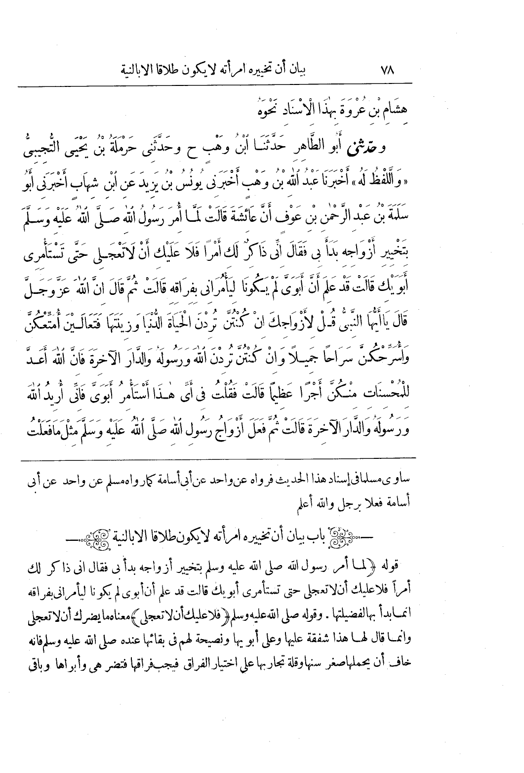 [1475] قَوْلُهُ (لَمَّا أَمْرِ رَسُولِ اللَّهِ صَلَّى اللَّهُ عَلَيْهِ وَسَلَّمَ بِتَخْيِيرِ أَزْوَاجِهِ بَدَأَ بِي فَقَالَ إِنِّي ذاكر لك أمرا فلا عليك أن لا تَعْجَلِي حَتَّى تَسْتَأْمِرِي أَبَوَيْكِ قَالَتْ قَدْ عَلِمَ أَنَّ أَبَوَيَّ لَمْ يَكُونَا لِيَأْمُرَانِي بِفِرَاقِهِ إِنَّمَا بَدَأَ بِهَا لِفَضِيلَتِهَا وَقَوْلُهُ صَلَّى اللَّهُ عَلَيْهِ وَسَلَّمَ (فَلَا عَلَيْكِ أَنْ لَا تَعْجَلِي) مَعْنَاهُ ما يضرك أن لا تَعْجَلِي وَإِنَّمَا قَالَ لَهَا هَذَا شَفَقَةً عَلَيْهَا وَعَلَى أَبَوَيْهَا وَنَصِيحَةً لَهُمْ فِي بَقَائِهَا عِنْدَهُ صَلَّى اللَّهُ عَلَيْهِ وَسَلَّمَ فَإِنَّهُ خَافَ أَنْ يَحْمِلَهَا صِغَرُ سِنِّهَا وَقِلَّةُ تَجَارِبِهَا عَلَى اخْتِيَارِ الْفِرَاقِ فَيَجِبُ فِرَاقُهَا فَتُضَرُّ هِيَ وَأَبَوَاهَا وَبَاقِي