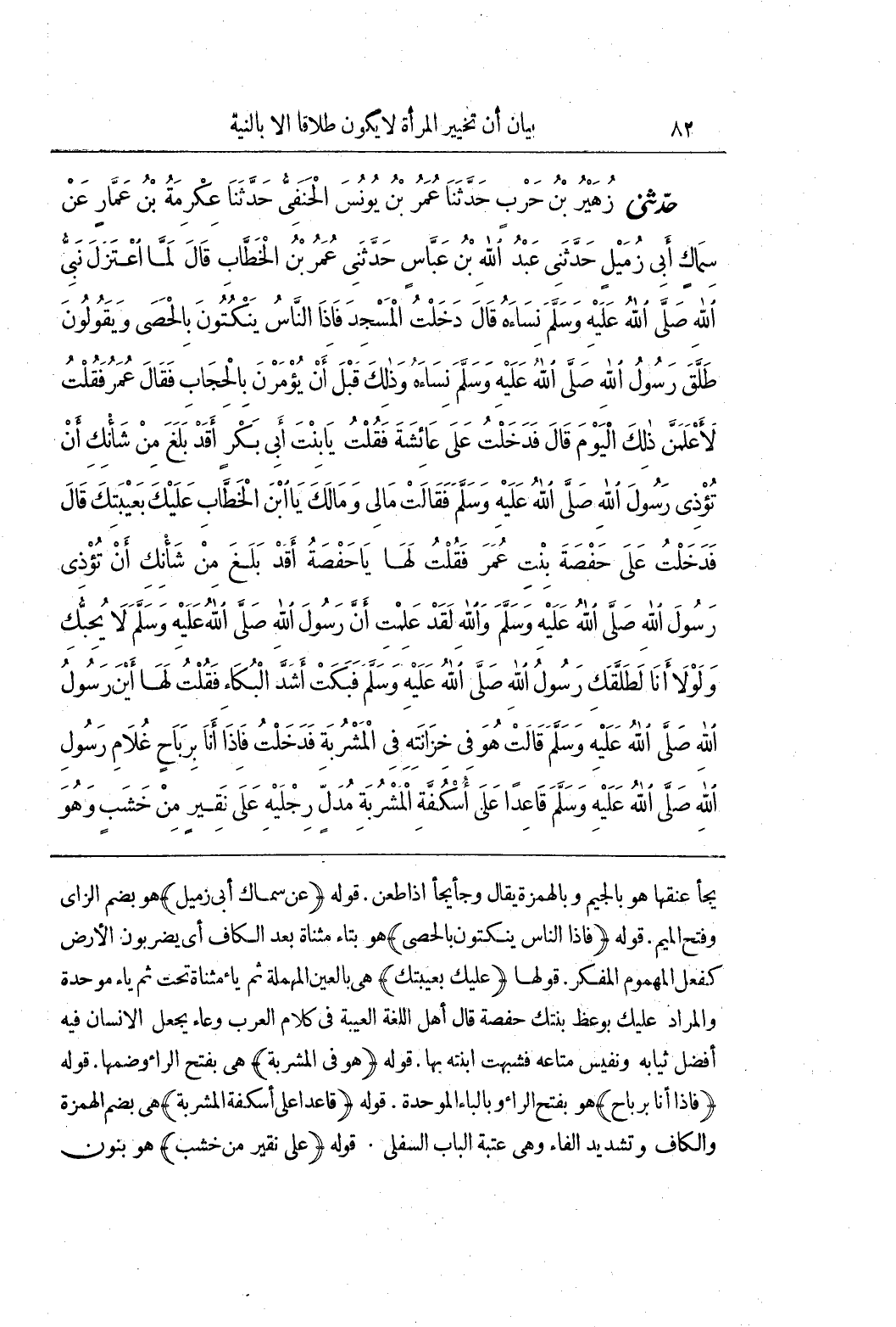 [1479] قَوْلُهُ (عَنْ سِمَاكٍ أَبِي زُمَيْلٍ) هُوَ بِضَمِّ الزَّاي وَفَتْحِ الْمِيمِ قَوْلُهُ (فَإِذَا النَّاسُ يُنَكِّتُونَ بِالْحَصَى) هُوَ بِتَاءٍ مُثَنَّاةٍ بَعْدَ الْكَافِ أَيْ يضربون الأرض كفعل المهموم المفكر قولها (فَإِذَا النَّاسُ يُنَكِّتُونَ بِالْحَصَى) هُوَ بِتَاءٍ مُثَنَّاةٍ بَعْدَ الْكَافِ أَيْ يَضْرِبُونَ الْأَرْضَ كَفِعْلِ الْمَهْمُومِ الْمُفَكِّرِ قَوْلُهَا (عَلَيْكَ بِعَيْبَتِكَ) هِيَ بِالْعَيْنِ الْمُهْمَلَةِ ثم ياء مثناة تحت ثم ياء موحدة والمراد عليك بوعظ بنتك حَفْصَةَ قَالَ أَهْلُ اللُّغَةِ الْعَيْبَةُ فِي كَلَامِ الْعَرَبِ وِعَاءٌ يَجْعَلُ الْإِنْسَانُ فِيهِ أَفْضَلَ ثِيَابِهِ وَنَفِيسَ مَتَاعِهِ فَشَبَّهَتِ ابْنَتَهُ بِهَا قَوْلُهُ (هُوَ فِي الْمِشْرَبَةِ) هِيَ بِفَتْحِ الرَّاءِ وَضَمِّهَا قَوْلُهُ (فَإِذَا أَنَا بِرَبَاحٍ) هُوَ بِفَتْحِ الرَّاءِ وَبِالْبَاءِ الْمُوَحَّدَةِ قَوْلُهُ (قَاعِدًا عَلَى أُسْكُفَّةِ الْمِشْرَبَةِ) هِيَ بِضَمِّ الْهَمْزَةِ وَالْكَافِ وَتَشْدِيدِ الْفَاءِ وَهِيَ عَتَبَةُ الْبَابِ السُّفْلَى قَوْلُهُ (عَلَى نَقِيرٍ مِنْ خَشَبٍ) هو بنون