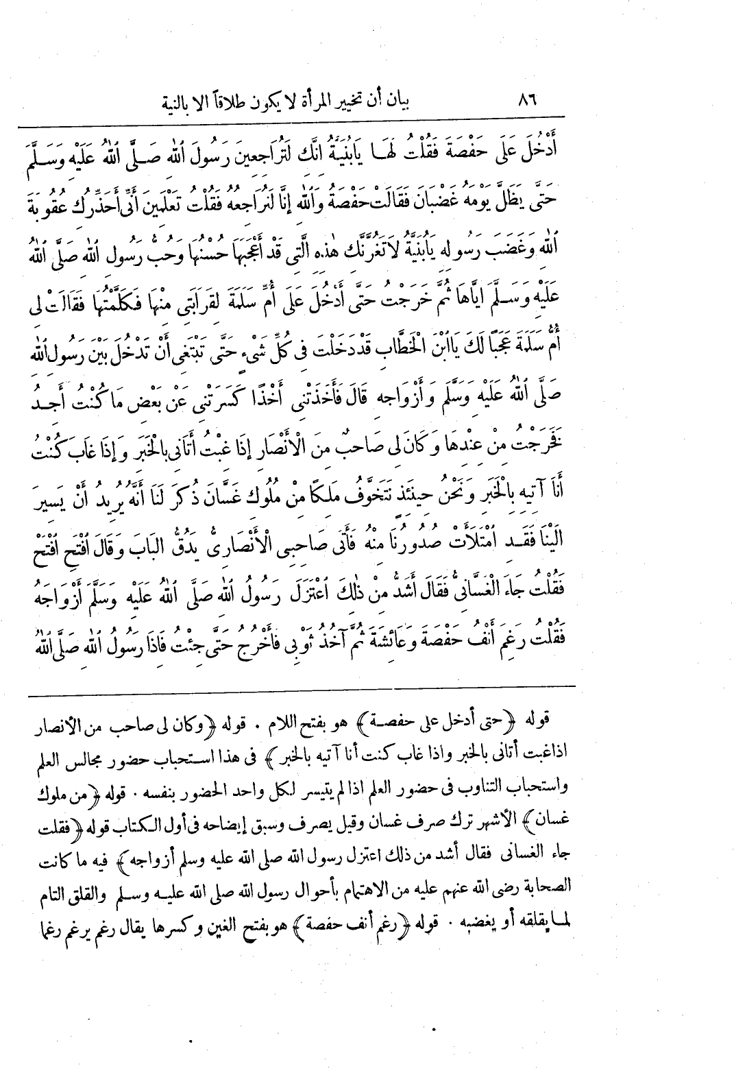 قَوْلُهُ (حَتَّى أَدْخُلَ عَلَى حَفْصَةَ) هُوَ بِفَتْحِ اللَّامِ قَوْلُهُ (وَكَانَ لِي صَاحِبٌ مِنَ الْأَنْصَارِ إِذَا غِبْتُ أَتَانِي بِالْخَبَرِ وَإِذَا غَابَ كُنْتُ أَنَا آتِيهِ بِالْخَبَرِ) فِي هَذَا اسْتِحْبَابُ حُضُورِ مَجَالِسِ الْعِلْمِ وَاسْتِحْبَابُ التَّنَاوُبِ فِي حُضُورِ الْعِلْمِ إِذَا لَمْ يَتَيَسَّرْ لِكُلِّ وَاحِدٍ الْحُضُورُ بِنَفْسِهِ قَوْلُهُ (مِنْ مُلُوكِ غَسَّانَ) الْأَشْهَرُ تَرْكُ صَرْفِ غَسَّانَ وَقِيلَ يُصْرَفُ وَسَبَقَ إِيضَاحُهُ فِي أَوَّلِ الْكِتَابِ قَوْلُهُ (فَقُلْتُ جَاءَ الْغَسَّانِيُّ فَقَالَ أَشَدَّ مِنْ ذَلِكَ اعْتَزَلَ رَسُولُ اللَّهِ صَلَّى اللَّهُ عَلَيْهِ وَسَلَّمَ أَزْوَاجَهُ) فِيهِ مَا كَانَتِ الصَّحَابَةُ رَضِيَ اللَّهُ عَنْهُمْ عَلَيْهِ مِنَ الِاهْتِمَامِ بِأَحْوَالِ رَسُولِ اللَّهِ صَلَّى اللَّهُ عَلَيْهِ وَسَلَّمَ وَالْقَلَقِ التَّامِّ لِمَا يُقْلِقُهُ أَوْ يُغْضِبُهُ قَوْلُهُ (رَغِمَ أَنْفُ حَفْصَةَ) هُوَ بِفَتْحِ الْغَيْنِ وَكَسْرِهَا يُقَالُ رَغِمَ يَرْغَمُ رَغْمًا