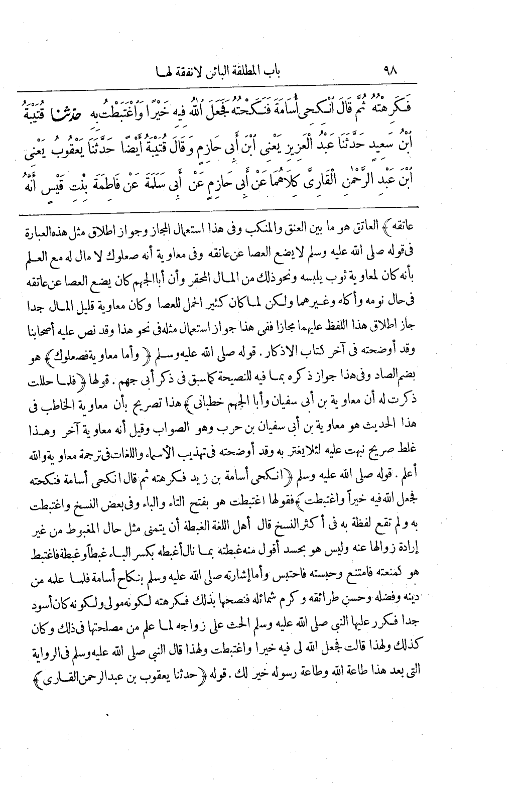 عَاتِقِهِ) الْعَاتِقُ هُوَ مَا بَيْنَ الْعُنُقِ وَالْمَنْكِبِ وَفِي هَذَا اسْتِعْمَالُ الْمَجَازِ وَجَوَازُ إِطْلَاقِ مِثْلِ هَذِهِ الْعِبَارَةِ فِي قَوْلِهِ صَلَّى اللَّهُ عَلَيْهِ وَسَلَّمَ لَا يَضَعُ الْعَصَا عَنْ عَاتِقِهِ وَفِي مُعَاوِيَةَ أَنَّهُ صُعْلُوكٌ لَا مَالَ لَهُ مَعَ الْعِلْمِ بِأَنَّهُ كَانَ لِمُعَاوِيَةَ ثَوْبٌ يَلْبَسُهُ وَنَحْوُ ذَلِكَ مِنَ الْمَالِ الْمُحَقَّرِ وَأَنَّ أَبَا الْجَهْمِ كَانَ يَضَعُ الْعَصَا عَنْ عَاتِقِهِ فِي حَالِ نَوْمِهِ وَأَكْلِهِ وَغَيْرِهِمَا وَلَكِنْ لَمَّا كَانَ كَثِيرَ الْحَمْلِ لِلْعَصَا وَكَانَ مُعَاوِيَةُ قَلِيلَ الْمَالِ جِدًّا جَازَ إِطْلَاقُ هَذَا اللَّفْظِ عَلَيْهِمَا مَجَازًا فَفِي هَذَا جَوَازُ اسْتِعْمَالِ مِثْلِهِ فِي نَحْوِ هَذَا وَقَدْ نَصَّ عَلَيْهِ أَصْحَابُنَا وَقَدْ أَوْضَحْتُهُ فِي آخِرِ كِتَابِ الْأَذْكَارِ قَوْلُهُ صَلَّى اللَّهُ عَلَيْهِ وَسَلَّمَ (وَأَمَّا مُعَاوِيَةُ فَصُعْلُوكٌ) هُوَ بِضَمِّ الصَّادِ وَفِي هَذَا جَوَازُ ذِكْرِهِ بِمَا فِيهِ لِلنَّصِيحَةِ كَمَا سَبَقَ فِي ذِكْرِ أَبِي جَهْمٍ قَوْلُهَا (فَلَمَّا حَلَلْتُ ذَكَرْتُ لَهُ أَنَّ مُعَاوِيَةَ بْنَ أَبِي سُفْيَانَ وَأَبَا الْجَهْمِ خَطَبَانِي) هَذَا تَصْرِيحٌ بِأَنَّ مُعَاوِيَةَ الْخَاطِبَ فِي هَذَا الْحَدِيثِ هُوَ مُعَاوِيَةُ بْنُ أَبِي سُفْيَانَ بْنِ حَرْبٍ وَهُوَ الصَّوَابُ وَقِيلَ إِنَّهُ مُعَاوِيَةُ آخَرُ وَهَذَا غَلَطٌ صَرِيحٌ نَبَّهْتُ عَلَيْهِ لِئَلَّا يُغْتَرَّ بِهِ وَقَدْ أَوْضَحْتُهُ فِي تَهْذِيبِ الْأَسْمَاءِ وَاللُّغَاتِ فِي تَرْجَمَةِ مُعَاوِيَةَ وَاللَّهُ أَعْلَمُ قَوْلُهُ صَلَّى اللَّهُ عَلَيْهِ وَسَلَّمَ (انْكِحِي أُسَامَةَ بْنَ زَيْدٍ فَكَرِهْتُهُ ثُمَّ قَالَ انْكِحِي أُسَامَةَ فَنَكَحْتُهُ فَجَعَلَ اللَّهُ فِيهِ خَيْرًا وَاغْتَبَطْتُ) فَقَوْلُهَا اغْتَبَطْتُ هُوَ بِفَتْحِ التَّاءِ وَالْبَاءِ وَفِي بَعْضِ النُّسَخِ وَاغْتَبَطْتُ بِهِ وَلَمْ تَقَعْ لَفْظَةُ بِهِ فِي أَكْثَرِ النُّسَخِ قَالَ أَهْلُ اللُّغَةِ الْغِبْطَةُ أَنْ يُتَمَنَّى مِثْلُ حَالِ الْمَغْبُوطِ مِنْ غَيْرِ إِرَادَةِ زَوَالِهَا عَنْهُ وَلَيْسَ هُوَ بِحَسَدٍ أَقُولُ مِنْهُ غَبَطْتُهُ بِمَا نَالَ أَغْبِطُهُ بِكَسْرِ الْبَاءِ غَبْطًا وَغِبْطَةً فَاغْتَبَطَ هُوَ كَمَنَعْتُهُ فَامْتَنَعَ وَحَبَسْتُهُ فَاحْتَبَسَ وَأَمَّا إِشَارَتُهُ صَلَّى اللَّهُ عَلَيْهِ وَسَلَّمَ بِنِكَاحِ أُسَامَةَ فَلِمَا عَلِمَهُ من دينه وفضله وحسن طرائقه وَكَرَمِ شَمَائِلِهِ فَنَصَحَهَا بِذَلِكَ فَكَرِهَتْهُ لِكَوْنِهِ مَوْلًى ولكونه كان أَسْوَدَ جِدًّا فَكَرَّرَ عَلَيْهَا النَّبِيُّ صَلَّى اللَّهُ عَلَيْهِ وَسَلَّمَ الْحَثَّ عَلَى زَوَاجِهِ لِمَا عَلِمَ مِنْ مَصْلَحَتِهَا فِي ذَلِكَ وَكَانَ كَذَلِكَ وَلِهَذَا قَالَتْ فَجَعَلَ اللَّهُ لِي فِيهِ خَيْرًا وَاغْتَبَطْتُ وَلِهَذَا قَالَ النَّبِيُّ صَلَّى اللَّهُ عَلَيْهِ وَسَلَّمَ فِي الرِّوَايَةِ الَّتِي بَعْدَ هَذَا طَاعَةُ اللَّهِ وَطَاعَةُ رَسُولِهِ خَيْرٌ لَكِ قَوْلُهُ (حَدَّثَنَا يَعْقُوبُ بن عبد الرحمن القارىء