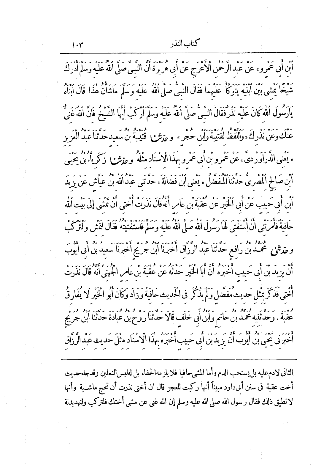 الثَّانِي لَا دَمَ عَلَيْهِ بَلْ يُسْتَحَبُّ الدَّمُ وَأَمَّا الْمَشْيُ حَافِيًا فَلَا يَلْزَمُهُ الْحَفَاءُ بَلْ لَهُ لُبْسُ النَّعْلَيْنِ وَقَدْ جَاءَ حَدِيثُ أُخْتِ عقبة في سنن أبي داود مبينا أَنَّهَا رَكِبَتْ لِلْعَجْزِ قَالَ إِنَّ أُخْتِي نَذَرَتْ أَنْ تَحُجَّ مَاشِيَةً وَأَنَّهَا لَا تُطِيقُ ذَلِكَ فَقَالَ رَسُولُ اللَّهِ صَلَّى اللَّهُ عَلَيْهِ وَسَلَّمَ إِنَّ اللَّهَ غَنِيٌّ عَنْ مَشْيِ أُخْتِكَ فَلْتَرْكَبْ ولتهد بدنة