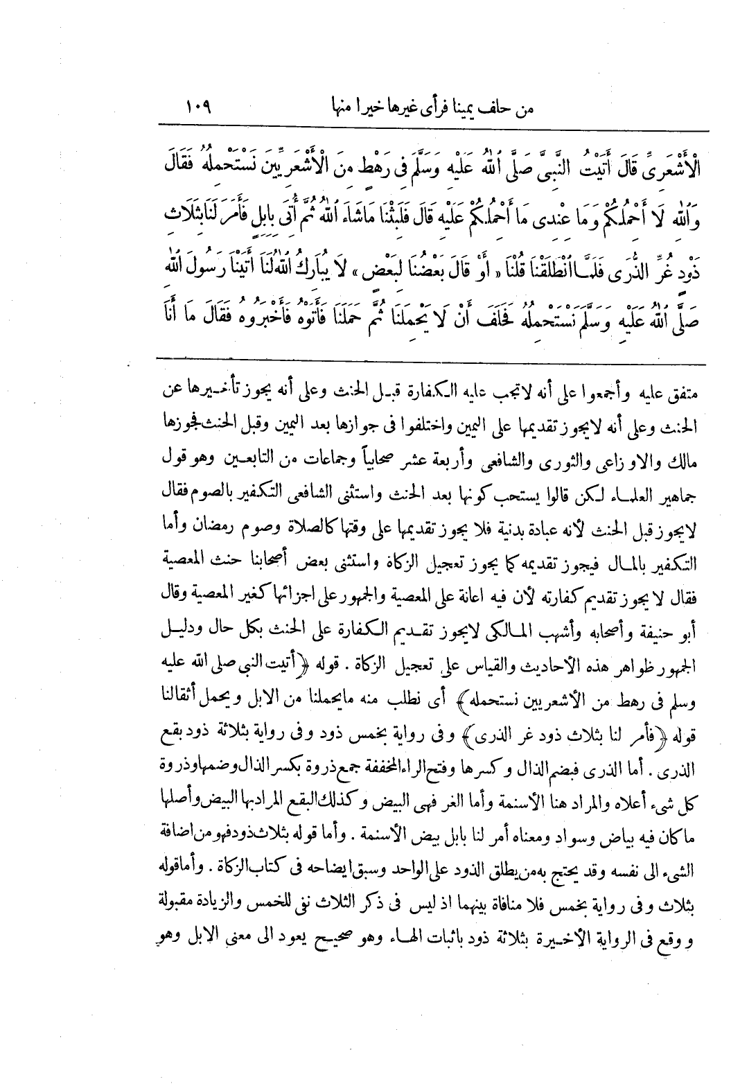مُتَّفَقٌ عَلَيْهِ وَأَجْمَعُوا عَلَى أَنَّهُ لَا تَجِبُ عَلَيْهِ الْكَفَّارَةُ قَبْلَ الْحِنْثِ وَعَلَى أَنَّهُ يَجُوزُ تَأْخِيرُهَا عَنِ الْحِنْثِ وَعَلَى أَنَّهُ لَا يَجُوزُ تَقْدِيمُهَا عَلَى الْيَمِينِ وَاخْتَلَفُوا فِي جَوَازِهَا بَعْدَ الْيَمِينِ وَقَبْلَ الْحِنْثِ فَجَوَّزَهَا مَالِكٌ وَالْأَوْزَاعِيُّ وَالثَّوْرِيُّ وَالشَّافِعِيُّ وَأَرْبَعَةَ عَشَرَ صَحَابِيًّا وَجَمَاعَاتٌ مِنَ التَّابِعِينَ وَهُوَ قَوْلُ جَمَاهِيرِ الْعُلَمَاءِ لَكِنْ قَالُوا يُسْتَحَبُّ كَوْنُهَا بَعْدَ الْحِنْثِ وَاسْتَثْنَى الشَّافِعِيُّ التَّكْفِيرَ بِالصَّوْمِ فَقَالَ لَا يَجُوزُ قَبْلَ الْحِنْثِ لِأَنَّهُ عِبَادَةٌ بَدَنِيَّةٌ فَلَا يَجُوزُ تَقْدِيمُهَا عَلَى وَقْتِهَا كَالصَّلَاةِ وَصَوْمِ رَمَضَانَ وَأَمَّا التَّكْفِيرُ بِالْمَالِ فَيَجُوزُ تَقْدِيمُهُ كَمَا يَجُوزُ تَعْجِيلُ الزَّكَاةِ وَاسْتَثْنَى بَعْضُ أَصْحَابِنَا حِنْثَ الْمَعْصِيَةِ فَقَالَ لَا يَجُوزُ تَقْدِيمُ كَفَّارَتِهِ لأن فيه إعانة علىالمعصية وَالْجُمْهُورُ عَلَى إِجْزَائِهَا كَغَيْرِ الْمَعْصِيَةِ وَقَالَ أَبُو حَنِيفَةَ وَأَصْحَابُهُ وَأَشْهَبُ الْمَالِكِيُّ لَا يَجُوزُ تَقْدِيمُ الْكَفَّارَةِ عَلَى الْحِنْثِ بِكُلِّ حَالٍ وَدَلِيلُ الْجُمْهُورِ ظَوَاهِرُ هَذِهِ الْأَحَادِيثِ وَالْقِيَاسُ عَلَى تَعْجِيلِ الزَّكَاةِ قَوْلُهُ (أَتَيْتُ النَّبِيَّ صَلَّى اللَّهُ عَلَيْهِ وَسَلَّمَ فِي رَهْطٍ مِنَ الْأَشْعَرِيِّينَ نَسْتَحْمِلُهُ) أَيْ نَطْلُبُ مِنْهُ مَا يَحْمِلُنَا مِنَ الْإِبِلِ وَيَحْمِلُ أَثْقَالَنَا قَوْلُهُ فَأَمَرَ لَنَا بِثَلَاثِ ذَوْدٍ غُرِّ الذُّرَى وَفِي رِوَايَةٍ بِخَمْسِ ذَوْدٍ وَفِي رِوَايَةٍ بِثَلَاثَةِ ذَوْدٍ بُقْعِ الذُّرَى أَمَّا الذُّرَى فَبِضَمِّ الذَّالِ وَكَسْرِهَا وَفَتْحِ الرَّاءِ الْمُخَفَّفَةِ جَمْعُ ذُرْوَةٍ بِكَسْرِ الذال وضمها وذروة كُلُّ شَيْءٍ أَعْلَاهُ وَالْمُرَادُ هُنَا الْأَسْنِمَةُ وَأَمَّا الْغُرُّ فَهِيَ الْبِيضُ وَكَذَلِكَ الْبُقْعُ الْمُرَادُ بِهَا الْبِيضُ وَأَصْلُهَا مَا كَانَ فِيهِ بَيَاضٌ وَسَوَادٌ وَمَعْنَاهُ أَمَرَ لَنَا بِإِبِلٍ بِيضِ الْأَسْنِمَةِ وَأَمَّا قوله بثلاث ذود فهو من إضافة الشئ إِلَى نَفْسِهِ وَقَدْ يَحْتَجُّ بِهِ مَنْ يُطْلِقُ الذَّوْدَ عَلَى الْوَاحِدِ وَسَبَقَ إِيضَاحُهُ فِي كِتَابِ الزَّكَاةِ وَأَمَّا قَوْلُهُ بِثَلَاثِ وَفِي رِوَايَةٍ بِخَمْسِ فَلَا مُنَافَاةَ بَيْنَهُمَا إِذْ لَيْسَ فِي ذِكْرِ الثَّلَاثِ نَفْيٌ لِلْخَمْسِ وَالزِّيَادَةُ مَقْبُولَةٌ وَوَقَعَ فِي الرِّوَايَةِ الْأَخِيرَةِ بِثَلَاثَةِ ذَوْدٍ بِإِثْبَاتِ الْهَاءِ وَهُوَ صحيح يعود إلى معنى الإبل وهو