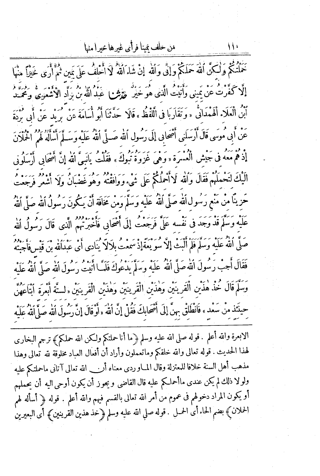إلا بعرة وَاللَّهُ أَعْلَمُ قَوْلُهُ صَلَّى اللَّهُ عَلَيْهِ وَسَلَّمَ (مَا أَنَا حَمَلْتُكُمْ وَلَكِنَّ اللَّهَ حَمَلَكُمْ) تَرْجَمَ الْبُخَارِيُّ لِهَذَا الْحَدِيثِ قَوْلُهُ تَعَالَى وَاللَّهُ خَلَقَكُمْ وما تعملون وَأَرَادَ أَنَّ أَفْعَالَ الْعِبَادِ مَخْلُوقَةٌ لِلَّهِ تَعَالَى وَهَذَا مَذْهَبُ أَهْلِ السُّنَّةِ خِلَافًا لِلْمُعْتَزِلَةِ وَقَالَ الْمَاوَرْدِيُّ مَعْنَاهُ أَنَّ اللَّهَ تَعَالَى آتَانِي مَا حَمَلْتُكُمْ عَلَيْهِ وَلَوْلَا ذَلِكَ لَمْ يَكُنْ عِنْدِي مَا أَحْمِلُكُمْ عَلَيْهِ قَالَ الْقَاضِي وَيَجُوزُ أَنْ يَكُونَ أَوْحَيَ إِلَيْهِ أَنْ يَحْمِلَهُمْ أَوْ يَكُونُ المراد دخولهم في عموم مِنْ أَمْرِ اللَّهِ تَعَالَى بِالْقَسْمِ فِيهِمْ وَاللَّهُ أَعْلَمُ قَوْلُهُ (أَسْأَلُهُ لَهُمُ الْحُمْلَانَ) بِضَمِّ الْحَاءِ أَيْ الْحَمْلُ قَوْلُهُ صَلَّى اللَّهُ عَلَيْهِ وَسَلَّمَ (خُذْ هَذَيْنِ الْقَرِينَيْنِ) أَيْ الْبَعِيرَيْنِ